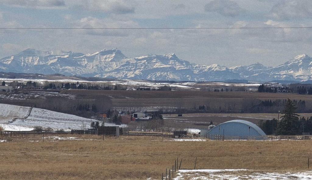 50 Acres with Panoramic Mountain Views at Symons Valley and Big Springs Road Intersection. First time offered!! 50 acre opportunity property located at intersection of Symons Valley Road and HWY 567 (Big Hill Springs Road), straight west of Airdrie. Unbeatable mountain views, slightly rolling terrain, and convenience of paved road to the driveway. 1040 sq.ft. , 2 bedroom, 2 bathroom, fully serviced Modular home on site (could be sold and moved, with new home built to replace it). 105′ x 35′ 3-section shop plus another 23′ x 38′ storage building. Fenced and cross-fenced.. Approximately 15 minutes to Airdrie, 10 minutes to North Calgary, and 25 minutes to Calgary International Airport. Site is zoned A-SML,, but location would suggest future property development opportunities, with existing road easement to Symons Valley Road. Approximately 4-acre lease generates $4,500/year revenue for the property. Planted grazing lands are organic, with no applied chemicals for past 20 years. Multiple walk-out building sites with unrestricted mountain views Available with short notice!