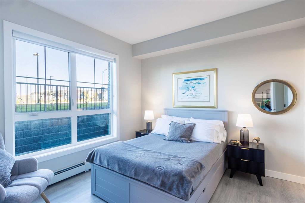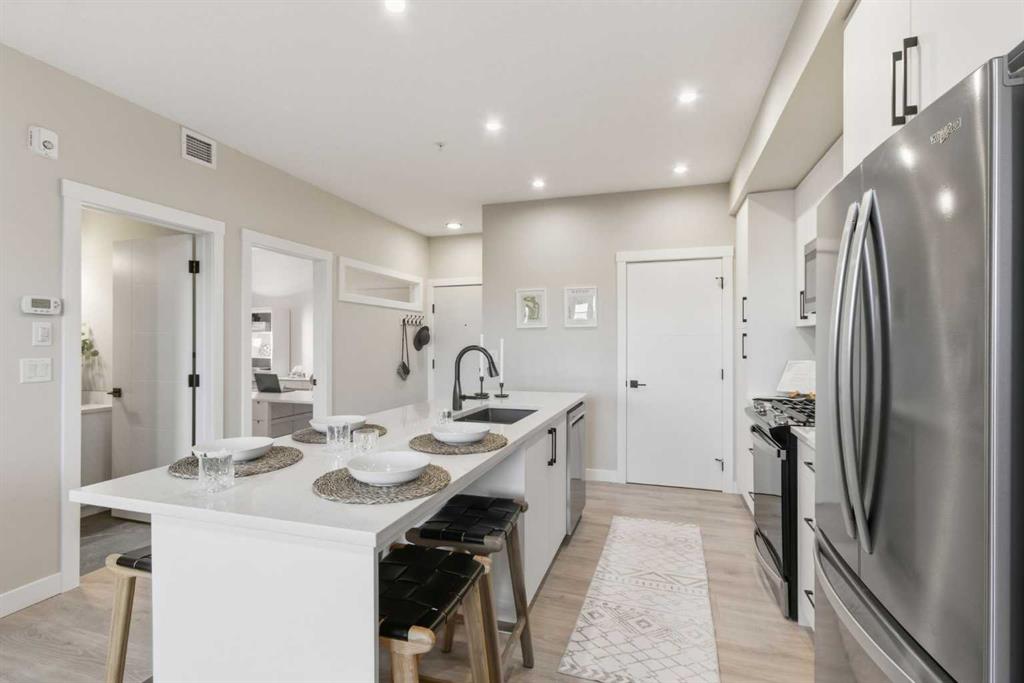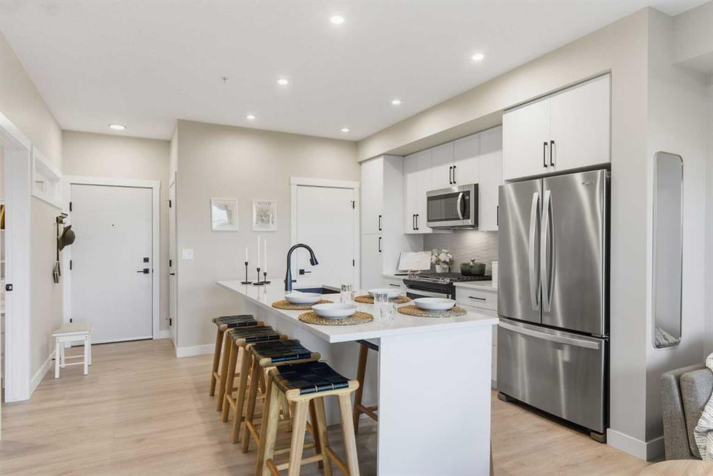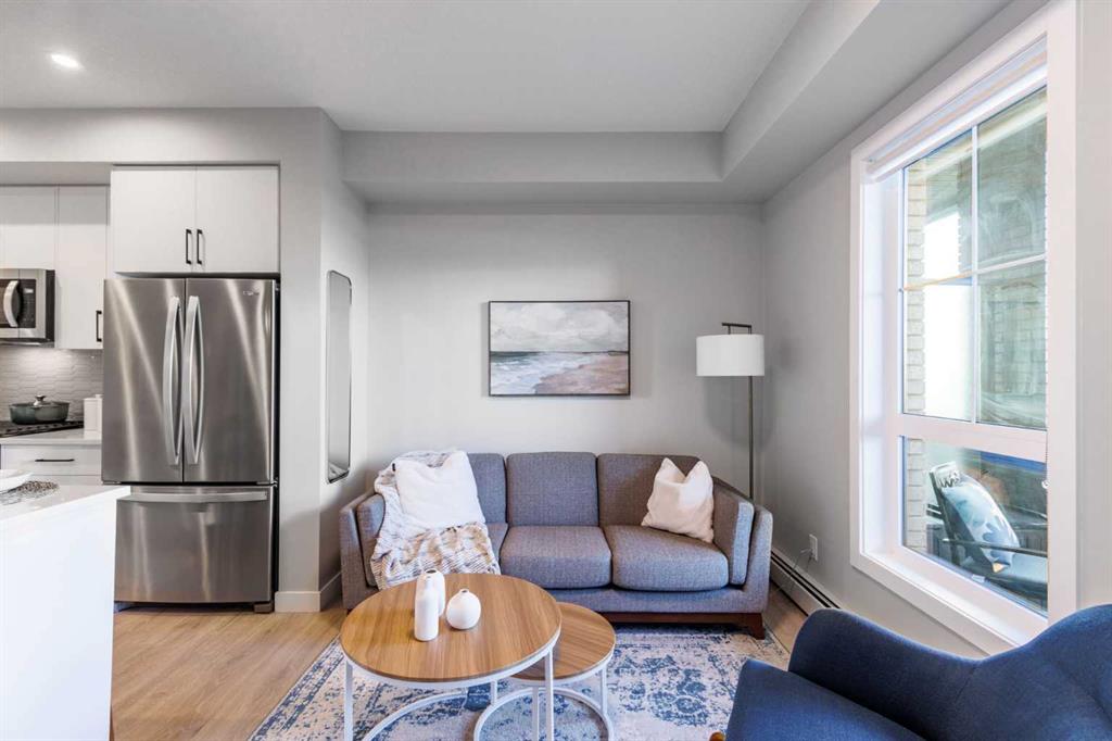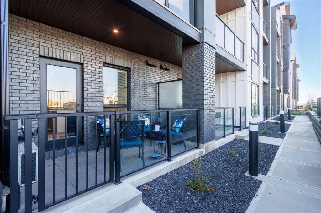 Better Than New – Walkout Patio and $21,000+ in Upgrades! Welcome to Lawrie Park, where modern living meets small-town charm in the heart of Okotoks. This beautifully upgraded 2-bedroom, 2-bathroom condo offers 691 sq. ft. of thoughtfully designed living space (744 sq. ft. builder size) and is move-in ready. Partners Homes’ most popular model has sold out in Buildings 1000, 2000, and 3000, and while Building 4000 is under construction with more of this plan, those won’t be available until mid-2026 and won’t have outside ground access. Why wait when you can move in now and enjoy an exclusive walkout patio with direct outdoor access, something none of the Building 4000 units will have. Inside, you’ll appreciate the attention to detail and quality craftsmanship that Partners Homes is known for. The bright, open-concept design features 9-ft ceilings, large windows, and a clean, modern aesthetic. The white kitchen includes over $21,000 in upgrades such as a gas stove, upgraded quartz island with built-in dining space, extra kitchen drawers for storage, upgraded lighting, and durable Luxury Vinyl Plank flooring throughout. The living area opens directly to your private patio—perfect for morning coffee or evening relaxation. The spacious primary suite features a walk-in shower ensuite and generous closet space, while the second bedroom is ideal for guests, a home office, or hobby room. You’ll also enjoy air conditioning, in-suite laundry, a heated underground parking stall, and a storage locker. Lawrie Park offers a true sense of community with basketball courts, gardens, and gathering spaces. The Wedderburn neighbourhood includes walking paths, a pond, playground, off leash dog park and easy access to D’Arcy Crossing with Safeway, Starbucks, and Shoppers. Only 15 minutes to Calgary, you’ll love the blend of convenience and charm. Don’t wait until 2026—this home offers new construction quality, pet-friendly living, and immediate possession. Move in and enjoy everything Lawrie Park has to offer!