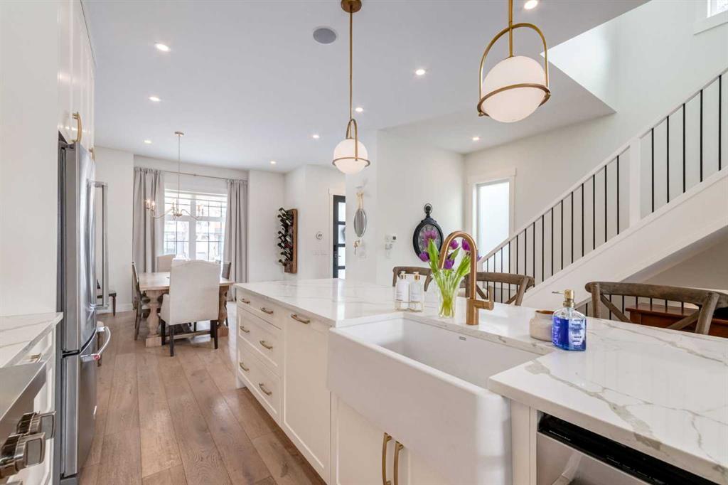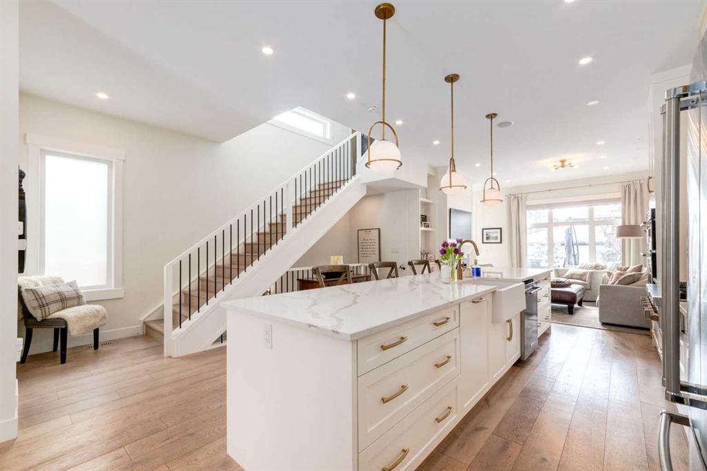 Not your average semi-detached home, but rather luxury living at its finest in the highly sought-after community of North Glenmore Park. This exceptional custom infill offers almost 3,000 sq ft of beautifully finished space with a modern farmhouse exterior, striking black mullioned windows, and professionally landscaped front and back yards designed for seamless indoor-outdoor living.