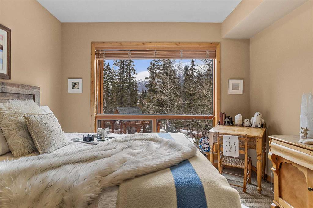 Nestled in the prestigious Moraine Ridge at Spring Creek, this exceptional and spacious 2-bedroom + den, 2-bath residence captures unobstructed mountain views across the landscaped courtyard, Policeman’s Creek, and the municipal reserve. The open-concept layout seamlessly connects the kitchen, dining, and living areas, flowing onto a private deck to take in the alpine scenery. Brazilian hardwood floors, fresh paint, and a striking river rock fireplace create warm mountain character. The modern kitchen offers stainless steel appliances and generous workspace. Thoughtfully designed, the floorplan provides excellent separation between bedrooms and a spacious, functional office. Bathrooms feature natural stone and a spa-inspired feel. Additional highlights include air conditioning, one heated underground parking stall, and a storage locker. Located in a 40+ building (no short-term rentals) just steps to shops, dining, and trails — refined, peaceful living in the heart of Canmore.