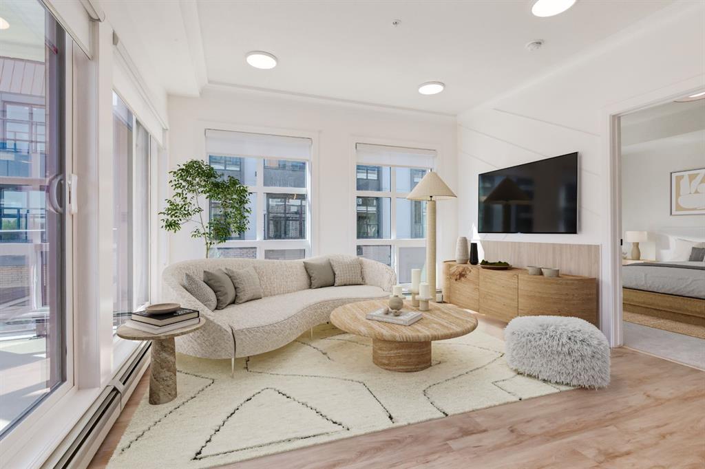 This beautifully crafted condo offers in-suite laundry, a private balcony, and A/C rough-in for year-round comfort. A titled underground parking stall ensures security and convenience.