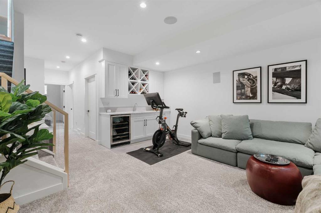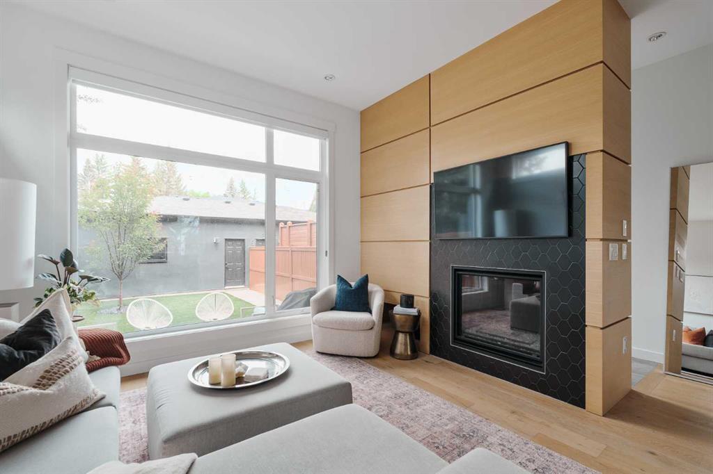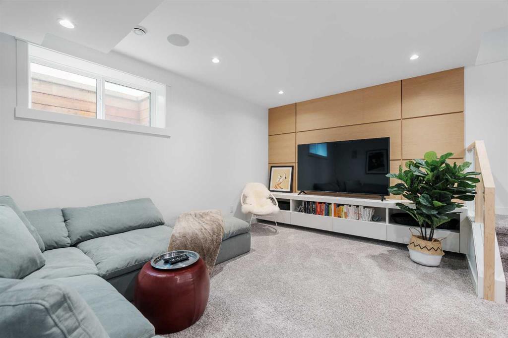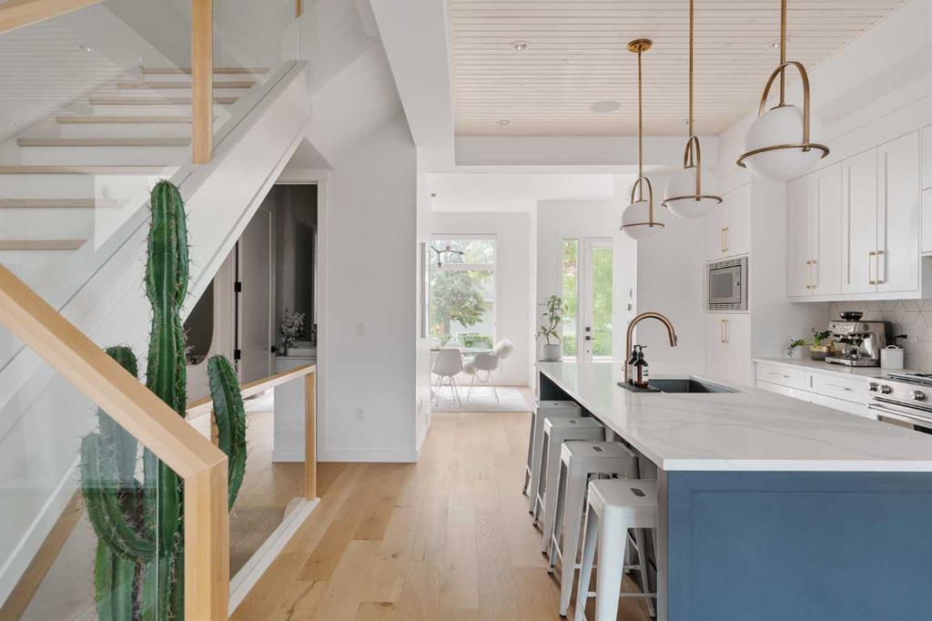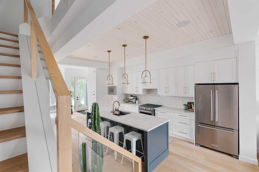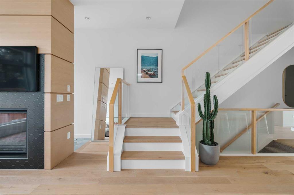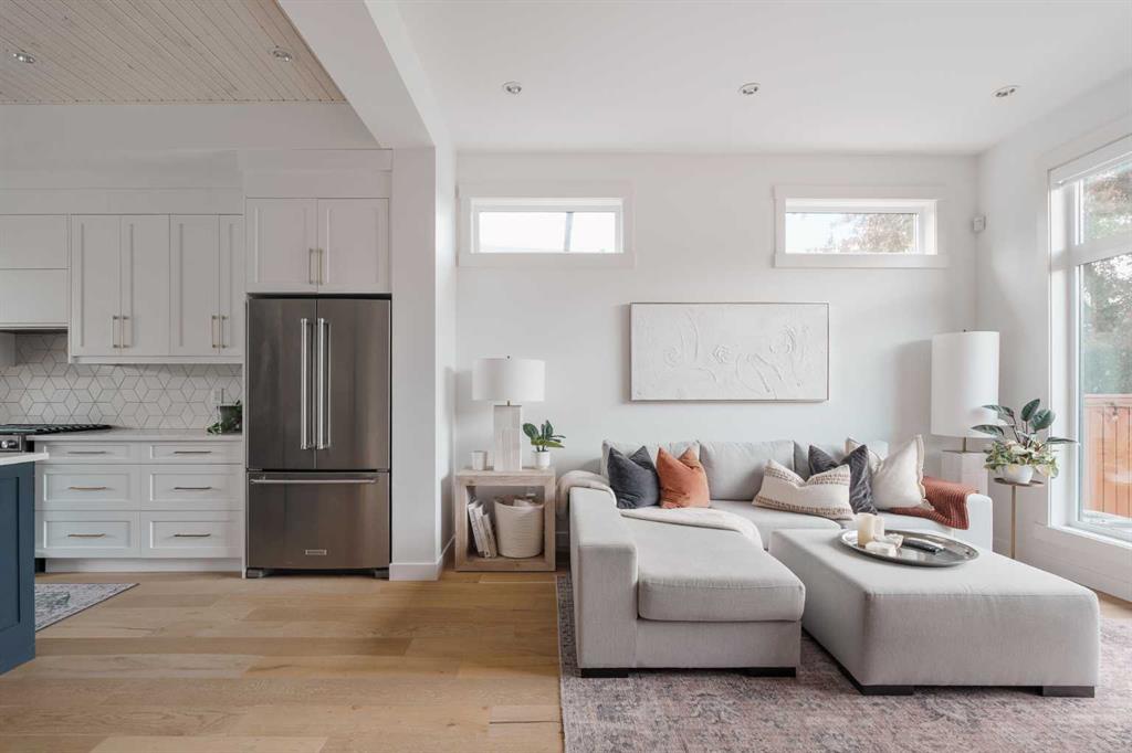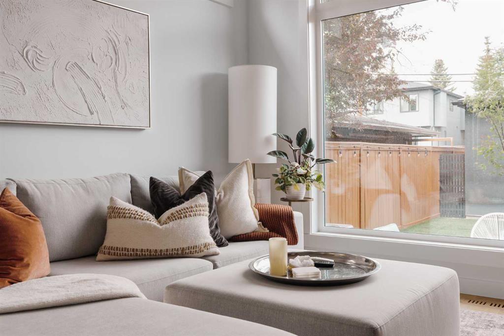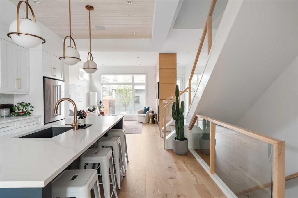 From the moment you step inside, this beautifully appointed and impeccably finished semi-detached home offers an elevated sense of style, comfort, and understated luxury, with beautiful natural light that pours through the open-concept main floor and Hunter Douglas blinds throughout. Just off the front entry is the formal dining room, offering a refined space for hosting and everyday gathering alike. From there, the main floor unfolds into a stunning central kitchen, thoughtfully designed to balance beauty and practicality. Crisp white cabinetry is paired with quartz countertops, striking geometric backsplash, and stainless-steel appliances including a gas range, while the large centre island with seating creates an inviting focal point for casual dining, conversation, and culinary creativity. An upgraded wood plank ceiling detail adds architectural interest, and pendant lighting paired with recessed lighting brings a polished, elevated finish to the space. At the rear of the home, the living room feels both inviting and sophisticated, centred around a gas fireplace and panelled feature wall, with views extending into the backyard. Near the back entry, a built-in bench with hooks creates a stylish everyday drop zone. An elegant staircase with glass and wood railings draws the eye upward, and as you ascend, you’ll discover a full bath, and three bedrooms with hardwood flooring throughout. The primary suite is a true retreat, beautifully appointed with a vaulted ceiling, a spacious walk-in closet with custom organizers, and a beautifully curated ensuite hidden behind a barn door. Finished with patterned tile floors, a freestanding soaker tub, heated floors, a glass-enclosed walk-in shower, and a skylight, the space feels both serene and beautifully elevated. Hunter Douglas blinds continue on this level, including blackout blinds, add comfort and quality throughout the upper level. The fully developed basement offers exceptional additional living space, anchored by a spacious rec room with upgraded built-ins and a beautifully enhanced wet bar area, perfectly suited to entertaining or unwinding at the end of the day. A fourth bedroom, a full bathroom, and ample storage complete this lower level with both style and practicality. Outside, the backyard has been thoughtfully upgraded with premium artificial turf, creating a polished, low-maintenance outdoor setting, while the insulated garage adds further convenience. Additional upgrades include central air conditioning, a new roof (2024), a new hot water tank (2025), repainted fence and front shingles, dimmers throughout, HRV, and roughed-in speakers. Tucked into the heart of North Glenmore Park, the home enjoys a wealth of nearby recreation and proximity to schools. Close to the Glenmore Athletic Park, Lakeview and Earl Grey Golf course, reservoir pathways and Weaselhead Flats.