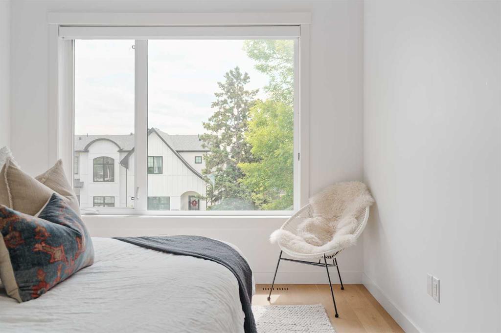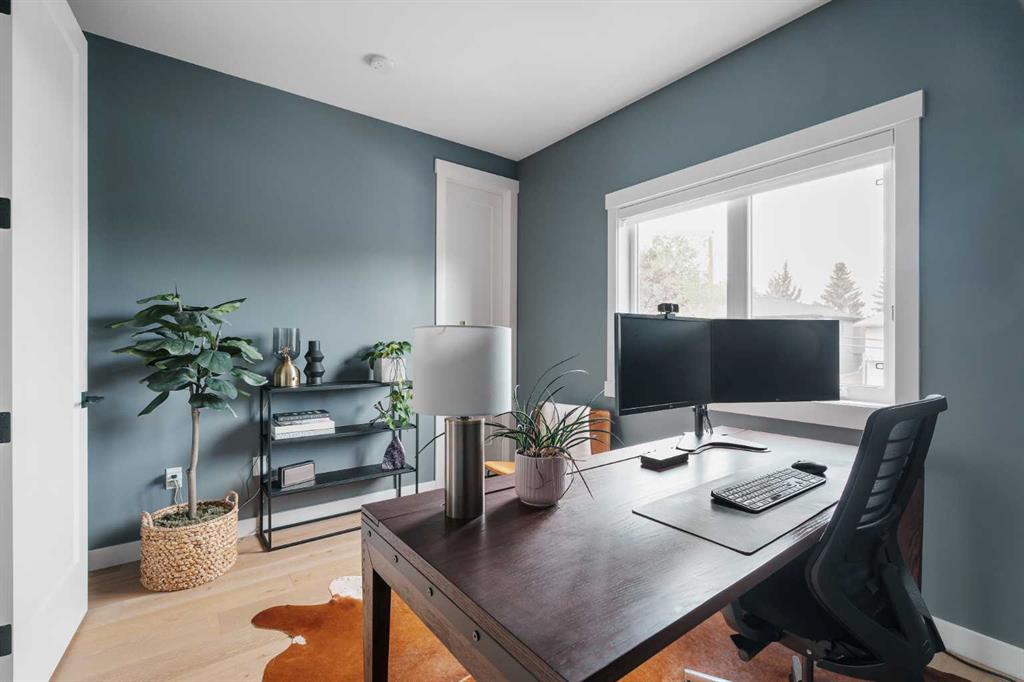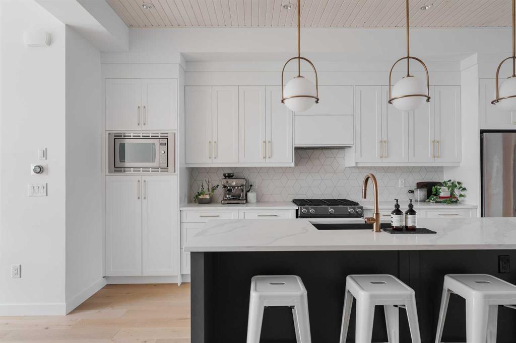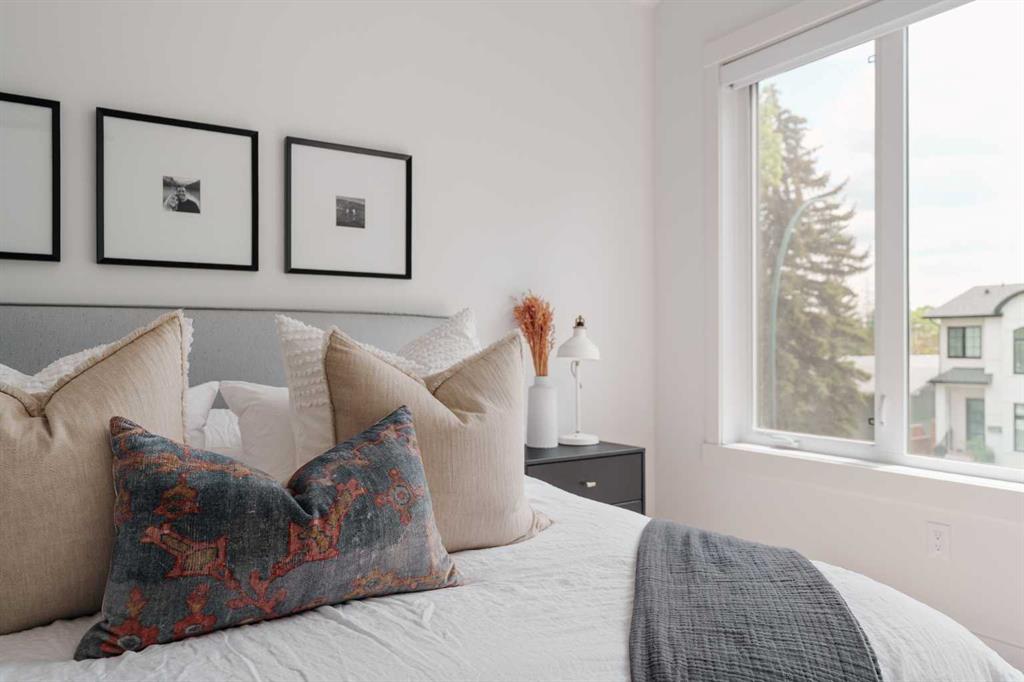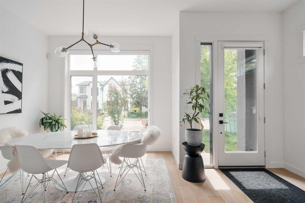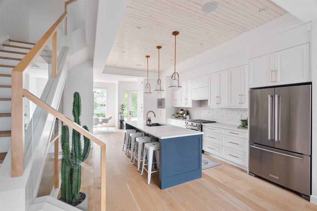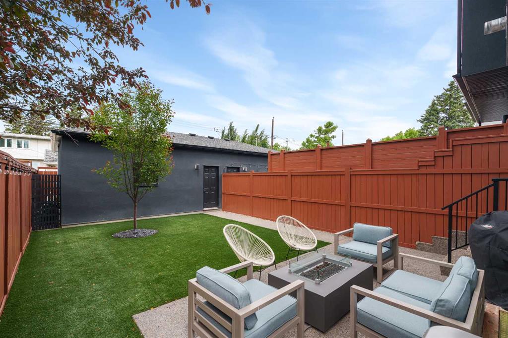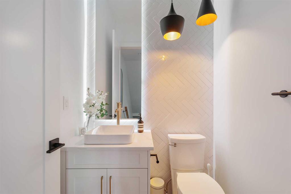 From the moment you step inside, this beautifully appointed and impeccably finished semi-detached home offers an elevated sense of style, comfort, and understated luxury, with beautiful natural light that pours through the open-concept main floor and Hunter Douglas blinds throughout. Just off the front entry is the formal dining room, offering a refined space for hosting and everyday gathering alike. From there, the main floor unfolds into a stunning central kitchen, thoughtfully designed to balance beauty and practicality. Crisp white cabinetry is paired with quartz countertops, striking geometric backsplash, and stainless-steel appliances including a gas range, while the large centre island with seating creates an inviting focal point for casual dining, conversation, and culinary creativity. An upgraded wood plank ceiling detail adds architectural interest, and pendant lighting paired with recessed lighting brings a polished, elevated finish to the space. At the rear of the home, the living room feels both inviting and sophisticated, centred around a gas fireplace and panelled feature wall, with views extending into the backyard. Near the back entry, a built-in bench with hooks creates a stylish everyday drop zone. An elegant staircase with glass and wood railings draws the eye upward, and as you ascend, you’ll discover a full bath, and three bedrooms with hardwood flooring throughout. The primary suite is a true retreat, beautifully appointed with a vaulted ceiling, a spacious walk-in closet with custom organizers, and a beautifully curated ensuite hidden behind a barn door. Finished with patterned tile floors, a freestanding soaker tub, heated floors, a glass-enclosed walk-in shower, and a skylight, the space feels both serene and beautifully elevated. Hunter Douglas blinds continue on this level, including blackout blinds, add comfort and quality throughout the upper level. The fully developed basement offers exceptional additional living space, anchored by a spacious rec room with upgraded built-ins and a beautifully enhanced wet bar area, perfectly suited to entertaining or unwinding at the end of the day. A fourth bedroom, a full bathroom, and ample storage complete this lower level with both style and practicality. Outside, the backyard has been thoughtfully upgraded with premium artificial turf, creating a polished, low-maintenance outdoor setting, while the insulated garage adds further convenience. Additional upgrades include central air conditioning, a new roof (2024), a new hot water tank (2025), repainted fence and front shingles, dimmers throughout, HRV, and roughed-in speakers. Tucked into the heart of North Glenmore Park, the home enjoys a wealth of nearby recreation and proximity to schools. Close to the Glenmore Athletic Park, Lakeview and Earl Grey Golf course, reservoir pathways and Weaselhead Flats.