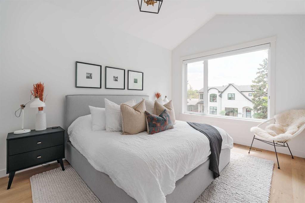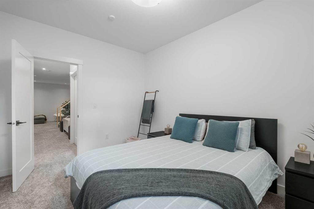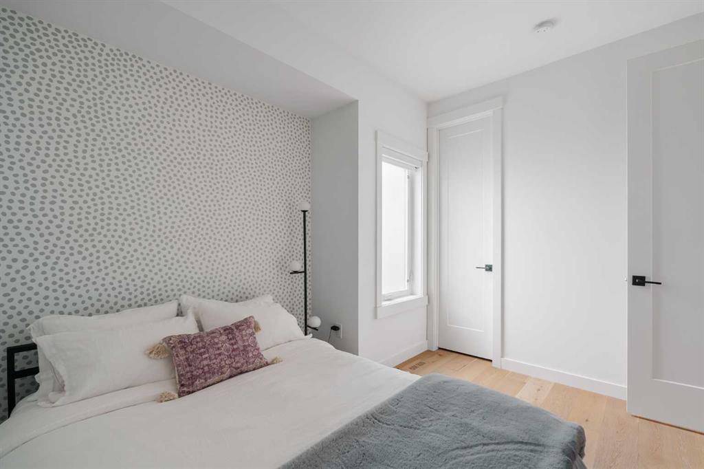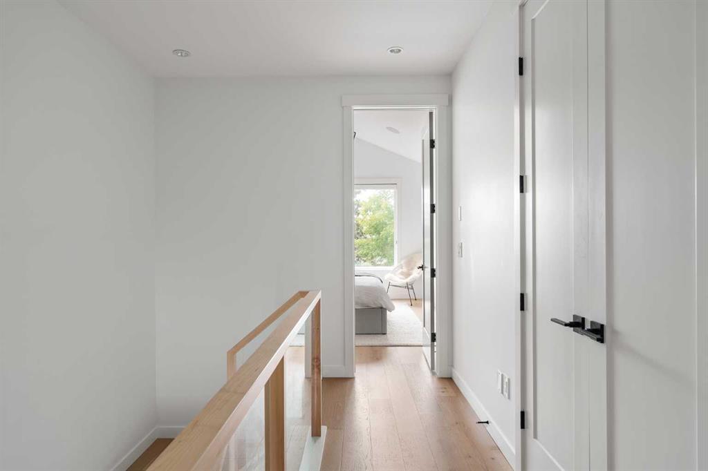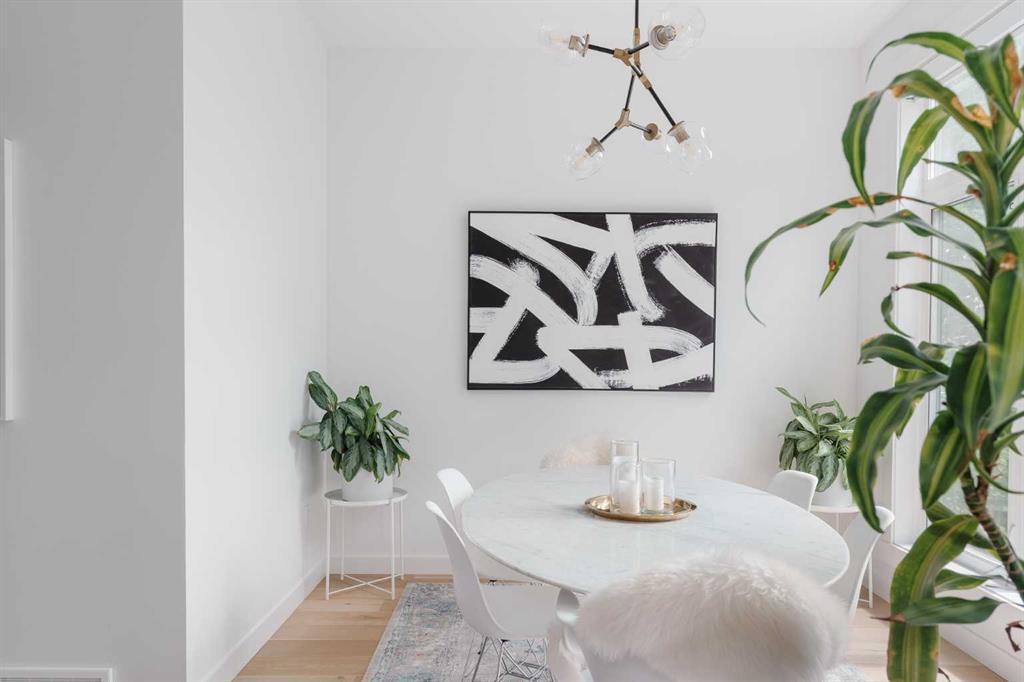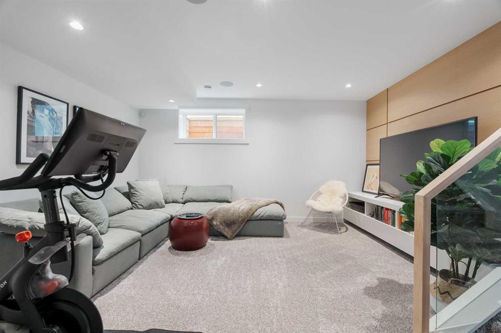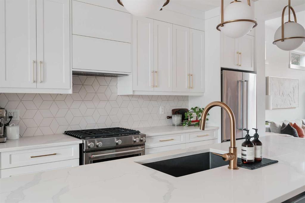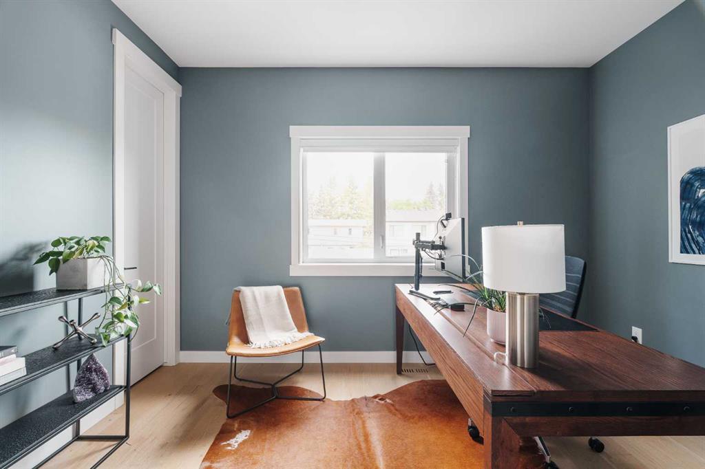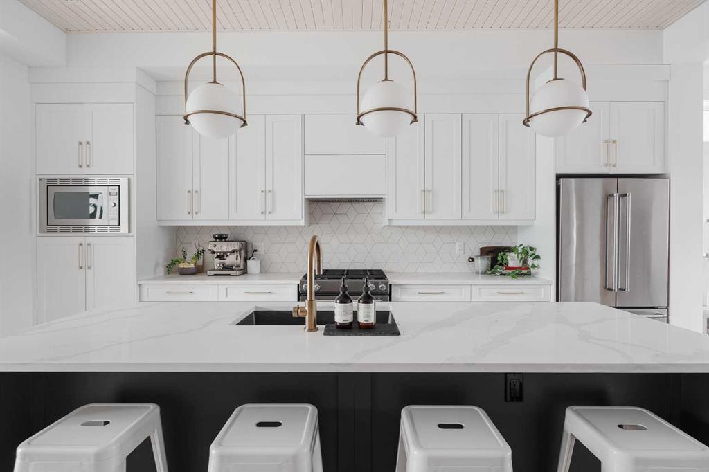 From the moment you step inside, this beautifully appointed and impeccably finished semi-detached home offers an elevated sense of style, comfort, and understated luxury, with beautiful natural light that pours through the open-concept main floor and Hunter Douglas blinds throughout. Just off the front entry is the formal dining room, offering a refined space for hosting and everyday gathering alike. From there, the main floor unfolds into a stunning central kitchen, thoughtfully designed to balance beauty and practicality. Crisp white cabinetry is paired with quartz countertops, striking geometric backsplash, and stainless-steel appliances including a gas range, while the large centre island with seating creates an inviting focal point for casual dining, conversation, and culinary creativity. An upgraded wood plank ceiling detail adds architectural interest, and pendant lighting paired with recessed lighting brings a polished, elevated finish to the space. At the rear of the home, the living room feels both inviting and sophisticated, centred around a gas fireplace and panelled feature wall, with views extending into the backyard. Near the back entry, a built-in bench with hooks creates a stylish everyday drop zone. An elegant staircase with glass and wood railings draws the eye upward, and as you ascend, you’ll discover a full bath, and three bedrooms with hardwood flooring throughout. The primary suite is a true retreat, beautifully appointed with a vaulted ceiling, a spacious walk-in closet with custom organizers, and a beautifully curated ensuite hidden behind a barn door. Finished with patterned tile floors, a freestanding soaker tub, heated floors, a glass-enclosed walk-in shower, and a skylight, the space feels both serene and beautifully elevated. Hunter Douglas blinds continue on this level, including blackout blinds, add comfort and quality throughout the upper level. The fully developed basement offers exceptional additional living space, anchored by a spacious rec room with upgraded built-ins and a beautifully enhanced wet bar area, perfectly suited to entertaining or unwinding at the end of the day. A fourth bedroom, a full bathroom, and ample storage complete this lower level with both style and practicality. Outside, the backyard has been thoughtfully upgraded with premium artificial turf, creating a polished, low-maintenance outdoor setting, while the insulated garage adds further convenience. Additional upgrades include central air conditioning, a new roof (2024), a new hot water tank (2025), repainted fence and front shingles, dimmers throughout, HRV, and roughed-in speakers. Tucked into the heart of North Glenmore Park, the home enjoys a wealth of nearby recreation and proximity to schools. Close to the Glenmore Athletic Park, Lakeview and Earl Grey Golf course, reservoir pathways and Weaselhead Flats.