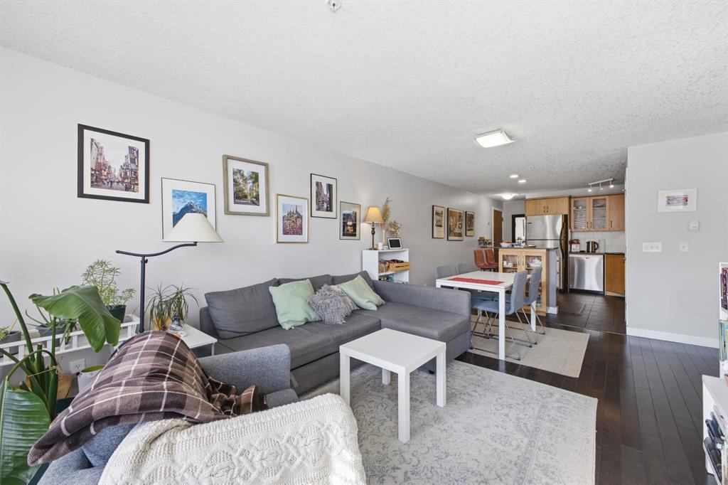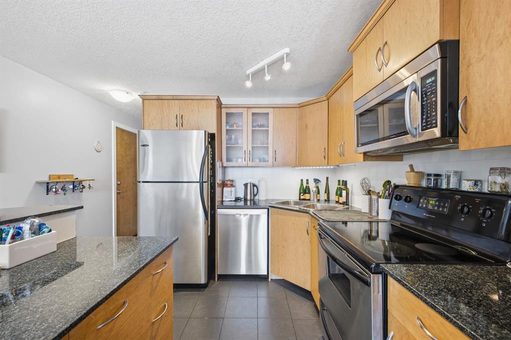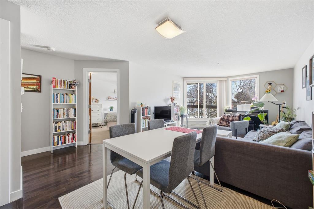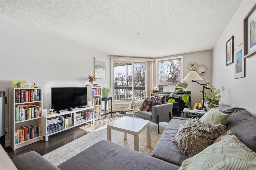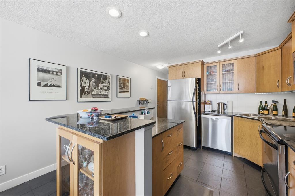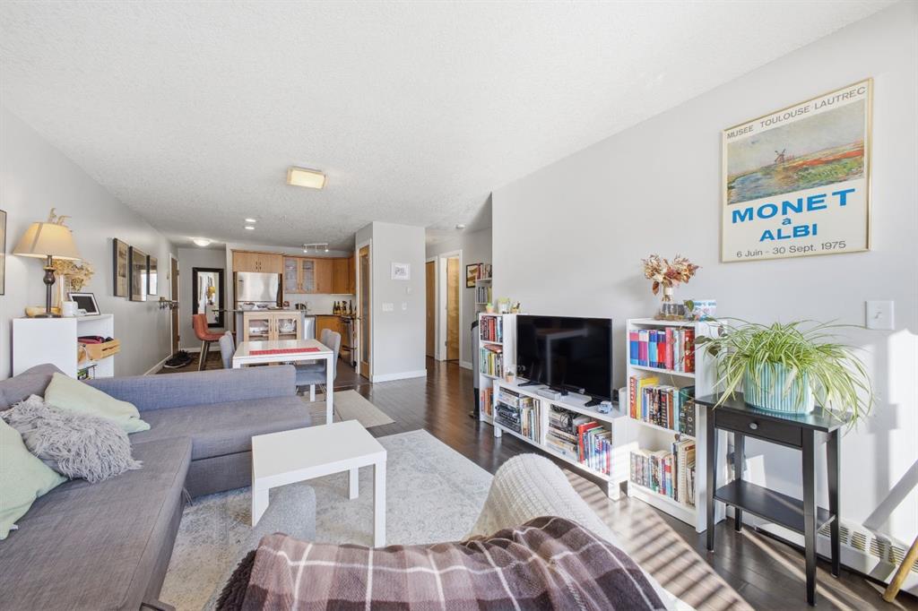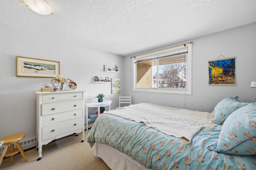Charming 2-bedroom end-unit condo with a sunny south-facing balcony, perfectly positioned in the heart of Mission. This inviting home features an open layout with hardwood and tile flooring, a well-appointed kitchen with granite countertops, an island with seating, stainless steel appliances, a pantry, and a comfortable dining area. The spacious living room opens directly onto the balcony, creating an effortless indoor–outdoor connection. Both bedrooms offer generous closet space, and the updated 4-piece bathroom adds a fresh, modern touch. Additional conveniences include in-suite laundry, a titled parking stall, an assigned storage locker, and the value of all utilities included in the condo fee. The location is exceptional—just steps to the vibrant shops, restaurants, cafés, and pubs along 17th Avenue and 4th Street, with easy access to public transit, the MNP Community & Sport Centre, Stampede Park, and the scenic river pathways.