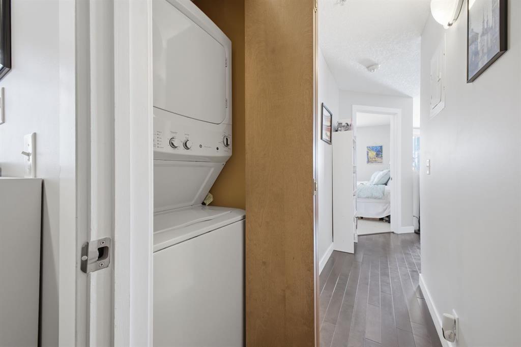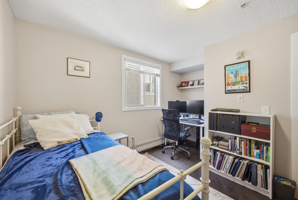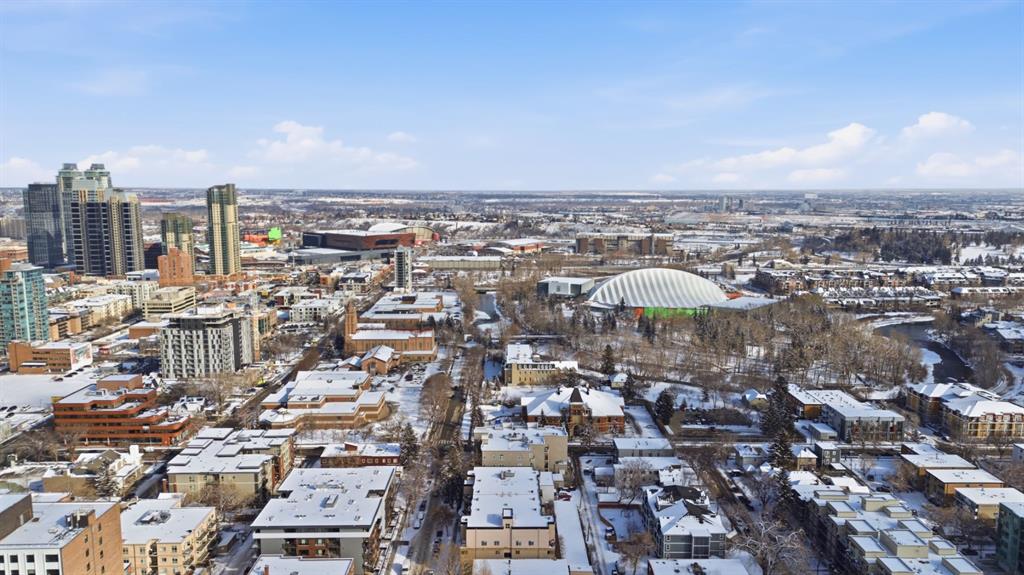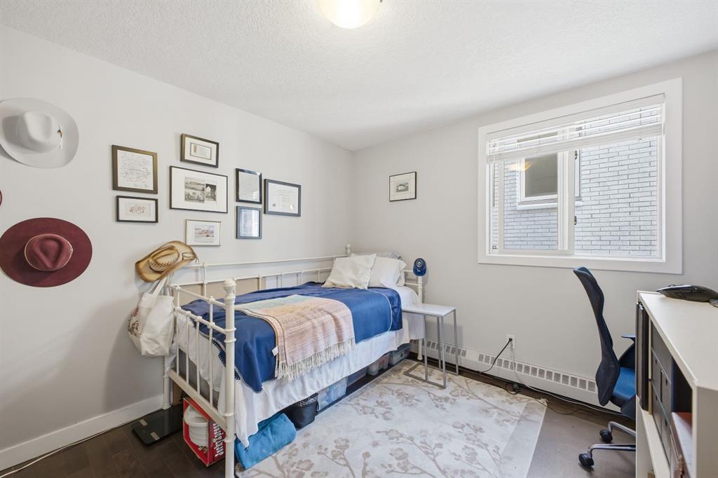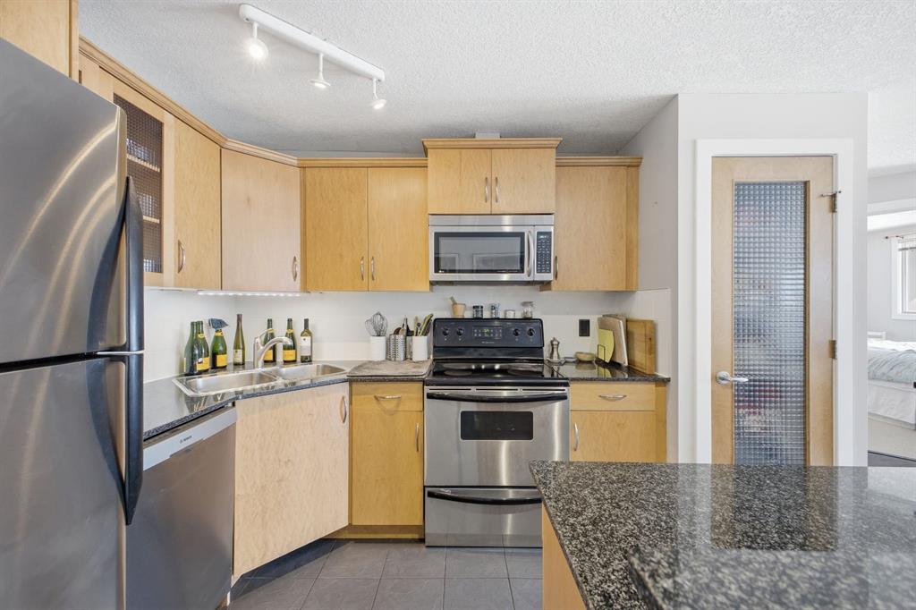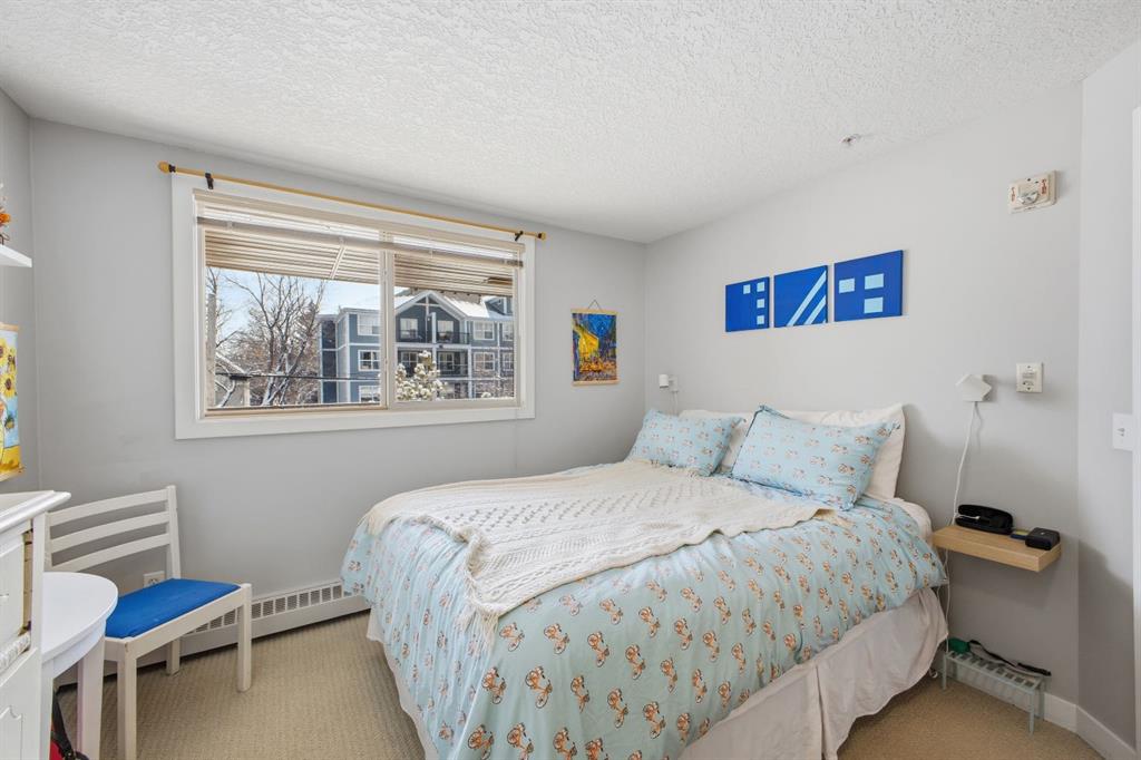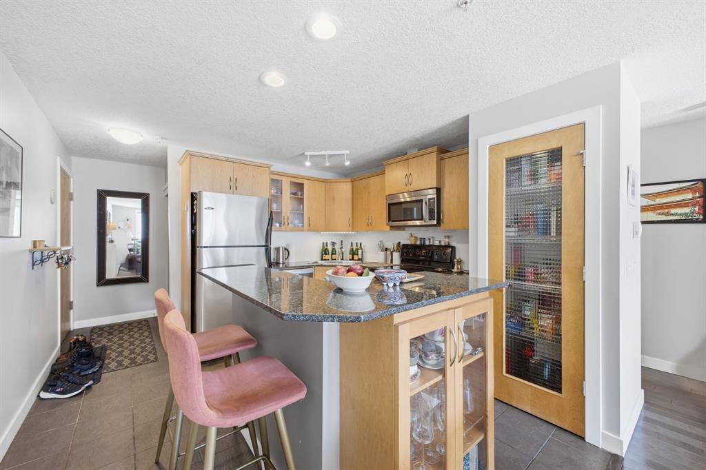 Charming 2-bedroom end-unit condo with a sunny south-facing balcony, perfectly positioned in the heart of Mission. This inviting home features an open layout with hardwood and tile flooring, a well-appointed kitchen with granite countertops, an island with seating, stainless steel appliances, a pantry, and a comfortable dining area. The spacious living room opens directly onto the balcony, creating an effortless indoor–outdoor connection. Both bedrooms offer generous closet space, and the updated 4-piece bathroom adds a fresh, modern touch. Additional conveniences include in-suite laundry, a titled parking stall, an assigned storage locker, and the value of all utilities included in the condo fee. The location is exceptional—just steps to the vibrant shops, restaurants, cafés, and pubs along 17th Avenue and 4th Street, with easy access to public transit, the MNP Community & Sport Centre, Stampede Park, and the scenic river pathways.