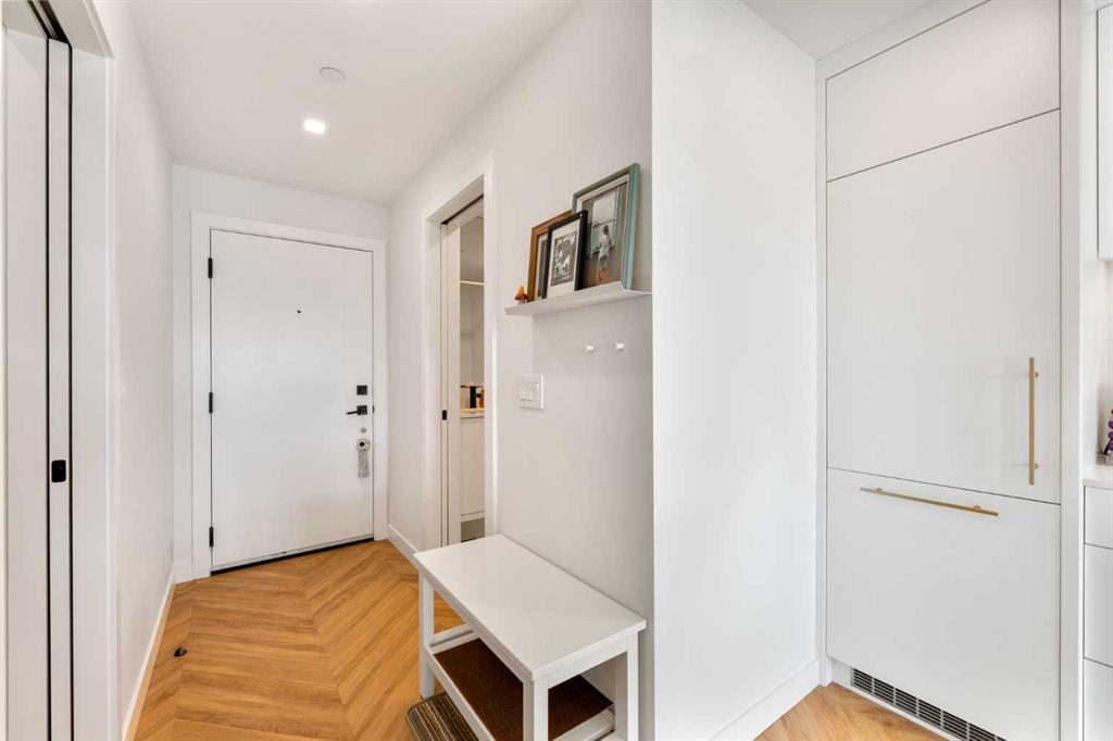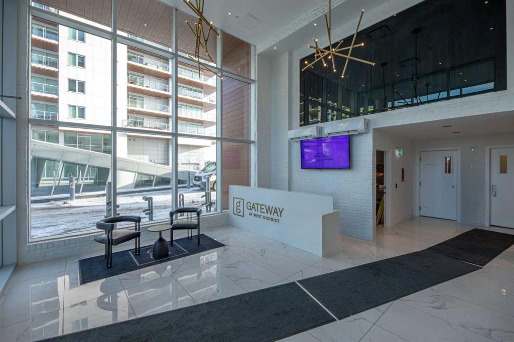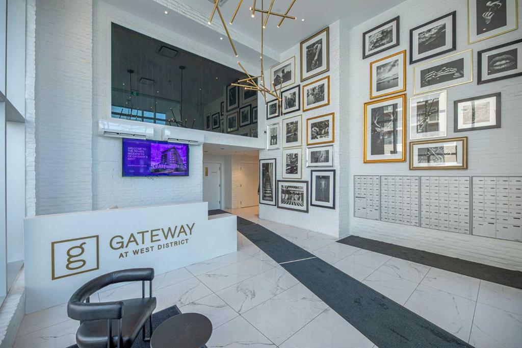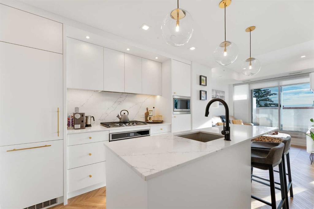 Welcome to the beautiful West! This two-bedroom, two-bathroom residence, situated in the heart of a master planned community, boasts desirable south exposure and southwest mountain views. This quiet, concrete building offers a chic aesthetic with high-end finishes, including air conditioning, luxury wide flooring (no carpets), and elegant penny round mosaic tiles in all baths. Enjoy bright and functional living with pot lights, 9-foot painted ceilings, and a luxurious white kitchen featuring brushed gold hardware, a high-end gas cooktop, wall oven, an integrated 36″ Fisher & Paykel fridge, panelled dishwasher, and soft-close custom cabinetry with under-cabinet lighting. Quartz countertops and backsplash add a touch of sophistication. Downstairs, vibrant shopping, dining, fitness centres, and everyday amenities are at your doorstep. Radio Park is nearby, and you are close to schools, transit, and all amenities, with a quick connection to Stoney Trail for heading out to the mountains. The building is impeccably maintained and includes underground parking, a dedicated storage unit, bicycle storage, concierge service during the day, and underground visitor parking.