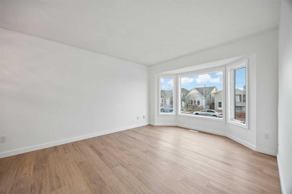 Enjoy a bright, open-concept main level featuring a spacious living room with large bay windows, a sleek kitchen with stainless steel appliances, quartz countertops, and white cabinetry, plus upper laundry and a hidden storage area. Two generous bedrooms and a beautifully updated 4-piece bath complete the main floor.