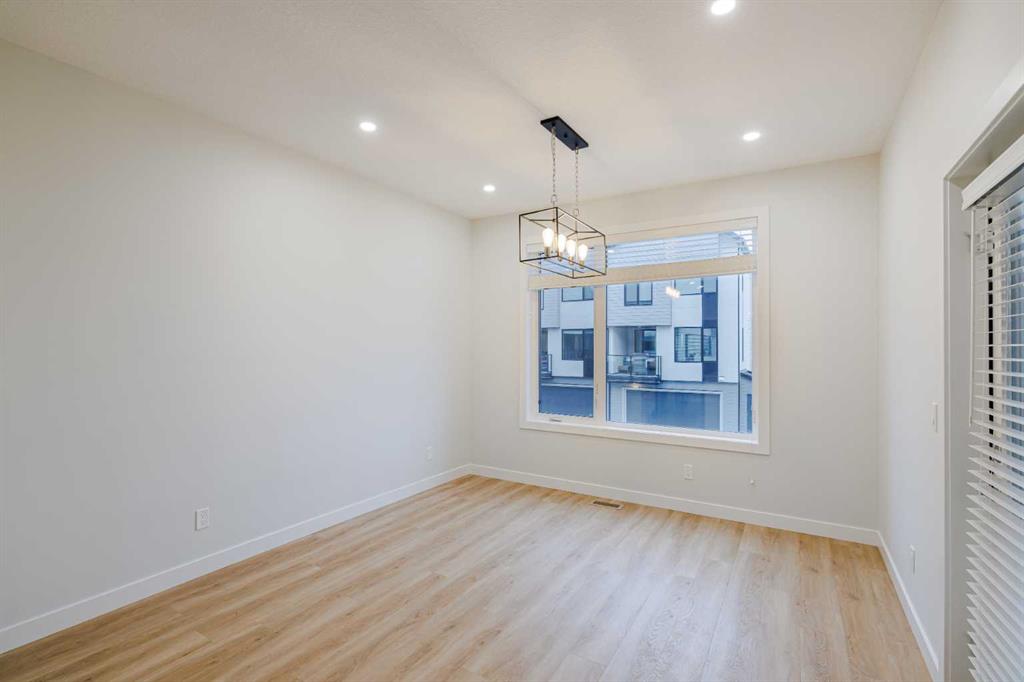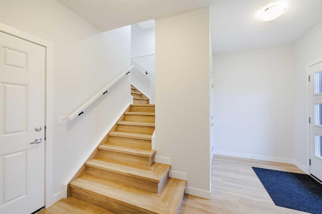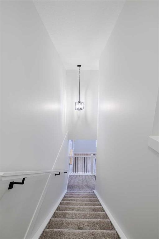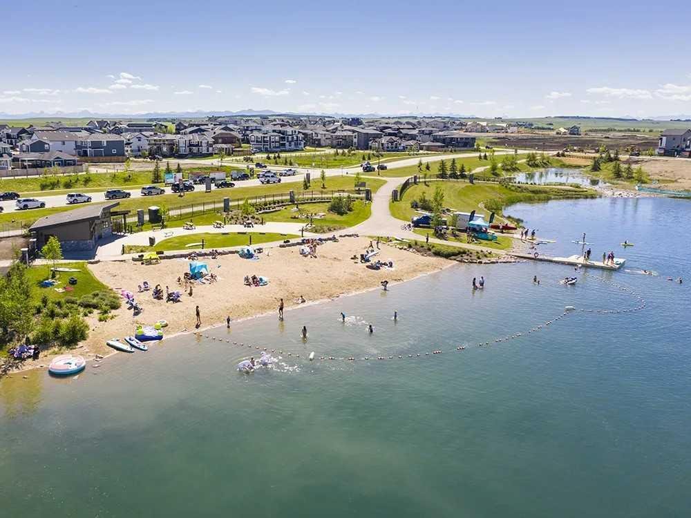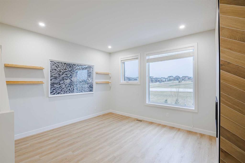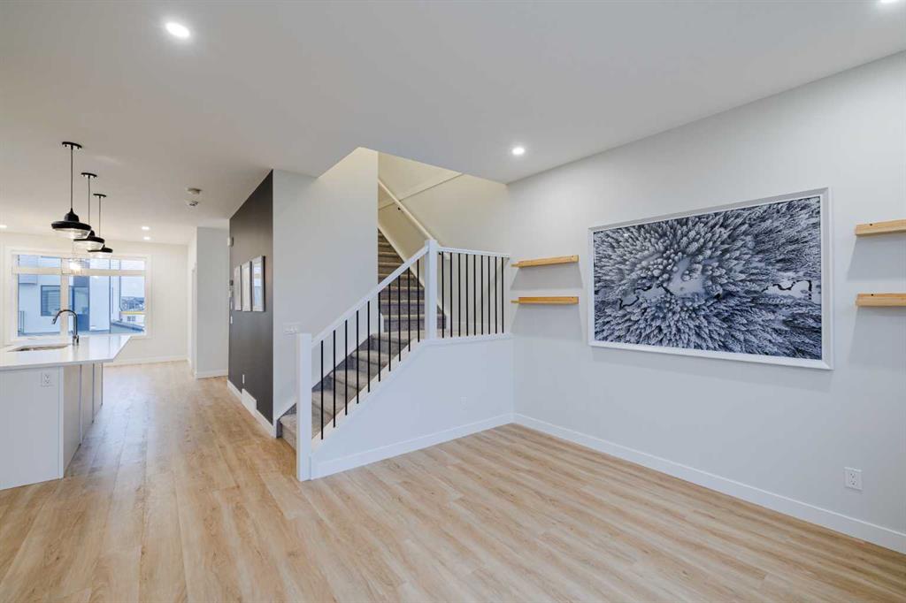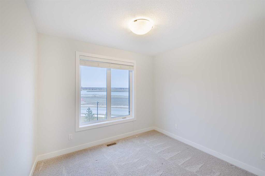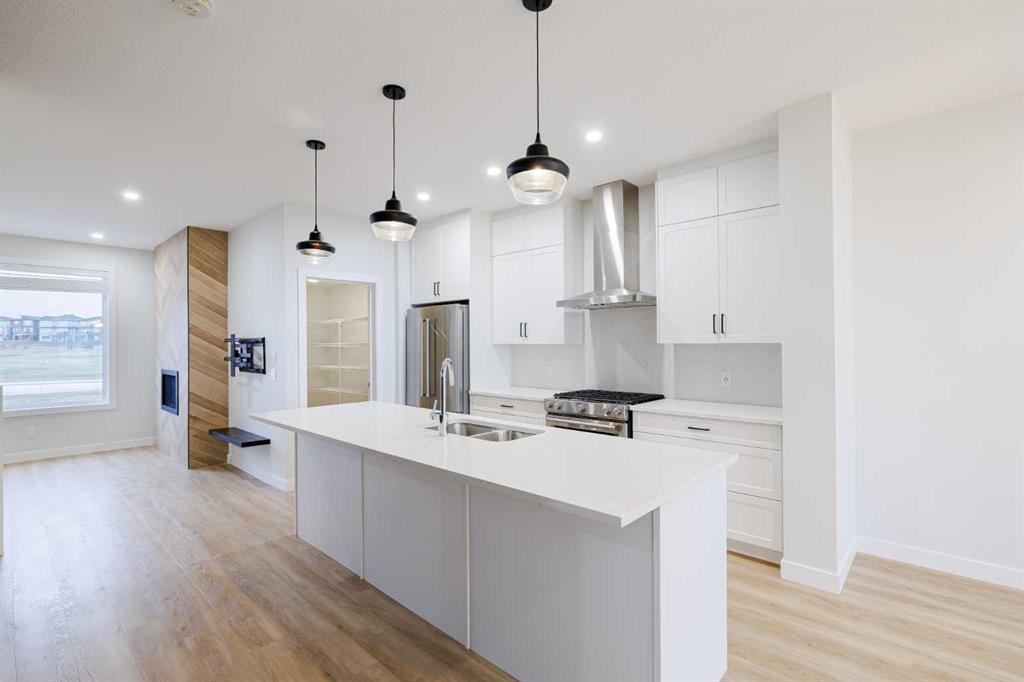 Welcome to this exquisite townhome that epitomizes the perfect blend of luxury, functionality, and natural beauty. Nestled in Harmony—an award-winning community that has proudly earned “Community of the Year – Calgary Region” eight times—this residence stands out with a plethora of upgrades, meticulous maintenance, and thoughtful design. Harmony offers an unmatched lifestyle, combining lake and golf living, walkable amenities, and stunning mountain views. As a resident, you’ll enjoy social membership at the renowned Mickelson National Golf Club, giving you access to world-class golfing right in your backyard. Families will appreciate the proximity to sought-after schools including Springbank Middle School, Springbank Community High School, and the prestigious Edge School for athletes and academics. As you step inside, you are greeted by a spacious den off the front entrance, just steps from the oversized double-car garage featuring a forward-thinking 40-amp EV connection, a true testament to modern living. Ascending to the main level, the kitchen immediately captivates with its elegant finishes—quartz countertops, a large island with breakfast bar seating, ceiling-height white cabinetry, and upgraded stainless steel appliances including a gas range for the culinary enthusiast. A massive pantry with extensive shelving ensures optimal organization. Adjacent to the kitchen is a charming eating nook with access to the front deck, where you can enjoy peaceful lake views. The sunlit living room offers a bright and inviting atmosphere, with panoramic mountain vistas framed by large windows, and a stylish fireplace with custom tile surround adding warmth and sophistication. The upper level showcases the primary suite, complete with a custom California Closet system and a spa-like ensuite featuring in-floor heating, a private water closet, standalone shower, and dual vanity. An upgraded laundry area with quartz countertop, additional shelving, and a large linen closet adds convenience. Two additional generously sized bedrooms and a 4-piece bathroom complete this floor. Outside of the home, Harmony’s amenities enrich everyday living—a 5-minute drive to Calaway Park, and the upcoming Bingham Crossing development with a future Costco and numerous shops and services. Residents also enjoy walking access to the community lake, miles of pathways, and future commercial amenities including the Nordic Spa.