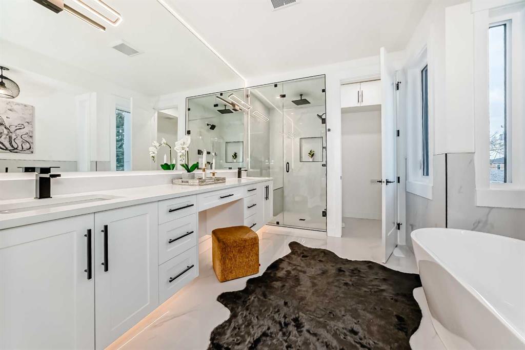 Welcome to a Modern Masterpiece in Tuxedo Park. This newly built home is a stunning showcase of contemporary architecture and thoughtful functionality. From the moment you step inside, you’re greeted by an inviting open floor plan that strikes the perfect balance of warmth and sophistication. The chef-inspired kitchen is a true showstopper, quartz countertops, a waterfall island, quartz backsplash, pot filler, oversized refrigerator, wine cooler, and built-in oven and microwave, huge dining space with elegant feature wall. A cozy gas fireplace enhances the ambiance of the living room. Mudroom w/tile flooring, a custom build bench w/hooks, storage cabinets that offers an easy transition to the outdoors & an elegant 2-pc powder room. Oversized sliding doors lead to a spacious deck, w/a gas line for BBQ, private backyard and direct access to the double garage.. Upstairs, the vaulted hallway ceiling adds a luxurious touch. The primary suite is a serene retreat with vaulted ceilings a huge window size, and a custom-built walk-in closet. The spa-inspired ensuite features a steam shower, smart toilet, heated floors, a freestanding soaking tub. Two additional spacious bedrooms offer walk-in closets and share a beautifully designed Jack-and-Jill bathroom with heated floor. A conveniently located laundry room with a styler steam closet and sink completes the upper level. The fully finished legal basement suite includes two bedrooms w/built-in closets , Heated floor, a separate entrance, its own laundry and dedicated furnace; perfect for rental income or extended family.
