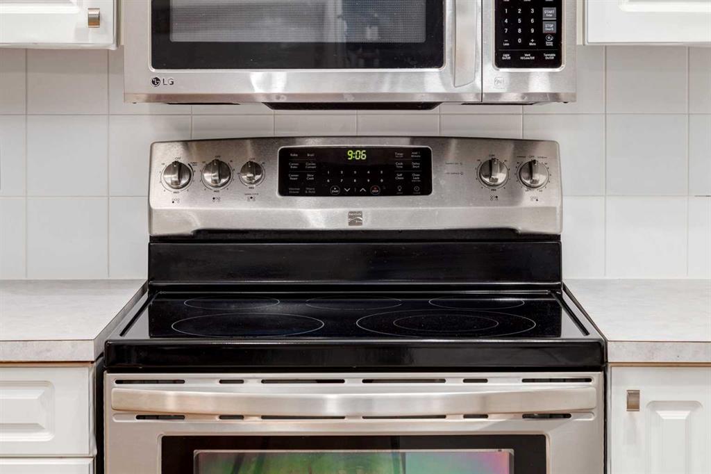 At the heart of the home — a well-appointed eat-in kitchen designed for both function + flow — feat. crisp white cabinetry, tile backsplash, pantry storage + a peninsula BREAKFAST BAR that encourages casual meals + connection — all paired w/ STAINLESS STEEL appliances incl/an electric stove, microwave + white dishwasher for a clean, timeless look.
