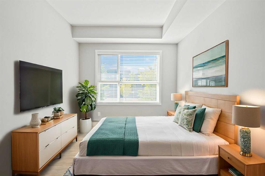 Step into contemporary comfort with this beautifully designed 2-bedroom, 2-bath condo offering 821 sq.ft. of bright, open-concept living. Bathed in natural light from its south-facing exposure, this second-floor home features 9-ft ceilings, air conditioning, and stylish modern finishes throughout. The sleek kitchen showcases quartz countertops, stainless steel appliances, and a spacious island that opens seamlessly into the inviting living and dining area — perfect for relaxing or entertaining. The primary suite includes a private 4-piece ensuite and walk-in closet with wire shelving organizers, while the second bedroom is ideal for guests, a home office, or a small budding family. Step out onto the large south-facing balcony and enjoy maximum sun exposure throughout the day.