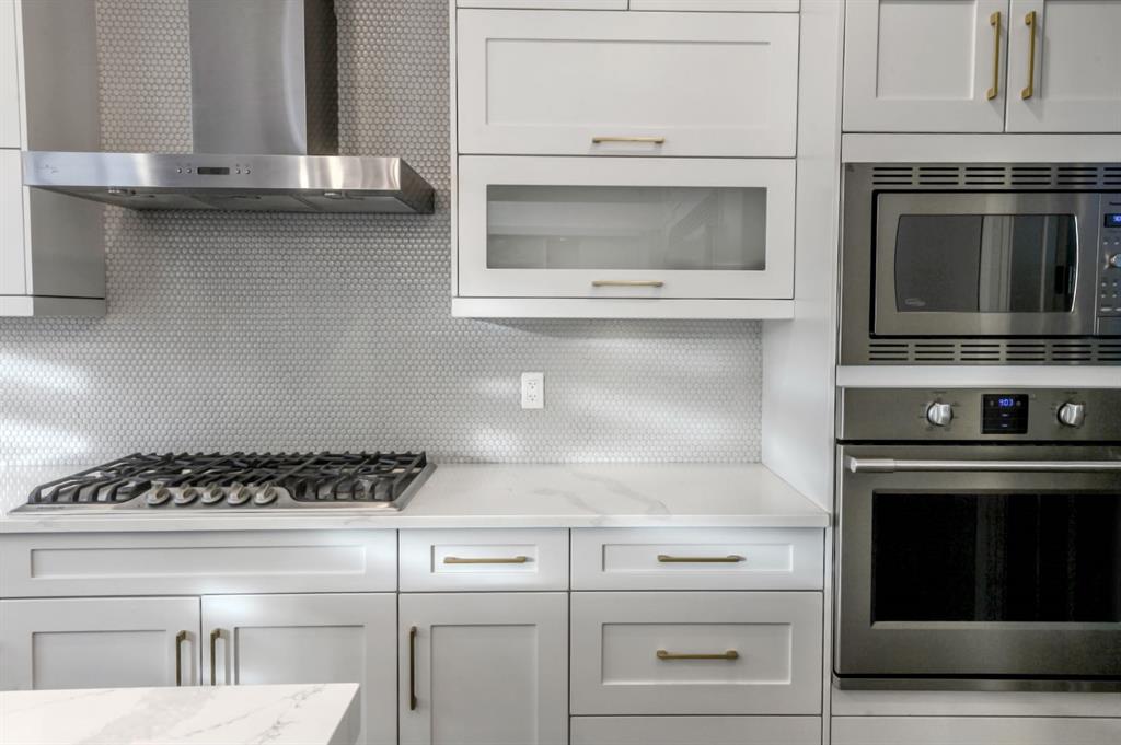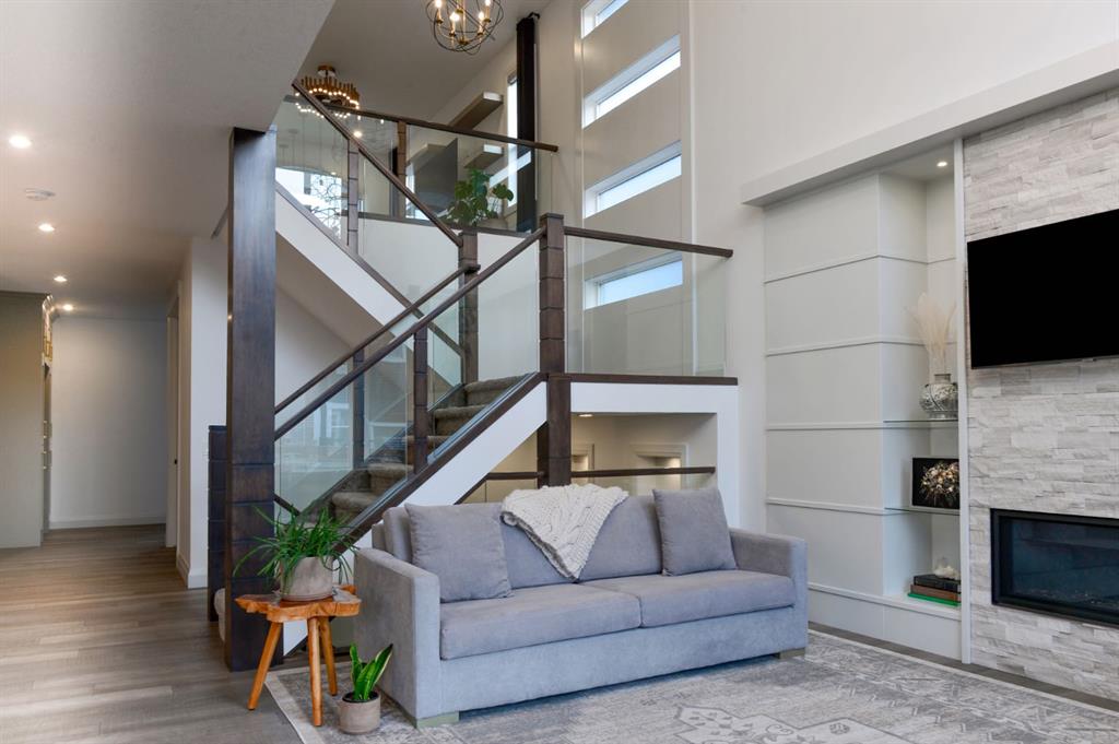 The main floor balances elegance and comfort with a private office, a formal dining room with tray ceilings, and a stunning open-to-above living room anchored by a cozy fireplace. The spacious kitchen is designed for both family life and entertaining, offering a large island, high-end stainless steel appliances, a walk-through pantry with direct garage access, and plenty of storage thanks to its ceiling-height cabinetry. From the kitchen, step out onto the glass-railed deck with a natural gas BBQ hookup, perfect for summer evenings.