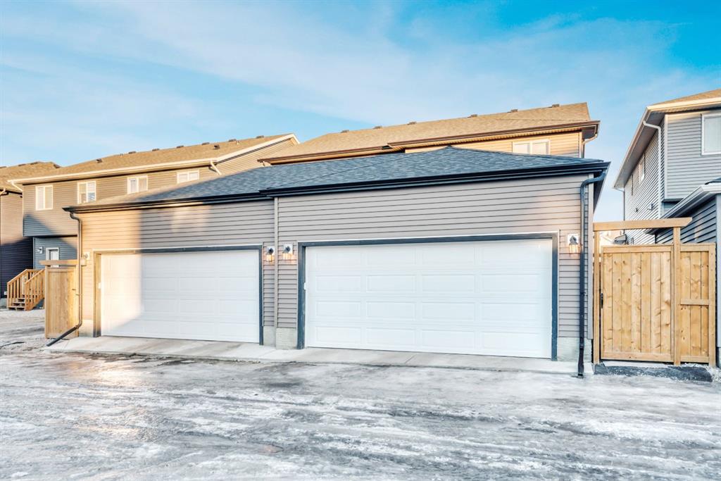 The maintenance-free backyard is fully fenced and complete with a cement patio and gas line for BBQ, ideal for outdoor enjoyment. The double detached garage is insulated, drywalled, and equipped with extra storage shelving, with the added benefit of joined garages allowing a full 4’ walkway to the rear alley. A 50-amp breaker for future EV charging, electrical hookup for A/C, keyless entry, Ring doorbell, and upgraded lighting package further elevate the home’s value.