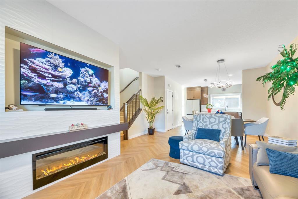The main residence showcases a thoughtfully upgraded interior featuring CHEVRON FLOORING on the main level, a stunning WATERFALL ISLAND, ceiling-height HIGH END CABINETRY, tiled backsplash, under-cabinet lighting, and upgraded appliances—all anchored by a modern, open-concept layout. A recessed tiled TV wall with electric fireplace and mantle adds warmth and architectural interest to the living space. Black plumbing fixtures and matching door hardware provide a cohesive, contemporary finish throughout.