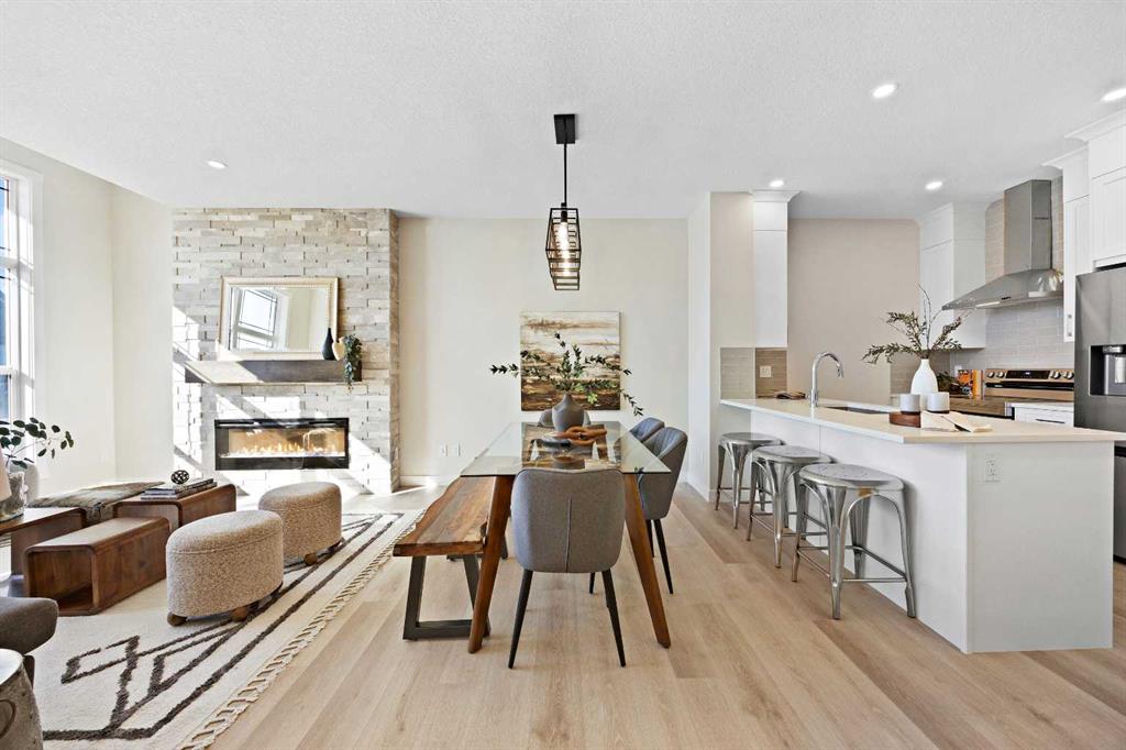 The main floor offers open-concept living with an inviting layout that’s both bright and practical. The kitchen is finished with stone countertops, stainless steel appliances, full-height cabinetry, and a large island with seating, flowing into the dining area and living room. A feature fireplace adds warmth and style, making the space perfect for both entertaining and everyday living. A half bath, storage, and direct garage access complete this level.