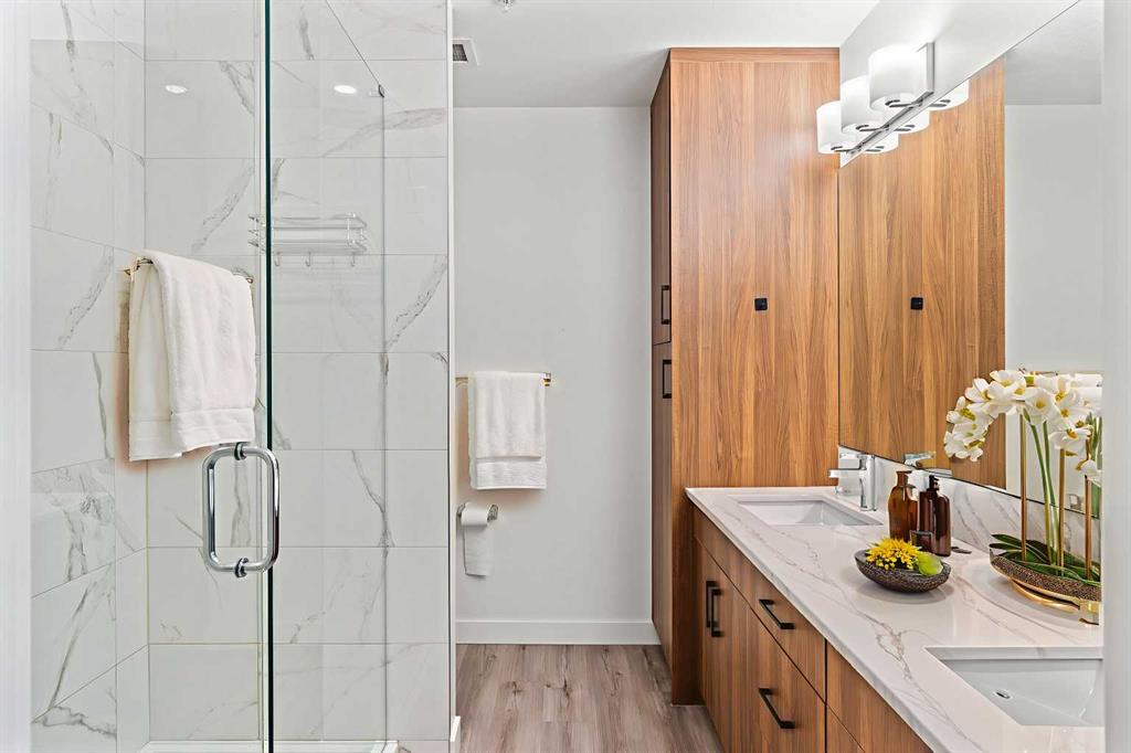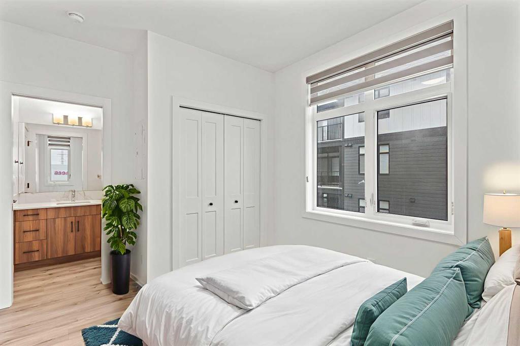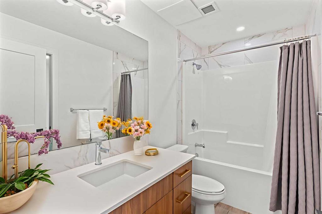 The primary suite is a private retreat, offering a generous layout, an extra-large walk-in closet with custom organizer, and a spa-inspired 4-piece ensuite complete with a tiled shower and upgraded cabinetry. The second bedroom provides excellent flexibility, enhanced by a pocket door offering direct access to the main bathroom—ideal for guests or a home office setup.