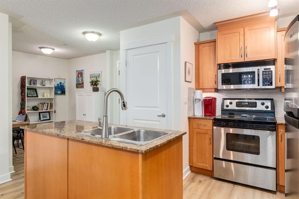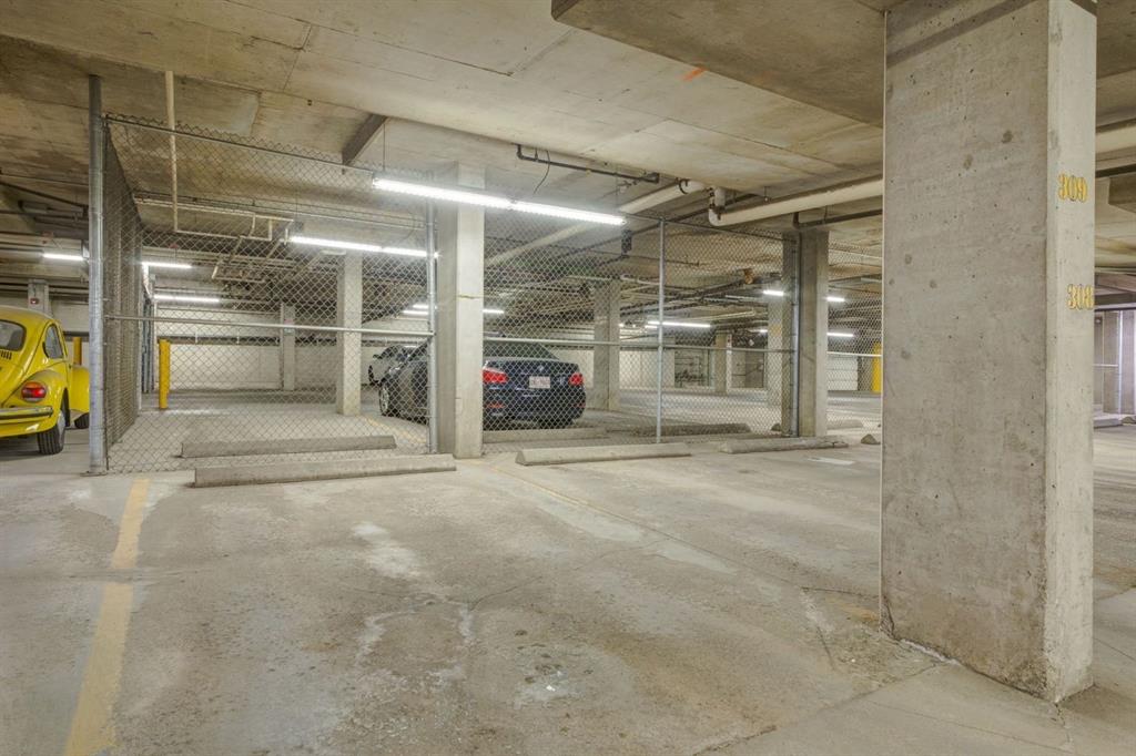 This lovely one bedroom + den is bright & spacious and includes a titled underground parking stall and titled storage cage. It has a popular open concept design with large windows and elegant laminate flooring throughout. The kitchen has maple cabinets, under cabinet lighting, a center island, quartz counters and stainless steel appliances. The dishwasher is new and the in-suite washer & dryer have been updated. You’ll love hosting family and friends for meals in the dining area. The living room is spacious with a modern gas fireplace and sliding doors to the east facing balcony with its peaceful backdrop of mature trees. There is a gas hookup for your BBQ. The bedroom is roomy with a generous walk-through closet that adjoins the 4-piece bathroom. The unit is conveniently located close to a second elevator that provides quick & easy access to the fenced courtyard, underground parking, storage cage, locked bike storage & garbage room. The popular “Gateway Garrison Woods” is a quiet & pet friendly building. Electricity is included in the condo fees. The stylish social room on the 3rd floor features a rooftop balcony that overlooks an outstanding professionally landscaped inner courtyard. It can be reserved without charge for special occasions. Underground visitor parking is available for your guests. Steps away from cafes, restaurants, pubs, entertainment, boutiques, shops, supermarkets and the many services of Marda Loop. Easy access to Crowchild Trail and a short drive to the River Park off-leash dog park, Sandy Beach and the Glenmore Athletic Park. Come and take a look, you won’t be disappointed!