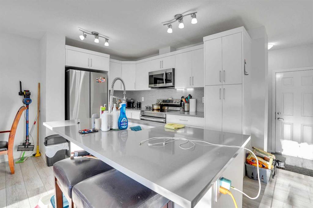 NO CONDO FEES – Discover exceptional value and stylish living at 216 Windbury Lane SW, a beautifully upgraded 3-bedroom, 2.5-bath townhome nestled in the heart of South Windsong, Airdrie. Perfectly positioned directly across from a park and scenic walking paths, this home offers the ideal blend of comfort, location, and modern design—with zero condo fees. Step into a bright and inviting open-concept main floor featuring luxury vinyl plank flooring, knock-down ceilings, and an abundance of natural light. The designer kitchen is the true showpiece, showcasing sleek quartz countertops, stainless steel appliances, upgraded cabinetry, and a large central island with bar seating, making it perfect for hosting or enjoying casual family meals. Upstairs, the spacious primary suite offers a tranquil retreat with a luxurious tiled ensuite shower, while two additional bedrooms provide ample space for kids, guests, or a home office. Both bathrooms are finished with high-end tilework and modern fixtures for a spa-like feel. Enjoy the convenience of an attached garage, a private driveway, and a fully landscaped exterior—all just minutes from top-rated schools, shopping, and quick access to Deerfoot Trail, CrossIron Mills, and North Calgary. Whether you’re a first-time buyer, a growing family, or looking to downsize without sacrificing style, this move-in-ready gem delivers the perfect balance of function and flair—all with no condo fees. Don’t miss this rare opportunity!
