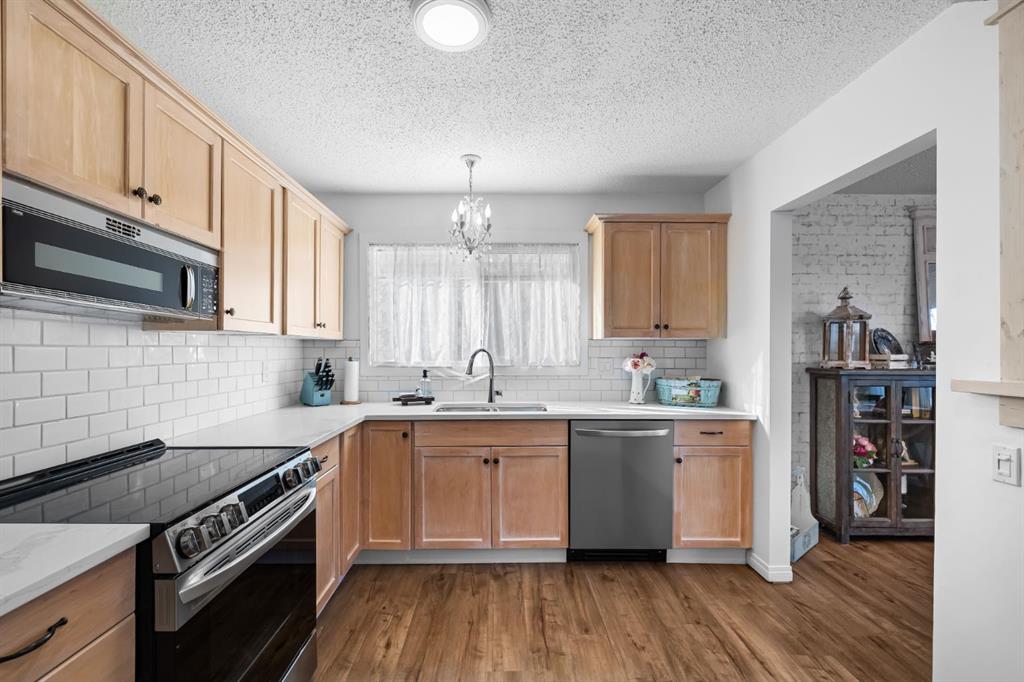 *OPEN HOUSE Sat Oct 25, 1-3 pm* Welcome to this beautifully updated 5-bedroom, 2-bath bungalow in quiet Airdrie Meadows! With over 2,000 sq ft of developed space, this bright and functional home blends modern upgrades with family-friendly comfort. The sun-filled main floor features large windows, an inviting living room/dining room combo, a renovated kitchen with new stainless-steel appliances, quartz countertops and subway tile backsplash. Three spacious bedrooms and a refreshed 4-piece bath complete the upper level. Downstairs offers two additional bedrooms, a 3-piece bath, laundry, rec room, and flex/den space — perfect for guests, teens, or work-from-home. Enjoy the sunny, fully fenced south-facing backyard with an oversized single detached garage. Walking distance to schools, parks, shopping, and easy access to commuter routes. This move-in-ready home offers incredible value in one of Airdrie’s most established neighbourhoods.