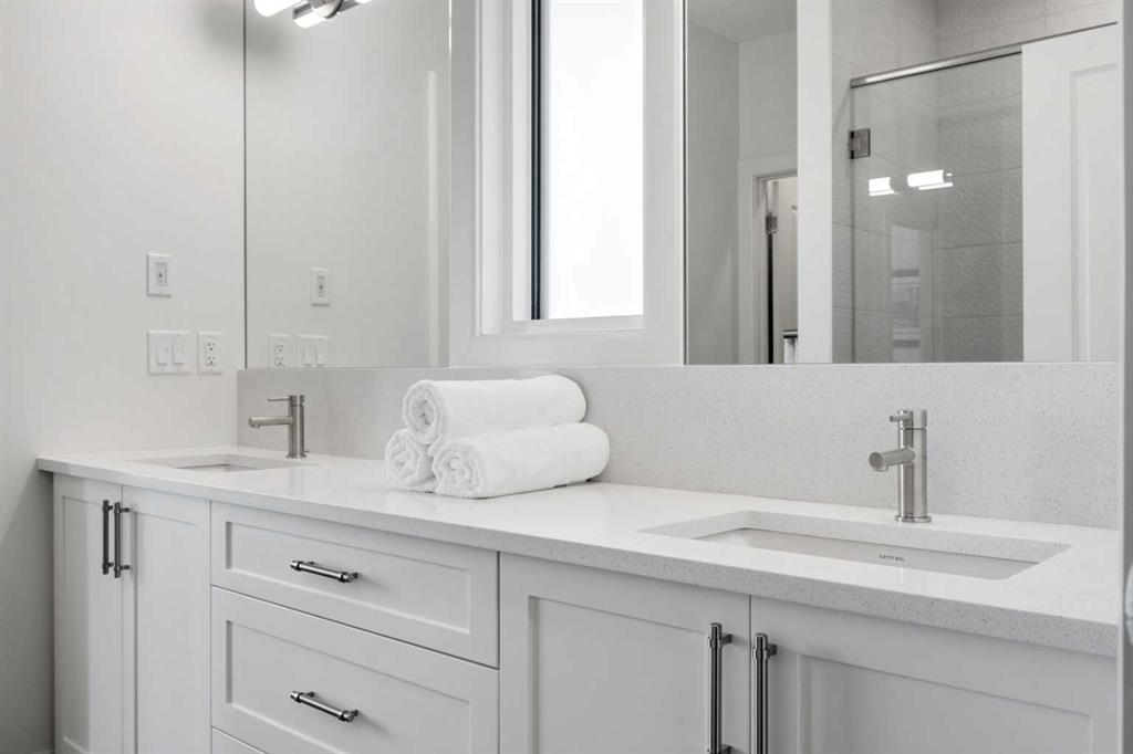 The primary bedroom offers a calm and comfortable retreat at the end of the day. This space includes a spacious walk-in closet and a luxurious ensuite bathroom designed for everyday relaxation. The ensuite features double quartz vanities and a beautifully tiled glass shower, creating a spa-like atmosphere within the home.