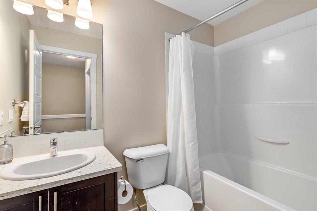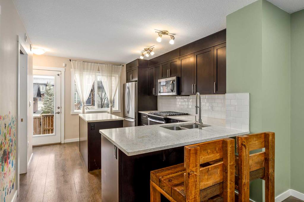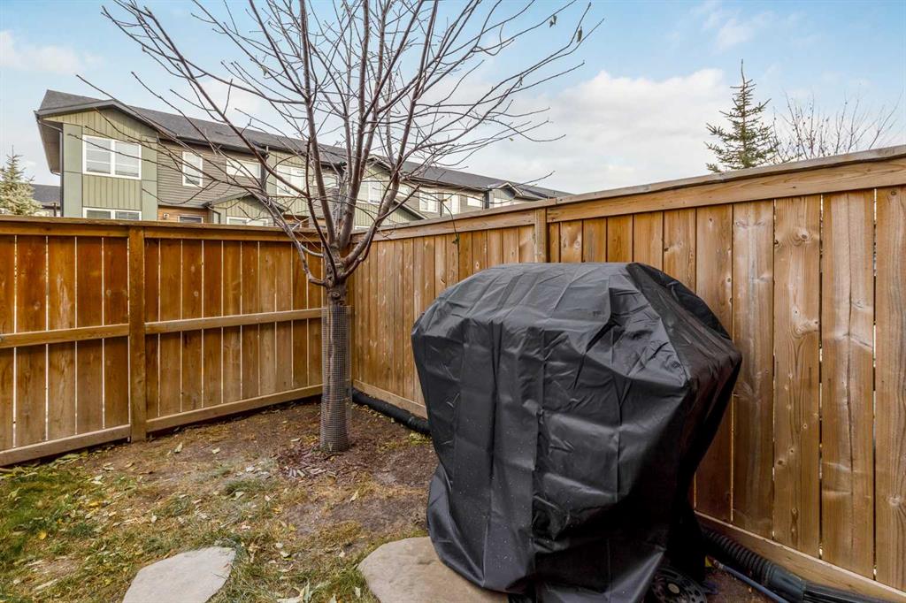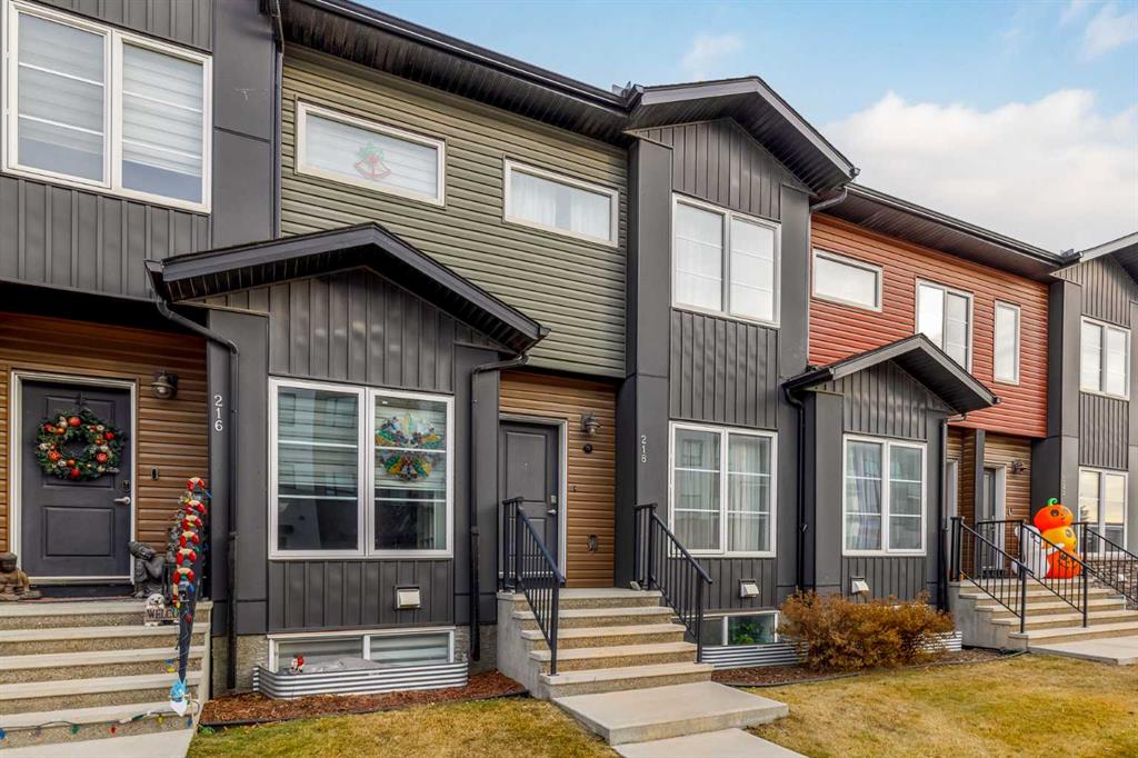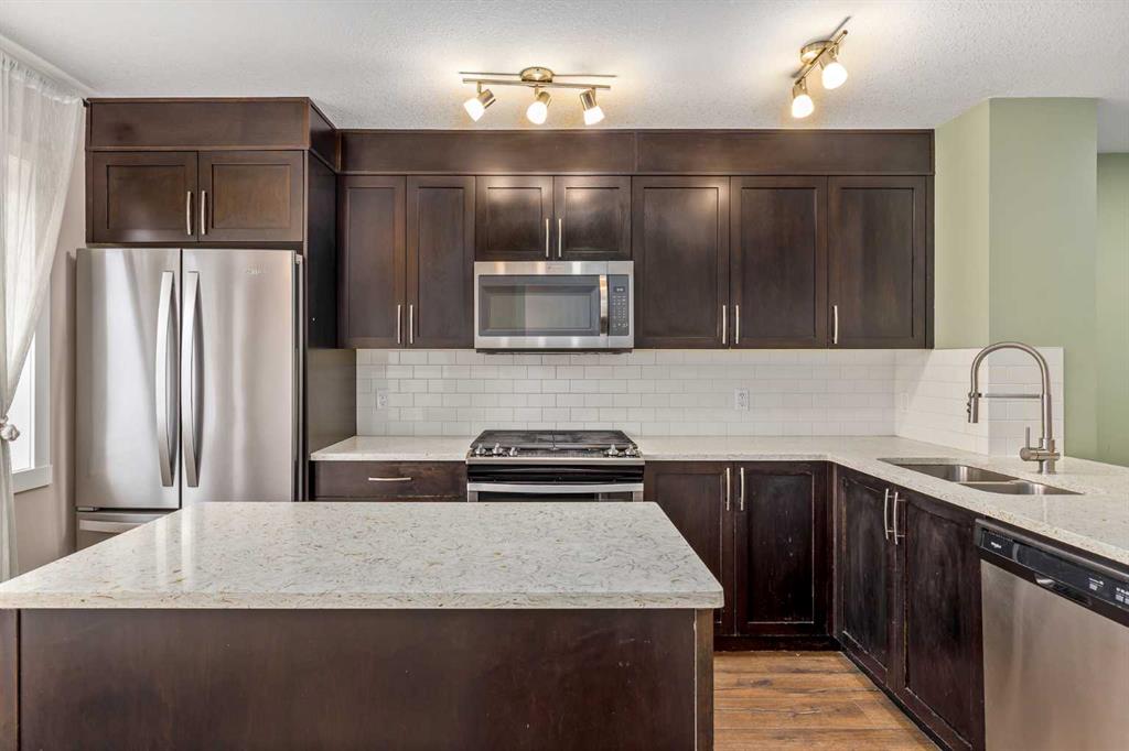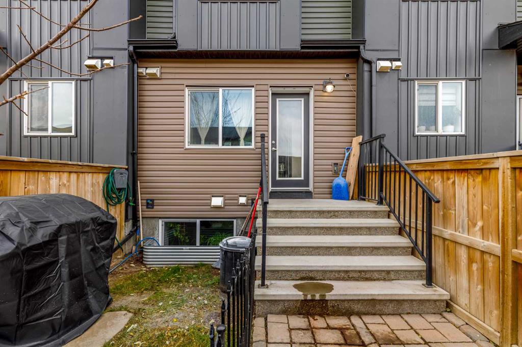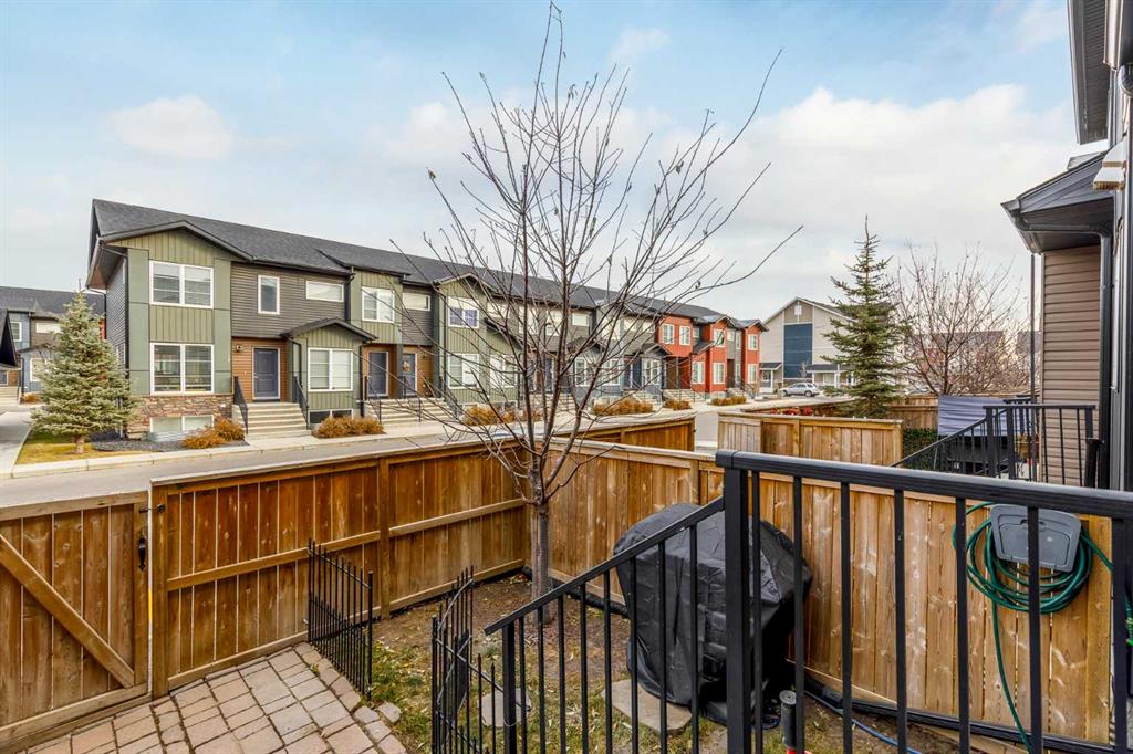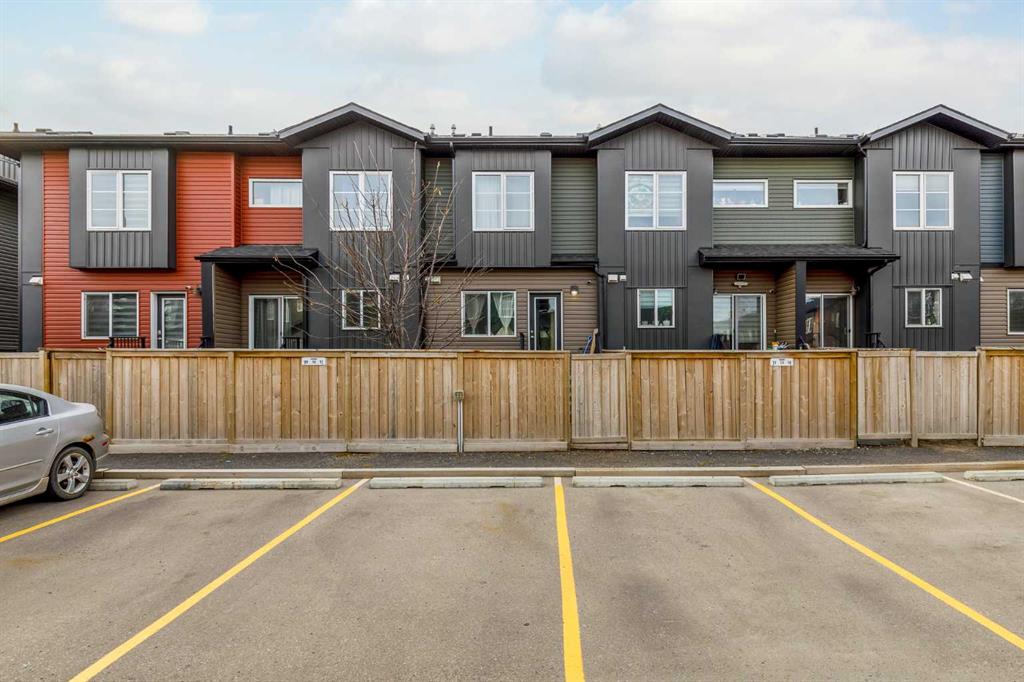 Welcome to this stylish townhome in Redstone offering over 1,600 sq. ft. of finished living space and everyday convenience—including two parking stalls located directly outside your private, fenced yard (a rare find in this complex). Plus, you’re right across the street from shops and moments to parks, pathways, transit, and Stoney Trail. Inside, the main floor is bright and functional with dark laminate flooring throughout. A welcoming front family room features a decent-sized picture window for natural light. The staircase is set along the side of the home beside the central dining area, creating a smooth flow to the back of the house. The rear kitchen is well-designed with dark-stained cabinetry, quartz counters with subtle black and gold veins, subway tile backsplash, stainless steel appliances, a gas stove, an island, and a pantry-style closet. A 2-piece bath is conveniently located across from the kitchen, and the back door leads to your private, fenced yard—perfect for BBQs and easy outdoor living—with those two parking stalls just beyond the gate. Upstairs, laminate continues through the entire upper level (carpet only on the stairs). The primary bedroom includes dual closets and a large nook with a custom built-in for TV and storage, plus a 3-piece ensuite with a corner shower. The second bedroom is generously sized and has access to a full 4-piece bathroom located just outside the door—ideal for guests, kids, or a roommate. The basement is fully finished and adds terrific bonus space: a cozy recreation room with a good-sized window, a 4-piece bathroom, and a rear bedroom with a closet and a bump-out perfect for a TV or desk area. Laundry is downstairs in a dedicated closet, with the mechanical room across. Outside, enjoy the private, fenced yard, and the everyday ease of two assigned stalls right out back—a standout advantage compared to most units with only one. Redstone offers a welcoming, family-friendly vibe with parks, playgrounds, and scenic pathways, plus quick access to shopping, transit, and major routes. Whether you’re a first-time buyer, downsizer, or investor, this home checks all the boxes for space, style, and value. Book your private showing today and experience the best of Redstone living.