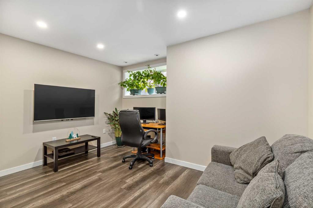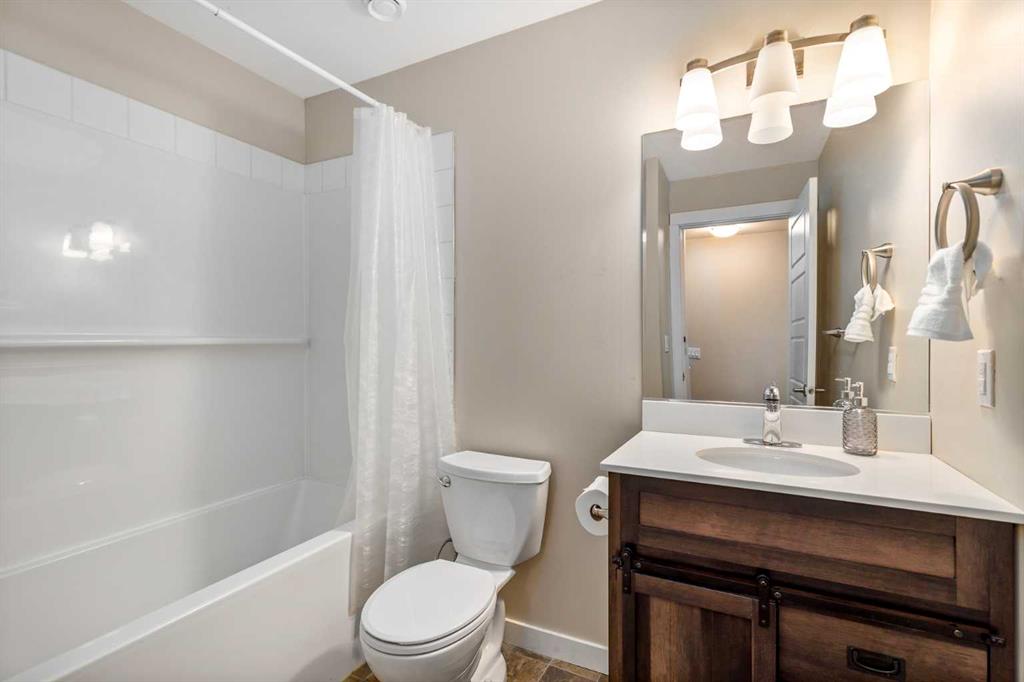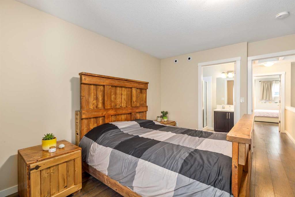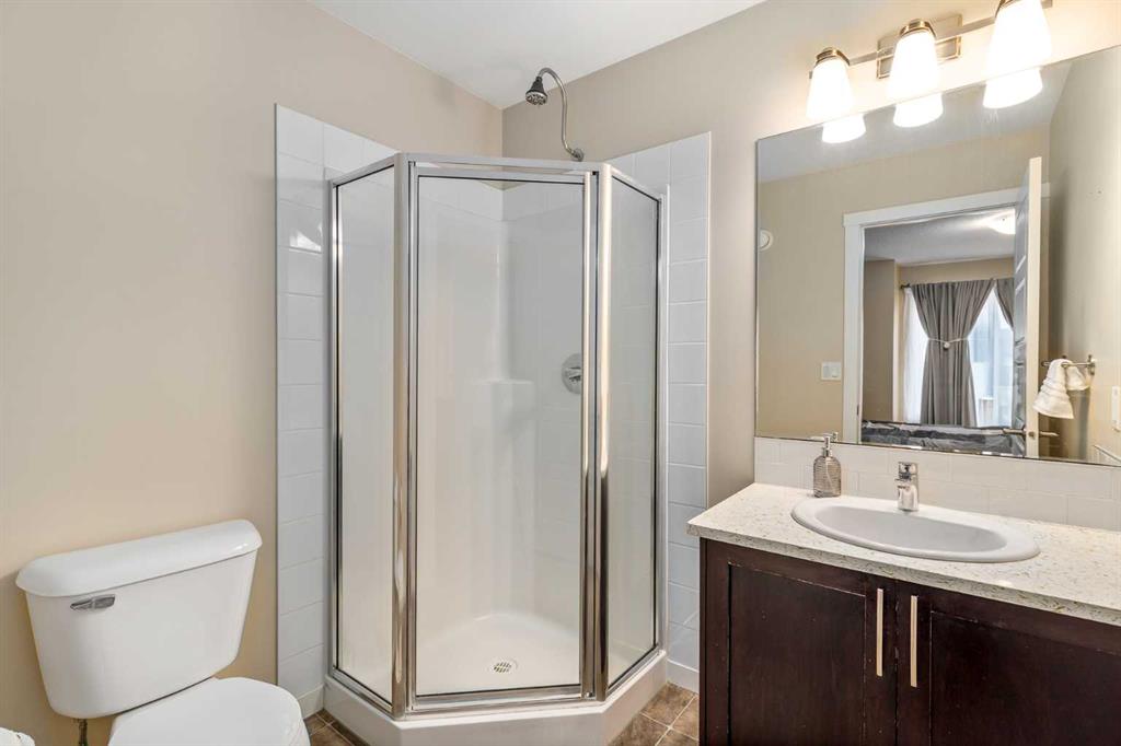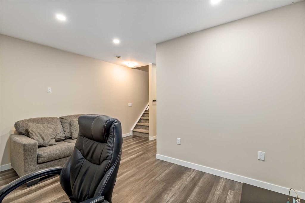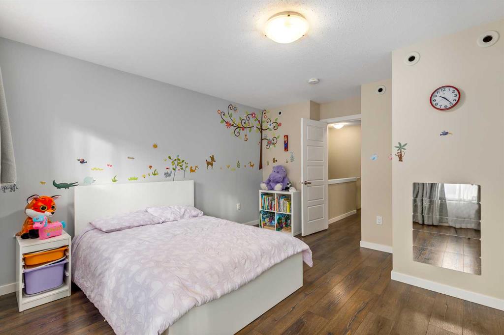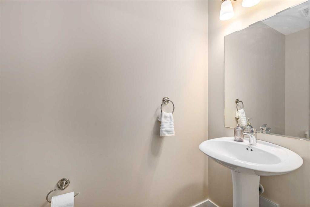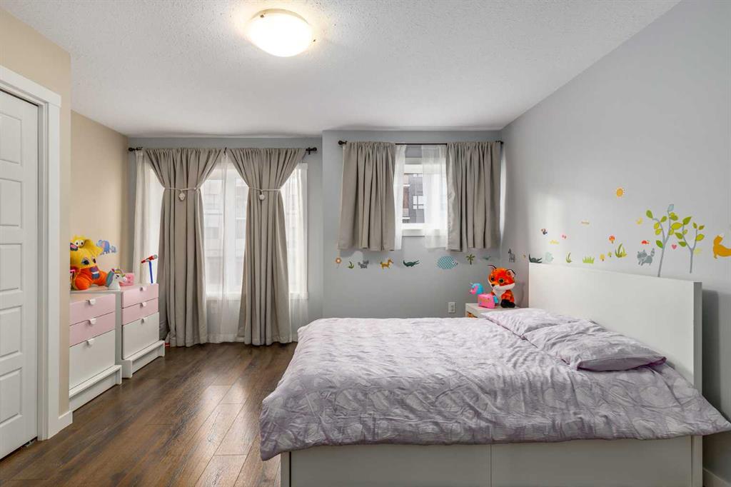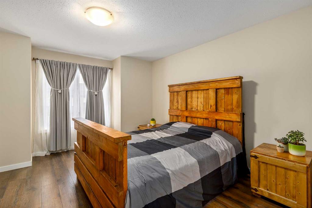 Welcome to this stylish townhome in Redstone offering over 1,600 sq. ft. of finished living space and everyday convenience—including two parking stalls located directly outside your private, fenced yard (a rare find in this complex). Plus, you’re right across the street from shops and moments to parks, pathways, transit, and Stoney Trail. Inside, the main floor is bright and functional with dark laminate flooring throughout. A welcoming front family room features a decent-sized picture window for natural light. The staircase is set along the side of the home beside the central dining area, creating a smooth flow to the back of the house. The rear kitchen is well-designed with dark-stained cabinetry, quartz counters with subtle black and gold veins, subway tile backsplash, stainless steel appliances, a gas stove, an island, and a pantry-style closet. A 2-piece bath is conveniently located across from the kitchen, and the back door leads to your private, fenced yard—perfect for BBQs and easy outdoor living—with those two parking stalls just beyond the gate. Upstairs, laminate continues through the entire upper level (carpet only on the stairs). The primary bedroom includes dual closets and a large nook with a custom built-in for TV and storage, plus a 3-piece ensuite with a corner shower. The second bedroom is generously sized and has access to a full 4-piece bathroom located just outside the door—ideal for guests, kids, or a roommate. The basement is fully finished and adds terrific bonus space: a cozy recreation room with a good-sized window, a 4-piece bathroom, and a rear bedroom with a closet and a bump-out perfect for a TV or desk area. Laundry is downstairs in a dedicated closet, with the mechanical room across. Outside, enjoy the private, fenced yard, and the everyday ease of two assigned stalls right out back—a standout advantage compared to most units with only one. Redstone offers a welcoming, family-friendly vibe with parks, playgrounds, and scenic pathways, plus quick access to shopping, transit, and major routes. Whether you’re a first-time buyer, downsizer, or investor, this home checks all the boxes for space, style, and value. Book your private showing today and experience the best of Redstone living.