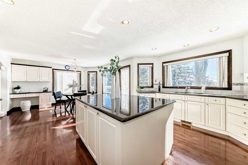OpenHouse Saturday March 7th 2-4pm. First time on the market, this custom-built former show home has a lot to offer: over 5,000 sq. ft. of developed living space, 3,367 sq. ft. above ground plus a 1,646 sq. ft. legal walkout, in-floor heated basement suite. Ideal for a multi-generation family or a live-up, rent-down setup. Located in a quiet cul-de-sac, steps from open green space in the decadent Scenic Acres neighborhood. The estate home welcomes you with a bright foyer, office, and living room with a 17 ft high ceiling. The well-appointed living room features a masonry mantel fireplace with four southwest-facing windows to let in sunlight. Adjacent is a gorgeous formal dining room, perfect for entertaining large groups of guests. To the left, your gourmet kitchen offers a gas stove, new refrigerator, a huge central island with side wine shelves, a walk-in pantry, and abundant cabinetry with granite countertops. Another generously sized dining area allows you to enjoy family gatherings or host more guests. Then comes your huge family room with a second gas fireplace surrounded by real wood shelves. A 2-piece bathroom and a spacious laundry room complete the main floor. The curved stairs lead you up. You will fall in love with the curved-stair hall that connects to your huge and private master bedroom suite and the other 3 bedrooms. Sipping your morning coffee or relaxing on your sitting area couch facing the large bay window, you will enjoy the distant mountain views. The jacuzzi spa tub is another retreat for you to relieve daily stress. Down the hall, three good-sized bedrooms and a 5-piece bathroom finish the second floor. Oak hardwood floor is throughout most of the main and second levels. New carpet down the stairs to the basement flex room leads you to the rarely found 2–3 bedroom walk-out legal suite basement. (The current exercise room could be converted to a third bedroom if needed.) The in-floor-heated suite could comfortably accommodate extended family members or be easily rented long-term or short-term as a great mortgage helper. Upgrade includes: hot water tank installed in 2026, Poly B replaced in 2026, engineered flooring throughout the basement in 2021, all window and door frames are made of high-quality real wood