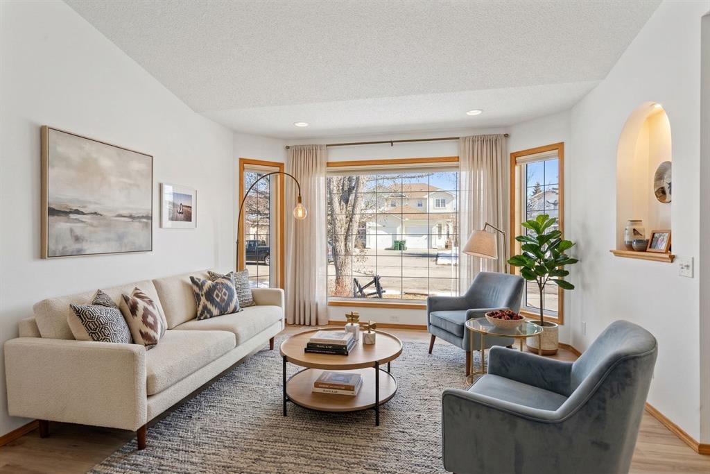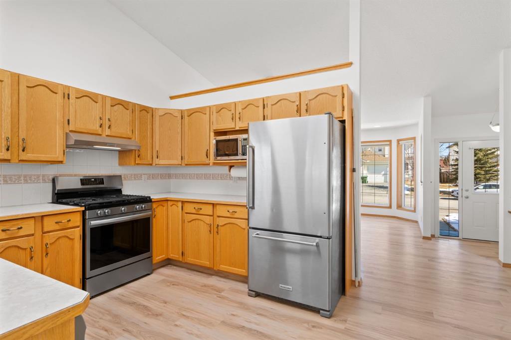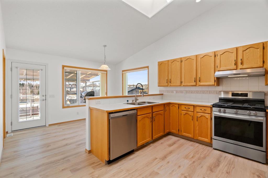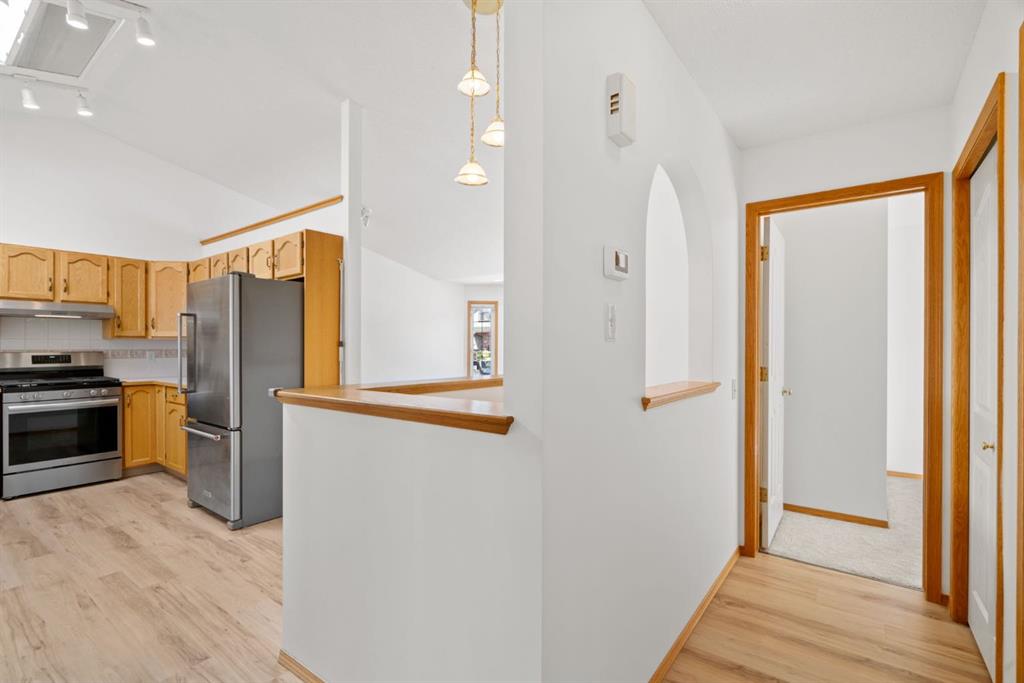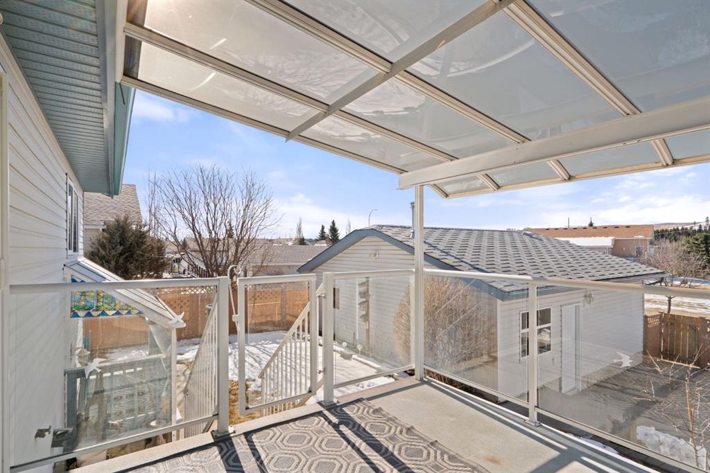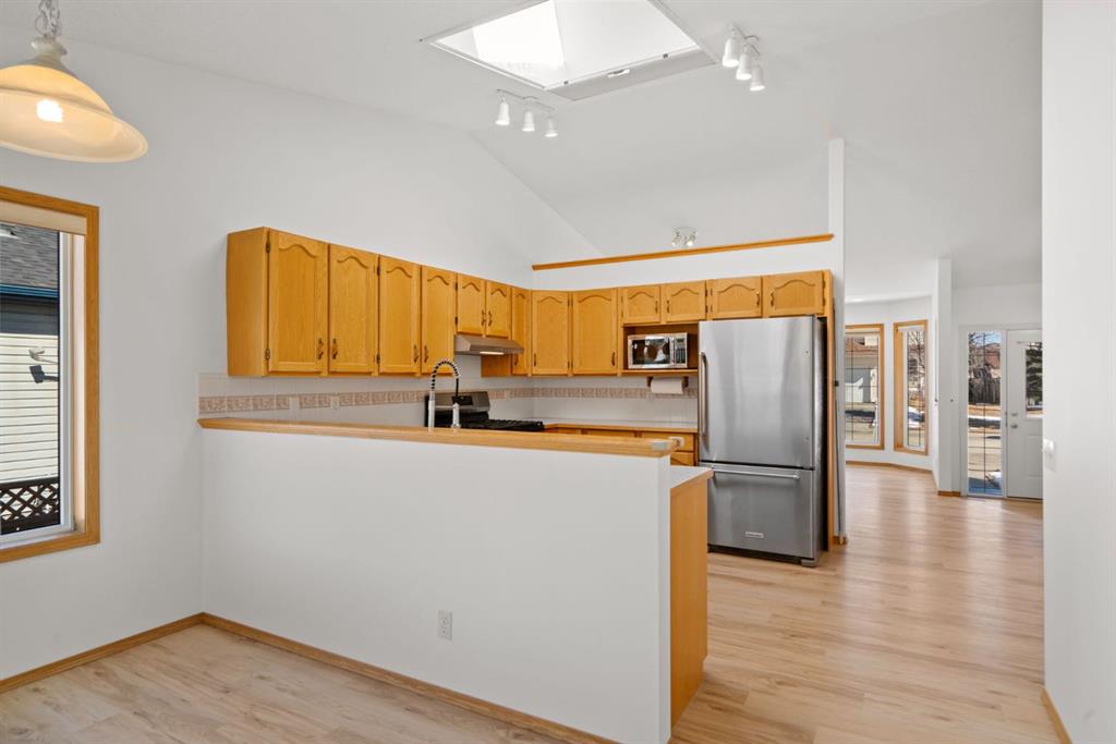 Beautifully maintained BUNGALOW in the desirable community of WEST TERRACE, just steps from Cochrane’s incredible pathway system & only a short WALK to the BOW River. This 3-bedroom, 3-bathroom home offers a functional layout with 2 bedrooms up OR enjoy your spacious primary retreat complete with PRIVATE 3 piece ensuite & use second bedroom as an OFFICE! 4 piece Bath PLUS convenience of MAIN FLOOR laundry on this level. Bright, inviting living area featuring cozy gas FIREPLACE, vaulted ceiling & a SUN FILLED kitchen enhanced by a skylight. SO much counter space. Walk in pantry! Recent updates include PAINT, vinyl plank flooring (2026), newer appliances – including gas stove (2025), dishwasher (2024), updated doors, furnace (2023), roof shingles (2021). Hidden screen doors for your comfort. All these updates will allow you to start enjoying this home right away – while providing peace of mind for years to come! The fully finished walk-up basement (Polycarbonate roof to protect stairs) offers additional living space, another bedroom (Window may not be egress to todays standards), 3 piece bth & flexibility for a variety of lifestyles. Multi generational living possible here! Potential for Suite subject to approval and permitting from the Town of Cochrane, in basement w/separate entrance. SOUTH outdoor living is a standout!!! GREAT curb appeal from the minute you pull up! Did I mention how much street parking you can enjoy?! Enjoy COVERED deck off kitchen overlooking McCaig’s Park – featuring Polycarbonate roof, dura-deck, new stairs (2025) & gas line for BBQ. The PRIVATE backyard (no neighbours behind you!) backs onto greenspace & includes large gated concrete pad. Trailer parking, addtl storage or perfect entertaining space. OVERSIZED DOUBLE GARAGE 23.3 x 23.3 is HEATED, wired with 220V & comes equipped w/air lines & compressor – ideal for hobbyists or anyone needing extra workspace! Back alley is bus route – ALWAYS plowed/graded. Addtl features include Vacu-Flo rough-in, underground water system front & back (professionally maintained) & prepaid lawn care services for the 2026 year! Nicely landscaped front/back with apple trees, cherry trees, and perennials. Rare opportunity to own well LOVED home – in PRIME location close to nature, pathways & all amenities. THREE schools in area. West Terrace has MANY playgrounds & is well connected by footpaths. Ride your bike, walk the dog or take the family for a walk along the path beside the Bow River & enjoy NATURE in your own neighbourhood! Easy access to everything downtown Cochrane offers. Close to Calgary. Be in mountains under 45 mins! 40 mins to Calgary Airport or Downtown. NO POLY B.