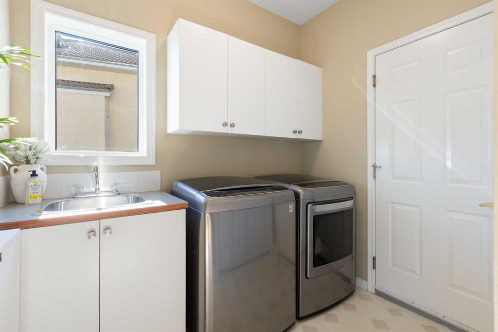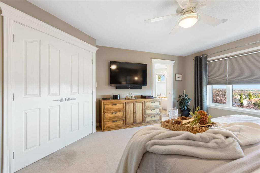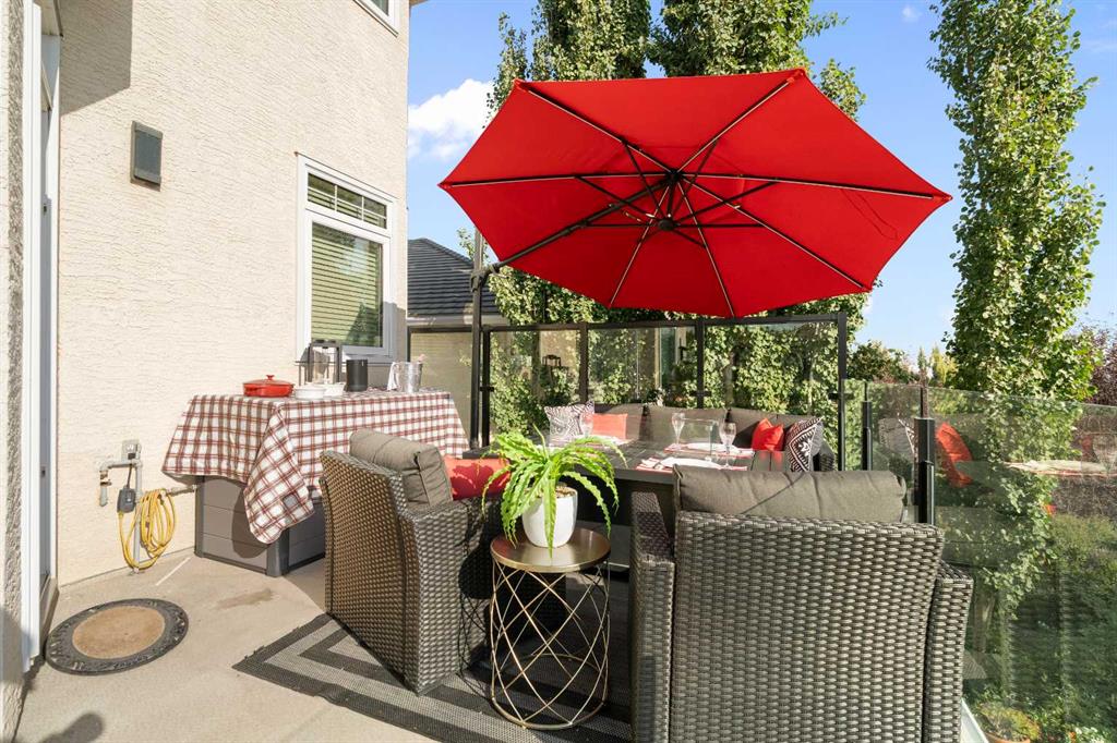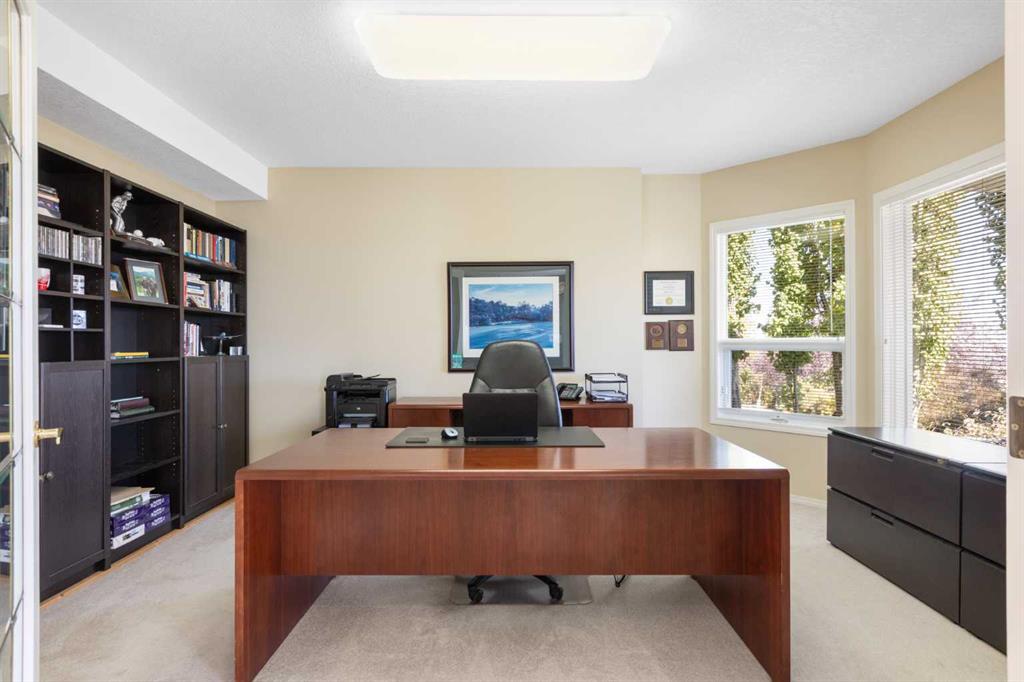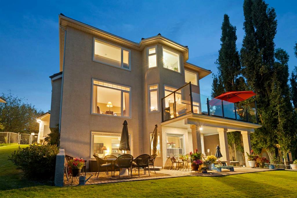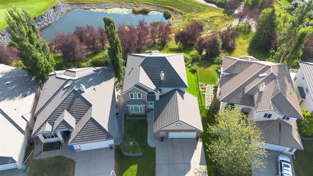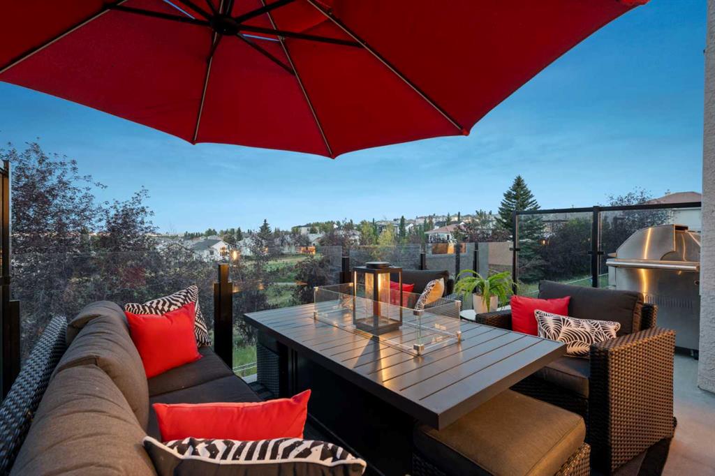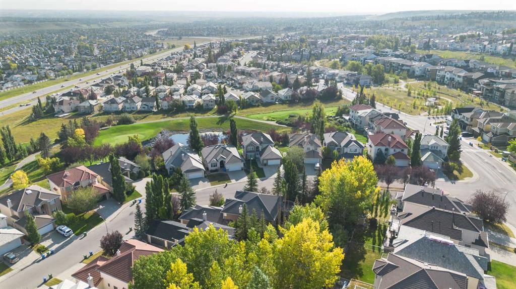 Backing onto the 16th hole of The Hamptons Golf Course, this meticulously maintained, single-owner walkout home offers nearly 4,000 sq. ft. of developed living space. Enjoy unobstructed east-facing sunrise views over the fairway, pond, and city, plus night-time city lights. The main floor features an open-concept kitchen, dining, and family area with gas-burning fireplace, main floor den with built-in cabinetry, and an upper deck with frameless glass railing and two gas connections for flexible outdoor living. The kitchen includes Sub-Zero 36” built-in fridge/freezer, Wolf 30” dual-fuel range, Panasonic microwave, Miele dishwasher, and hood fan, while Hunter Douglas window coverings enhance the main spaces. Upstairs, the home offers four spacious bedrooms, including a primary suite with custom ensuite (2015) featuring a standalone soaking tub, in-floor heating, glass-enclosed shower with rain head, custom cabinetry, and Kohler designer fixtures. TV mounts are in the living room and master bedroom. The walkout basement extends living space with a large office wired for internet and dual phone lines, custom maple cabinetry with media centre and bookcase, second gas-burning fireplace, and additional flex room ideal as a bedroom, gym, or hobby space. Direct access to a large interlocking patio provides private golf course views. An oak standalone bookcase at the bottom of the stairs is included. Other features include LG washer & dryer, two Amana high-efficiency furnaces, central A/C, two water heaters (2025), Kinetico water system, Vacu-Flo system with attachments, updated vinyl-clad windows (2015–2021), oversized two-and-a-half-car garage with large driveway, and a programmable in-ground irrigation system. Located on a quiet street and maintained as a no-pet home, this property combines exceptional design, premium finishes, and a premier golf course setting in The Hamptons, close to parks, schools, walking paths, and convenient access to Stoney Trail, Country Hills Boulevard, and Shaganappi Trail.