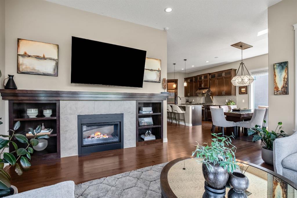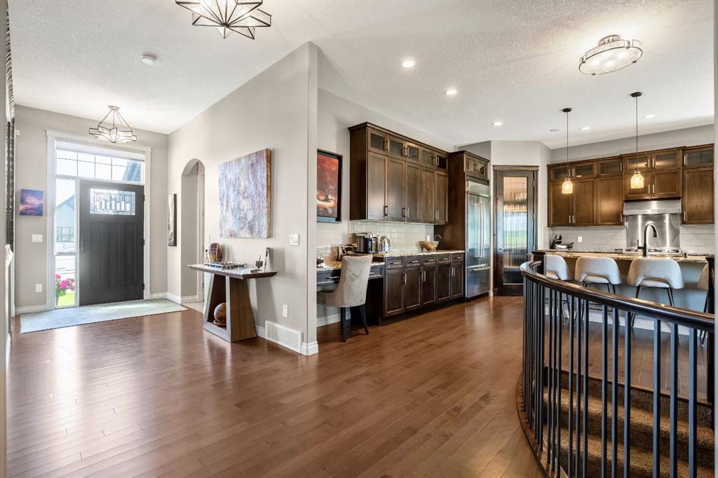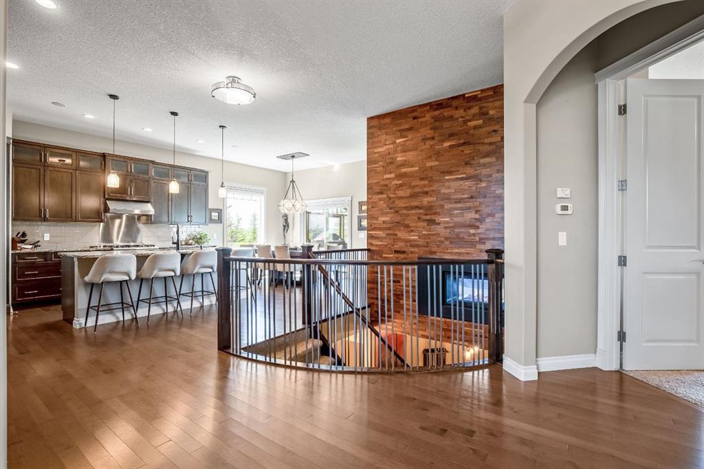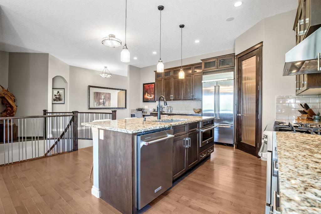 This beautifully finished bungalow in the prestigious community of Monterra offers an exceptional blend of elegance, comfort, and thoughtful upgrades, set on a beautifully landscaped quarter-acre lot with breathtaking north and west views. Inside, soaring 10’ ceilings, a grand spiral staircase, and a striking two-way gas fireplace framed by a custom walnut feature wall set the tone for the open, light-filled main floor. The gourmet kitchen is designed for both style and function, showcasing granite countertops, a walk-through pantry, a premium Thor gas range, commercial-style KitchenAid refrigerator, built-in microwave/second oven, and reverse osmosis water filtration, flowing seamlessly into the dining and living areas with custom built-ins—perfect for everyday living and entertaining.
