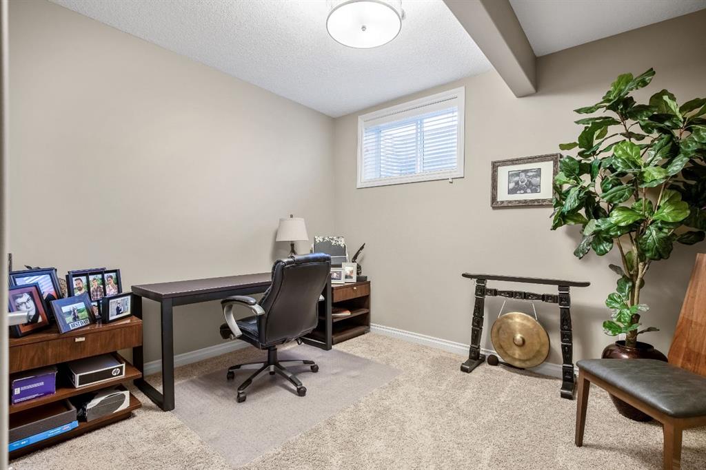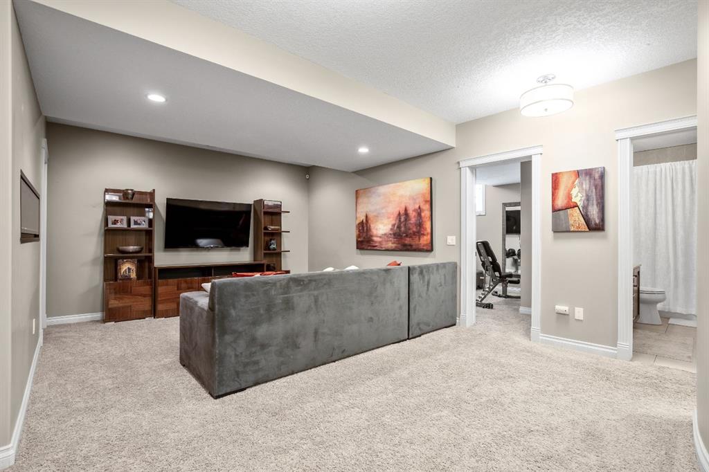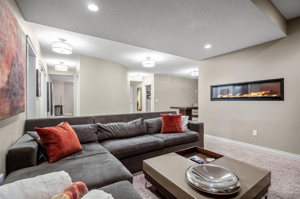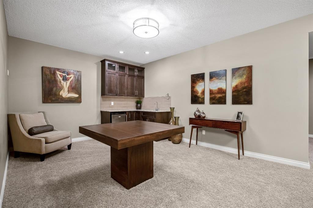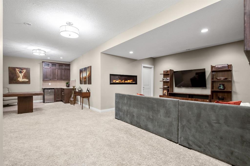 The primary suite is a true retreat, featuring double-door entry, a walk-in closet, and a spa-inspired 5-piece ensuite with soaker tub, tiled shower, and dual sinks. A front office or additional bedroom, full bathroom, and well-appointed laundry/mudroom complete the main level. The beautifully finished lower level offers a cozy media room, wet bar and games area, along with an expansive recreation area, three generous bedrooms, and a 5-piece bathroom—providing exceptional versatility for family and guests alike.