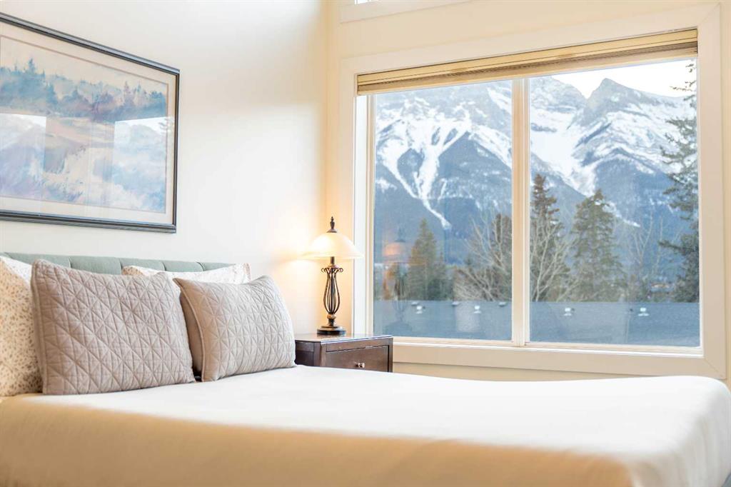 The bi-level design separates living and sleeping areas for added privacy. Both bedrooms feature vaulted ceilings and oversized windows that frame views of the Three Sisters and keep the rooms feeling open and bright. With two full bathrooms and bedrooms on separate levels, the layout works well for families, couples, or short-term guests.