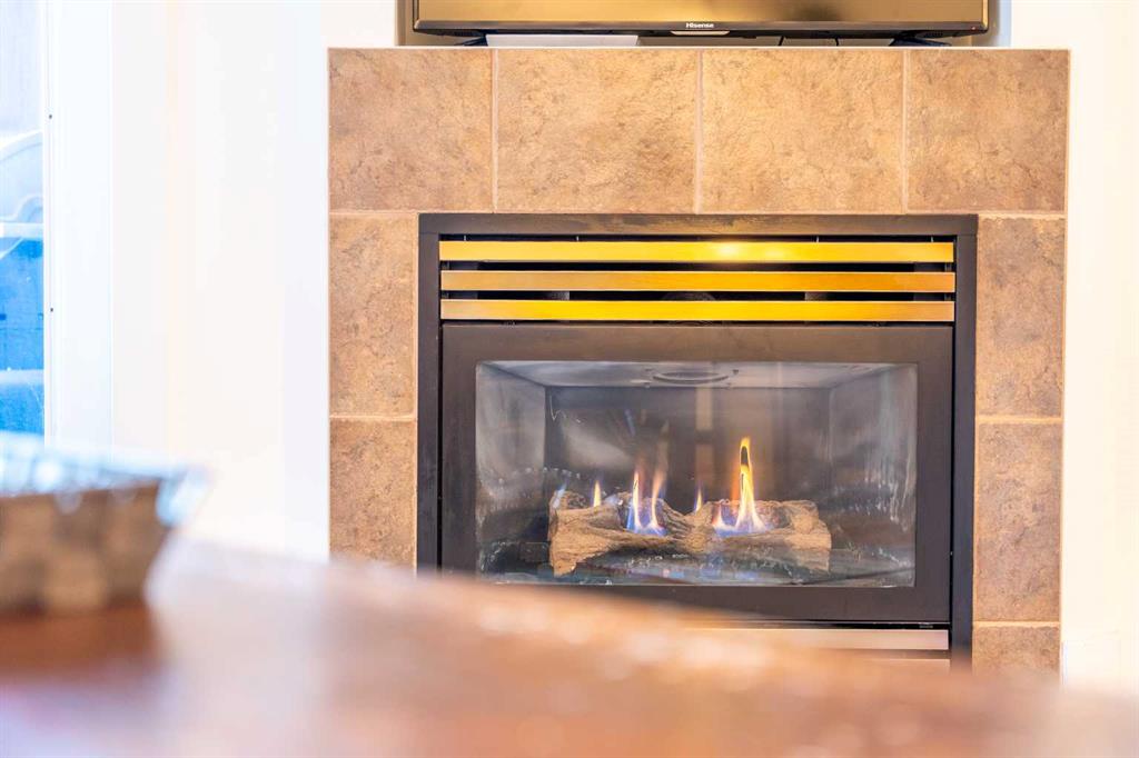 783 sq ft with a bright, functional layout that makes excellent use of the space. The main level includes the kitchen, dining area, laundry, and living room, creating a practical flow for both everyday living and guest stays. The living room features a gas fireplace and large south-facing windows that bring in strong natural light and mountain views throughout the day.
