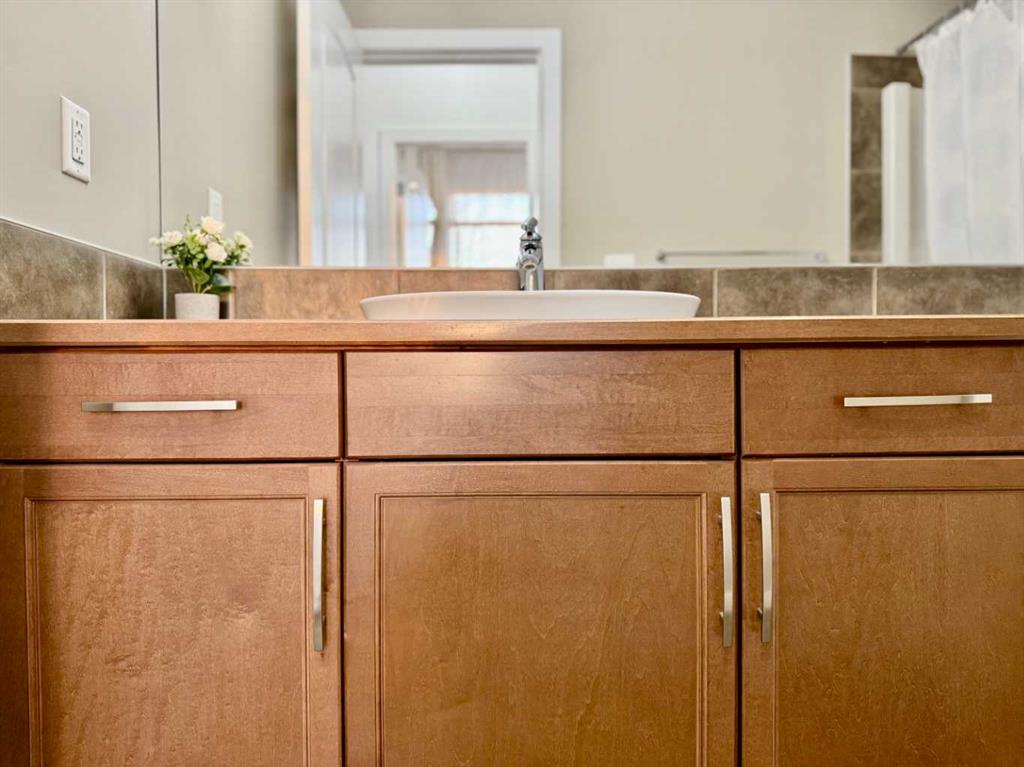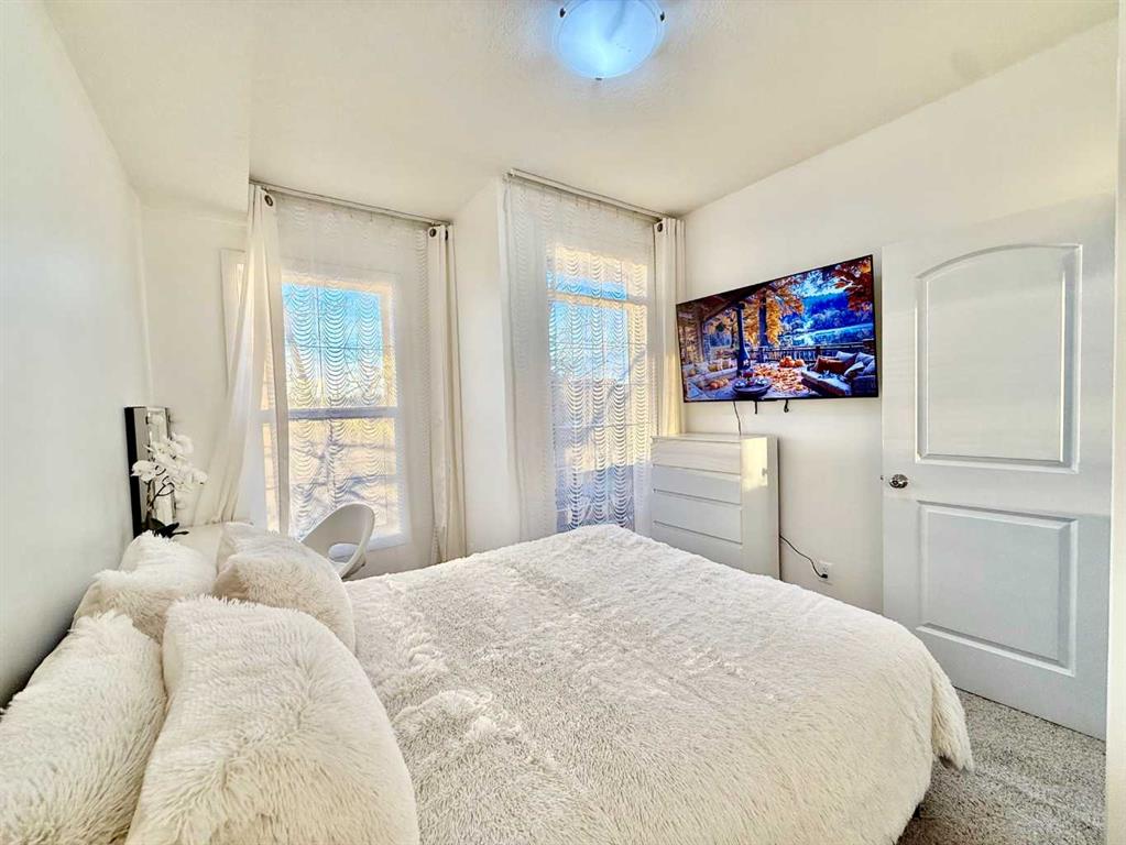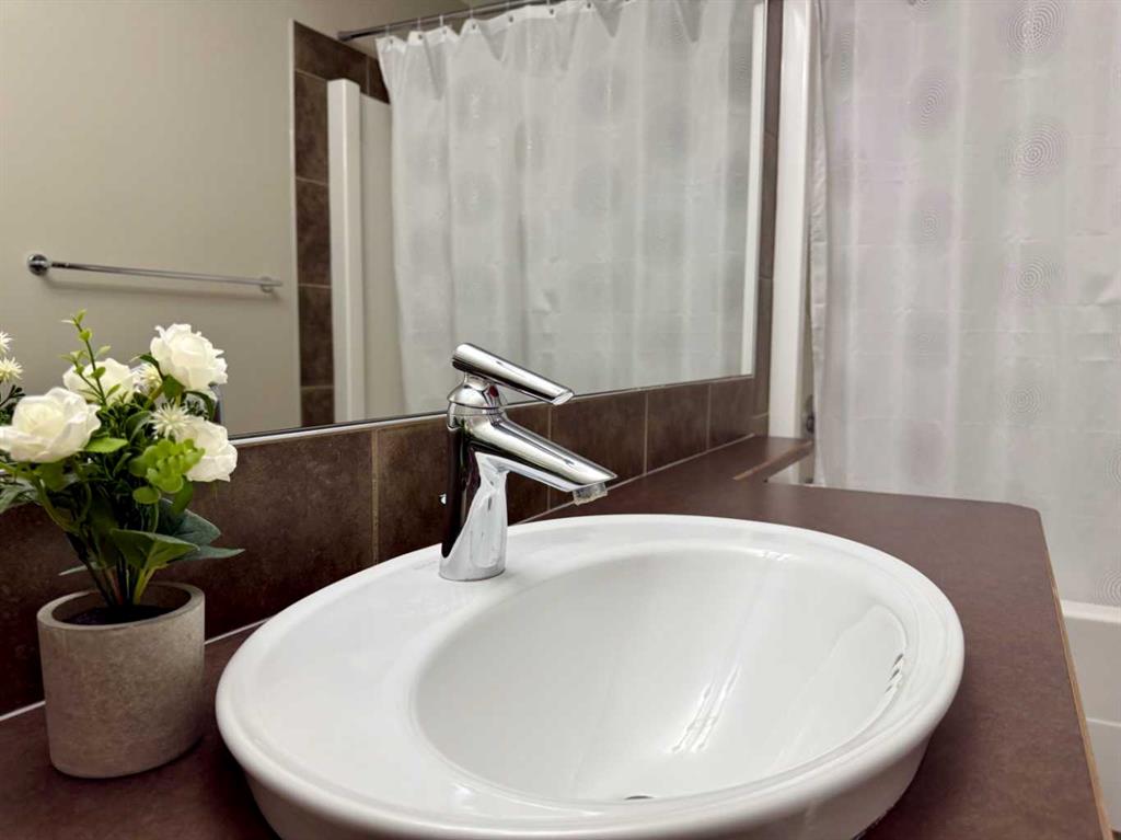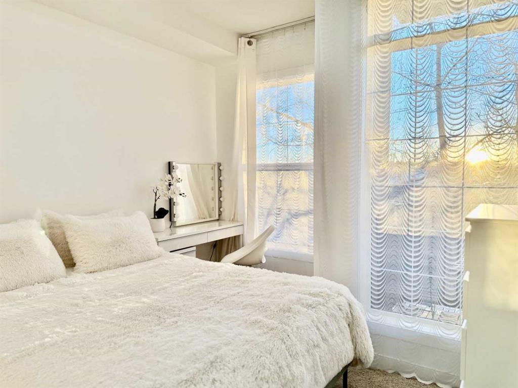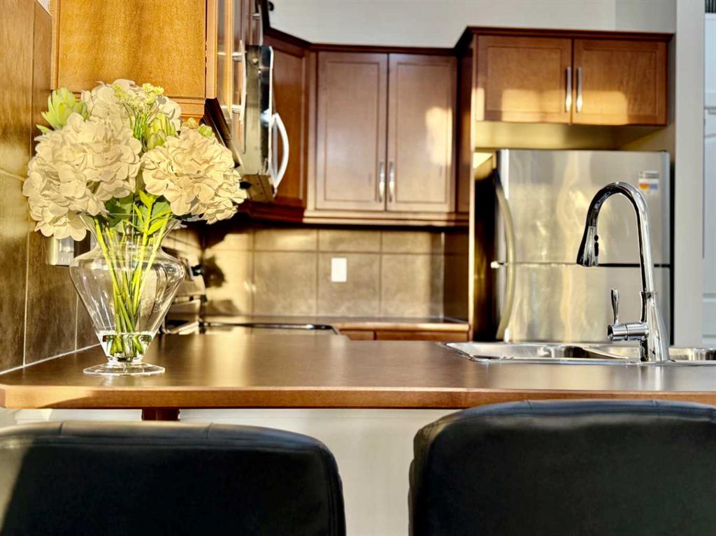 Welcome to Solea in the desirable community of Midnapore. This one bedroom plus large den unit is located on the second floor of a quiet, well-maintained building just a short walk from Fish Creek Park. The building offers peace of mind with recent security upgrades including a keyless access system, a secure bike room, and an accessible ramp at the front entrance. Built in 2008, Solea features in-floor heating throughout each unit, allowing for flexible furniture placement and a more comfortable, energy-efficient living space. Inside the unit, you’ll find a functional layout with 9-foot ceilings and west-facing windows that bring in beautiful natural light, especially in the evenings. The kitchen is finished with stainless steel appliances, natural wood-look cabinetry, and a convenient breakfast bar that opens onto the main living space. The spacious den is a versatile area—perfect for a home office, guest room, or extra storage depending on your needs. The living area opens onto a private balcony with a gas hookup for your barbecue, and mature trees in front of the unit provide additional privacy and a natural view. This unit includes in-suite laundry and comes with a titled, heated underground parking stall. There is also secure underground visitor parking available for your guests. Monthly condo fees include heat, water, and sewer, and the building is professionally managed with a healthy operating and reserve fund. Pets are welcome with board approval. One of the standout features of this property is access to beautiful Lake Midnapore, which is included in the condo fees. Residents can enjoy year-round activities such as swimming, fishing, tennis, and skating. The location is unbeatable—within walking distance to the LRT, shopping, restaurants, and daily amenities, and offering quick access to major roads for an easy commute. This is a well-cared-for unit in a secure and peaceful building, ideal for first-time buyers, downsizers, or anyone looking for a low-maintenance lifestyle in a great location. Don’t miss your chance to live close to nature with all the convenience of city living.