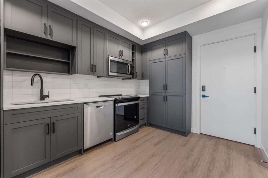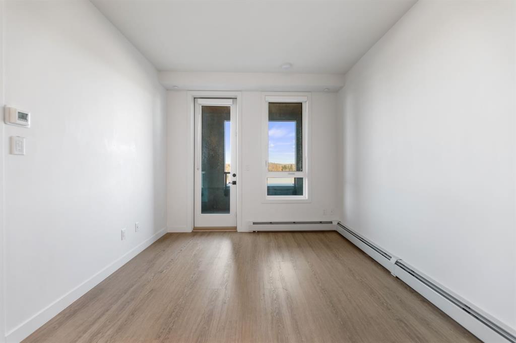 This bright and modern 1 bedroom 1 bathroom condo is located in the heart of Calgary’s University District. It features an open layout with 9’ ceilings, vinyl plank flooring, quartz countertops, stainless steel appliances and a spacious in-suite laundry area. The kitchen has beautiful shaker-style cabinets with soft-close drawers while the bathroom offers a glass-enclosed shower with a built-in bench. The bedroom includes a walk-in closet and the private balcony is perfect for relaxing or BBQs with a gas line already hooked up. You’ll also find great extra touches like AC rough-in, roller shades and sleek LED lighting throughout.