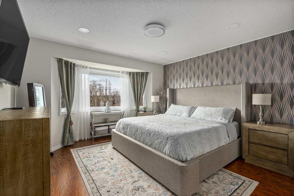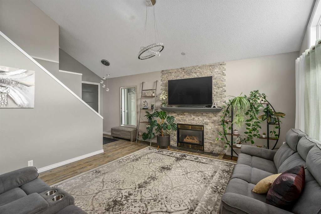 featuring a large composite deck with a gazebo, leading to a custom stamped concrete keyhole fireplace area perfect for entertaining or private relaxation. This property offers nearly 2,300 sq ft of fully developed living space, including a fully finished basement with a bedroom and ensuite. Inside, you’ll find a fully renovated kitchen that elevates the entire home. The living room welcomes you with a soaring vaulted ceiling and large windows, filling the space with natural light and creating an open, airy feel, anchored by a striking stone-faced fireplace feature wall. The dining area overlooks the expansive backyard, featuring a mature apple tree, beautifully maintained flower beds and raspberry bushes creating a peaceful and scenic setting.