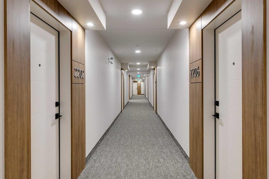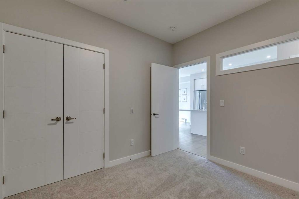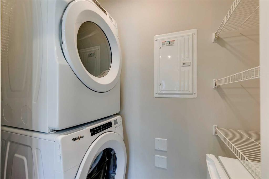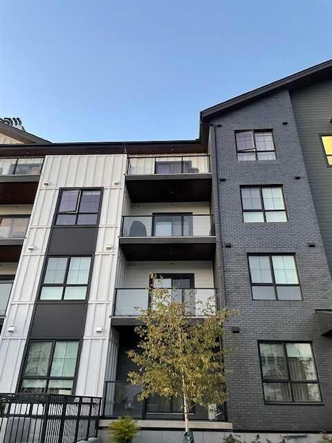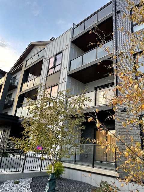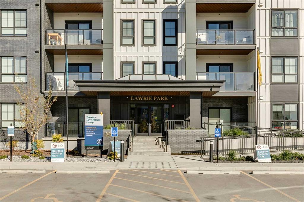 Welcome to the Lawrie Park, Okotoks’ newest apartment complex, surrounded by parks, walking paths, and panoramic views. Enjoy the convenience of being within walking distance to D’Arcy Crossing Shopping Centre, as well as easy access to Calgary. This development, quality built by Partners Homes, offers a prime location with modern design and finishings. This is an ideal option for first time buyers, retirees, investors and young professionals. Functional floor plan with 2 bedroom, 2 bath unit has a sunny south exposure from the spacious private balcony (with gas barbeque hook-up). This second floor unit features an open floor plan with high ceilings, large windows, and bright interior colors. Upgrades include air conditioning, barn door, custom window coverings and more. The bright kitchen features white cabinets, quartz counters, and massive center island with huge dining/breakfast bar area. The adjoining living room offers an abundance of space for furnishings with patio door to enjoy the mountain, courtyard and park views. The master bedroom is a good size featuring a 4-piece ensuite. The second bedroom would also be ideal for a home office or flex room. There is a main 4-piece bathroom and convenient in-suite laundry. Titled heated underground parking and assigned storage locker. This is a pet friendly complex. Enjoy a relaxing stress-free lifestyle in this outstanding Lawrie Park condo. Immediate possession. Just move in and enjoy!