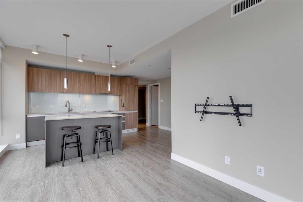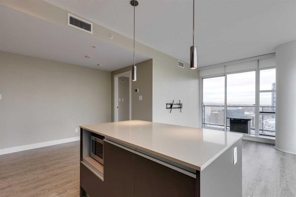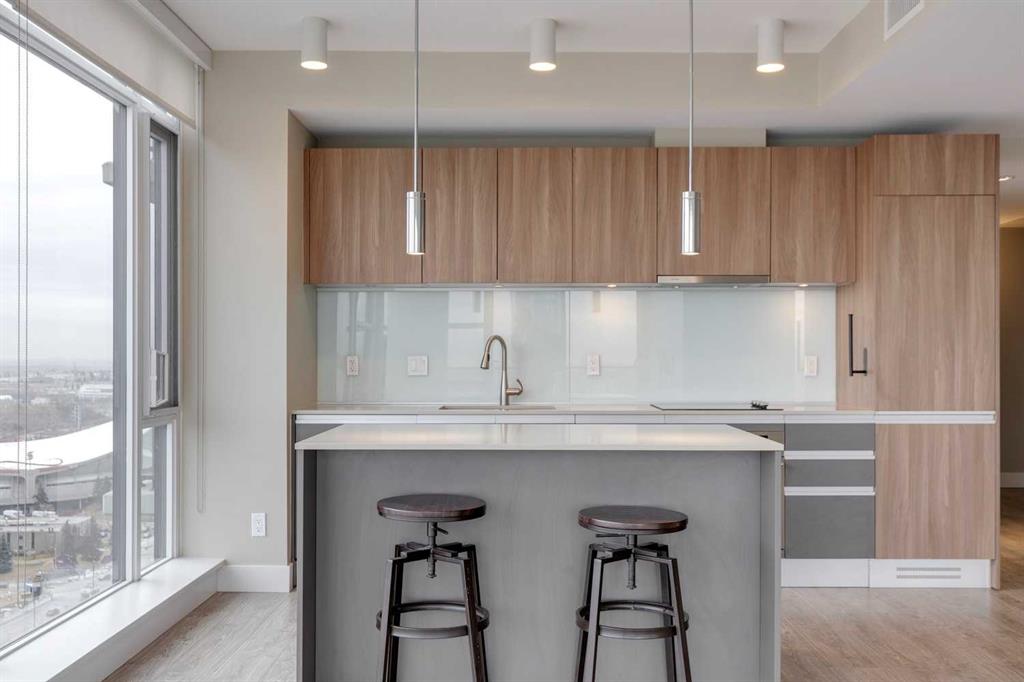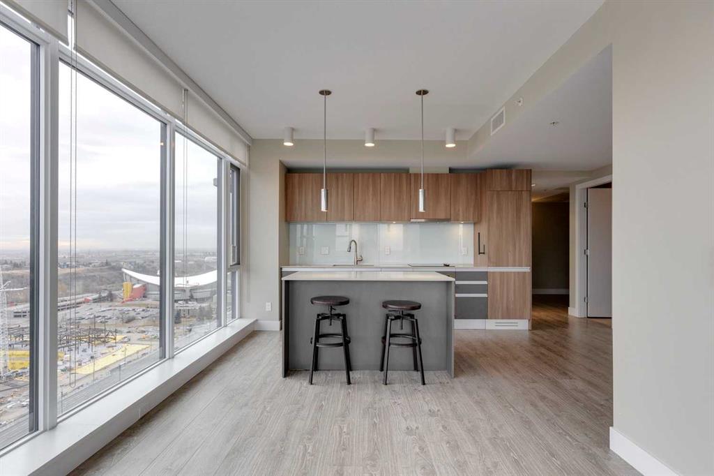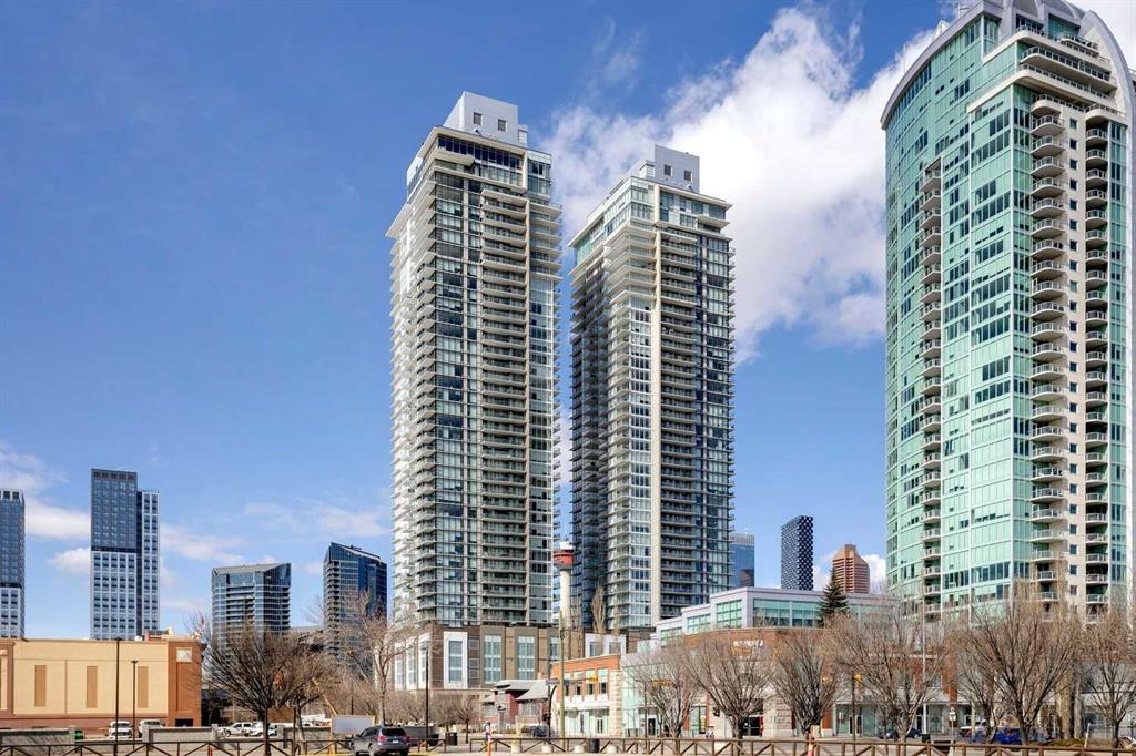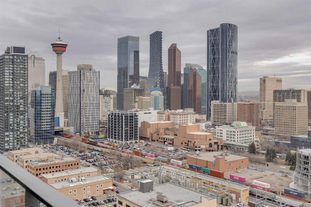 Welcome to The Guardian – Where Contemporary Design Meets Urban Sophistication. Perched on the 22nd floor and occupying the coveted northeast corner, this 2-bedroom, 2-bath residence offers panoramic views of downtown Calgary and the vibrant city skyline. Step inside to discover a sleek, European-inspired kitchen featuring integrated appliances, smooth-panel cabinetry, under-cabinet lighting, and a stylish central island that seamlessly connects to the open-concept living area. Expansive floor-to-ceiling windows flood the space with natural light, creating an airy, modern atmosphere ideal for both relaxing and entertaining. Both bedrooms are generously sized, including a primary suite with a 4-piece ensuite featuring a tub-shower combo. The second bedroom is served by a contemporary 3-piece bathroom with a walk-in glass shower. Additional highlights include in-suite laundry, a spacious balcony perfect for morning coffee or evening sunsets, titled underground parking, and assigned storage. As a resident of The Guardian, you’ll enjoy access to exceptional amenities: a fully equipped fitness centre, yoga studio, resident lounge, games and social rooms, workshop, garden terrace, secure bike storage, and 24-hour concierge service for ultimate convenience and peace of mind. Ideally located just steps from the Saddledome, East Village, Central Library, Stampede Park, and Calgary’s best dining, shopping, and entertainment — this is urban living at its finest. Book your private showing today and experience life at The Guardian.