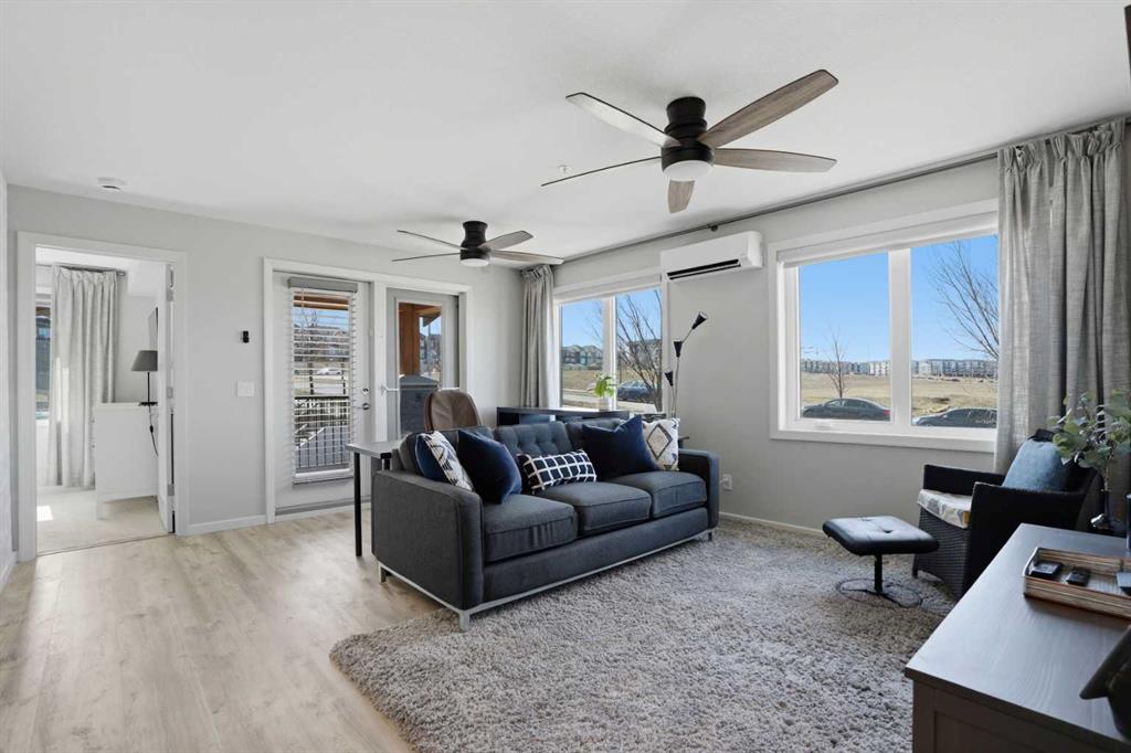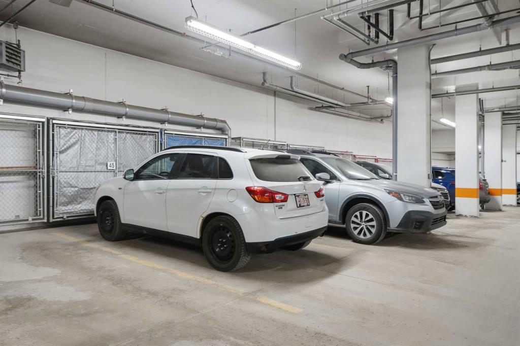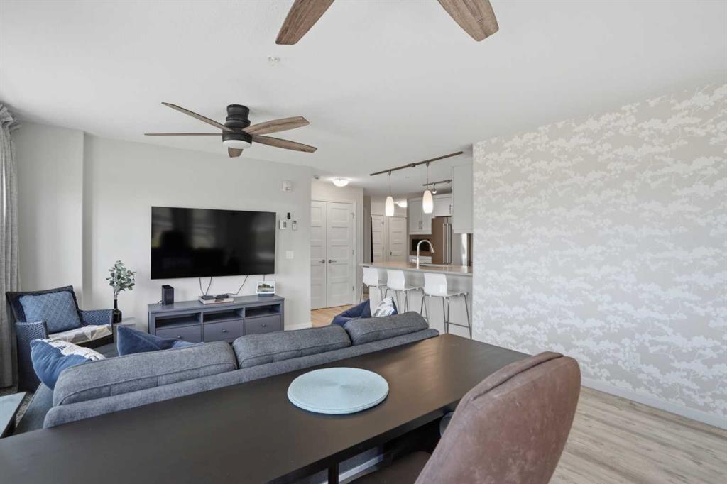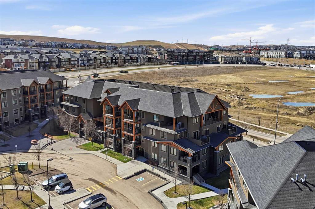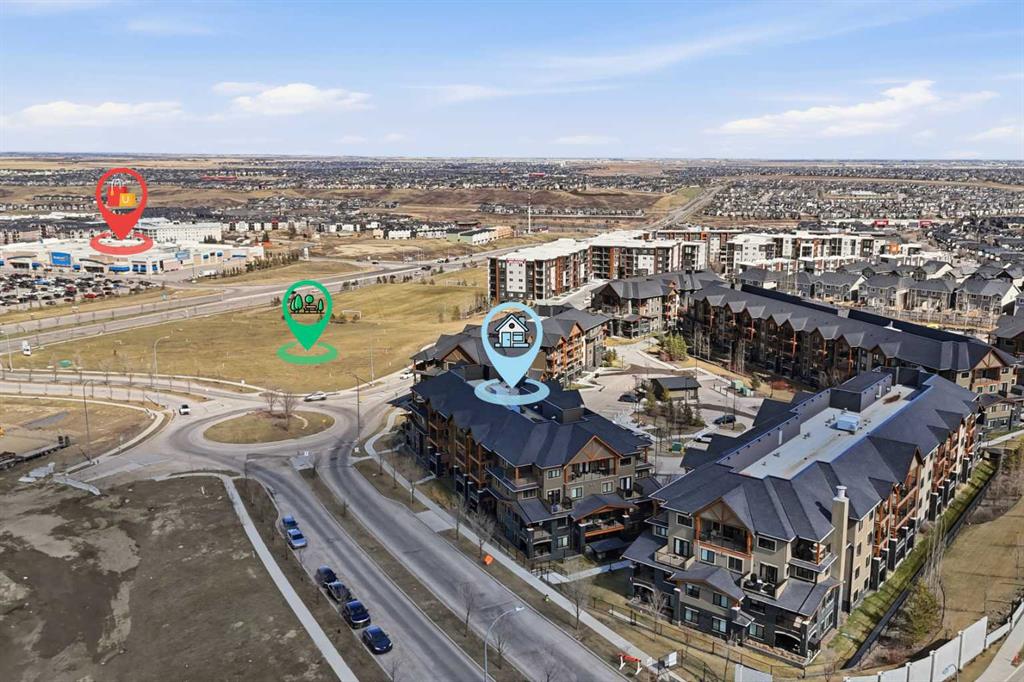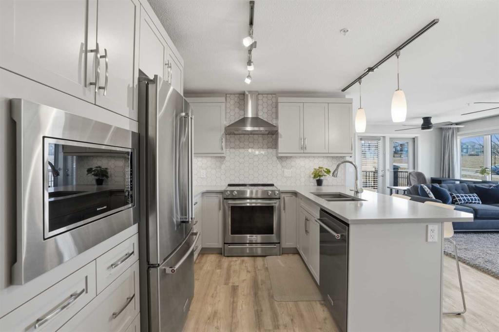 Welcome to this bright and cheerful 2-bedroom, 2-bathroom corner unit condo in the sought-after Pinnacle at Kincora, the quiet, friendly 18+ building in one of NW Calgary’s most desirable communities. This spacious and well-designed floor plan features bedrooms on opposite sides of the unit, offering added privacy, along with two full bathrooms. Formerly the show suite during the development’s sales phase, this home is loaded with upgrades throughout. Highlights include a KitchenAid stainless steel appliance package, a built-in microwave, kitchen cabinetry upgraded with multiple pull-out pot-and-pan drawers, a chimney-style hood fan, quartz countertops, and luxury vinyl plank flooring in the living area. The unit also features central air conditioning, along with blinds and drapery throughout for added comfort and convenience. A titled underground parking stall is included. The open-concept living space is perfect for both relaxing and entertaining, with direct access to a large patio complete with a BBQ gas line—ideal for enjoying outdoor living. Situated in an excellent location with open views, this home is just minutes from Sage Hill Plaza, offering convenient access to major retailers such as Walmart, T&T Supermarket, and a variety of shops, restaurants and services. Schools and other amenities are also nearby. This beautifully upgraded unit is move-in ready and offers exceptional value in Kincora NW Calgary.