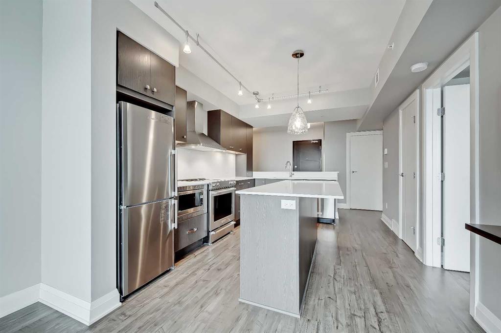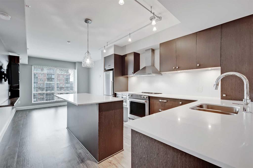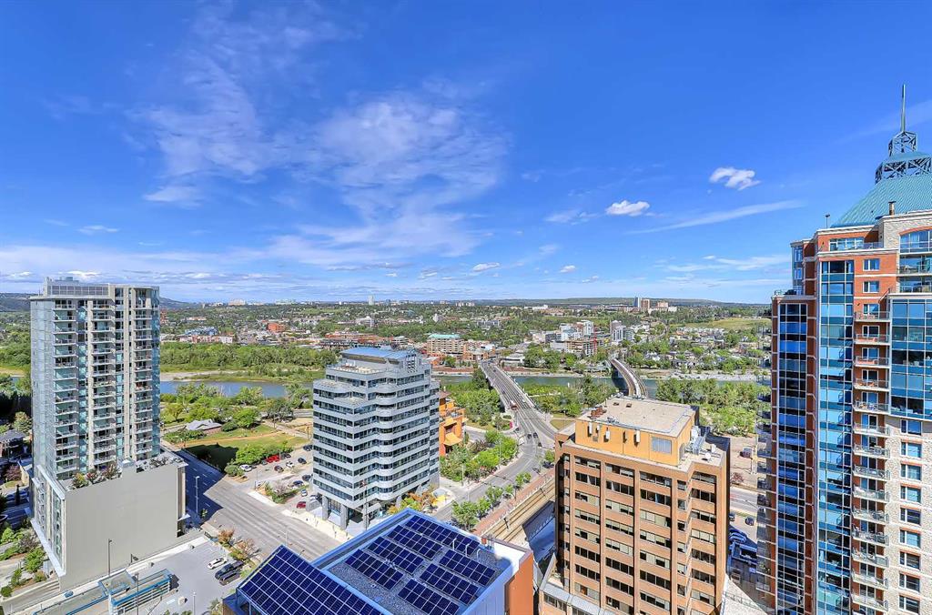 **Multiple Units & Floorplans Available – VISIT MULTIMEDIA LINK FOR FULL DETAILS!** This bright NORTH-facing 1-bed + den unit in upscale VOGUE w/ stunning PANORAMIC RIVER VIEWS from the 22nd floor and UNDERGROUND PARKING in upscale Vogue is a must-see! There are only 4 upgraded floors in the Vogue building which were specially customized for Bedouin Suites, and this is one of them! EXCLUSIVE BEDOUIN FEATURES include upgraded hallways and common areas, as well as INCREDIBLE UNIT UPGRADES like custom kitchen islands with bar seating, upgraded appliances & lighting including dimmers throughout, custom bedroom panelling including built-in side tables with convenience plugs, upgraded bathrooms with tile wainscoting and glass shower doors, built-in closets throughout, built-in walnut entertainment units, a Smart Sensor energy management system for the eco-minded buyer and MORE! This customized ‘VARSITY’ floorplan also had a kitchen wall removed for improved flow and natural light, and WOW, does it look good! This condo presents modern living at its finest, including an open-concept floor plan filled with natural light through ample floor-to-ceiling windows complimented by luxury vinyl plank flooring adorning the main living spaces. The modern kitchen boasts woodgrain cabinets w/ modern hardware & under cabinet lighting, a specially-designed central island with quartz counters, tile backsplash, dual basin undermount sink, & upgraded s/s appliances including a chimney-style hood fan. The open main living area features a built-in walnut entertainment unit with a wall-mount TV included & access to a large balcony w/ gas line for a BBQ & panoramic views of the Bow River. The bedroom features custom wall panelling w/ built-in side tables, wall sconce lighting and a convenient receptacle w/ a USB port, plus an included wall-mounted TV. A large walkthrough closet w/ built-in organizers and stacked laundry leads to the 4-pc bathroom complete with occupancy-sensored lights, quartz countertops, tile wainscoting, an undermount sink with modern faucet, tile backsplash, modern vanity with storage, tile floors, and a large tub/shower combo with full height tile and an upgraded glass door. Complete w/ a sizeable den, a perfect home office or flex space, a titled indoor parking stall in the heated parkade and a storage locker. VOGUE is a high-end building w/ a ton of amenities, including central A/C, an elegant formal lobby, full-time concierge, gym, billiards, large party room w/ kitchen, yoga studio, 36th floor Sky Lounge, & multiple rooftop terraces. Surrounded by parks, transit, the LRT, shopping & more, & within walking distance to the downtown core & all Kensington shops & services – this location offers the best urban lifestyle in the Downtown Commercial Core.