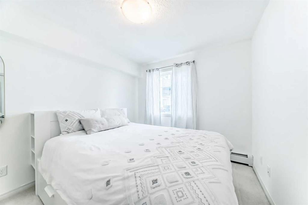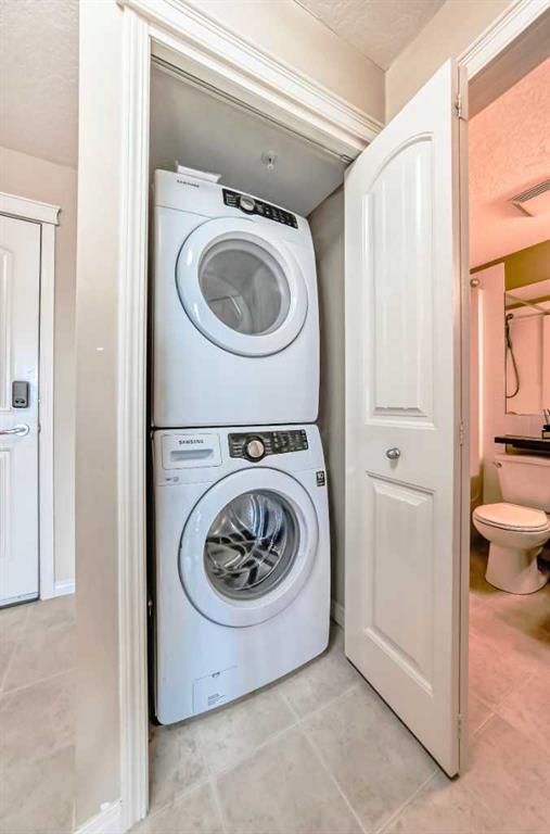 The bedroom connects directly to a walk-in closet and a full 4-piece ensuite — a layout that earns its keep. In-unit laundry, extra storage in the parkade, and one titled surface parking stall round out the practical essentials.