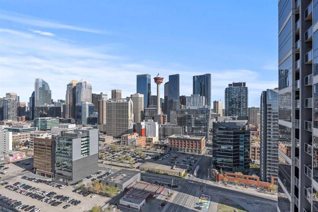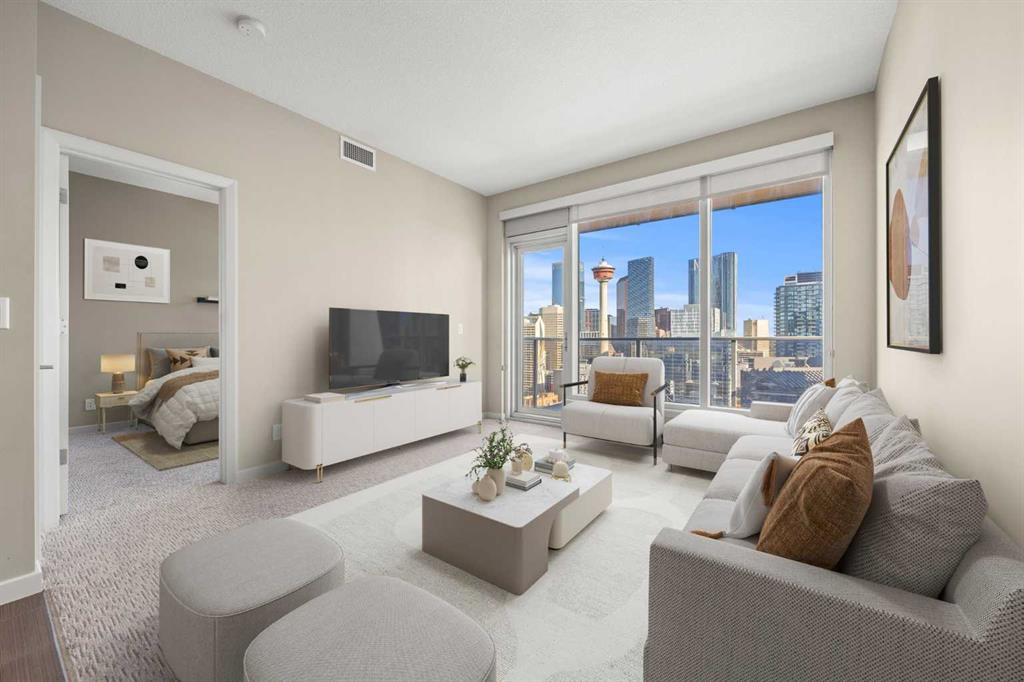 Experience downtown living at its finest in this beautifully designed 2 bed, 2 bath condo located in the heart of Calgary’s vibrant core. Offering nearly 800 sq ft of thoughtfully planned space, this unit blends style, comfort, and convenience—perfect for professionals, roommates, or those looking to downsize without compromising on location or function. Step inside to discover a bright and open living area with floor-to-ceiling windows that flood the space with natural light and showcase amazing city views. The modern kitchen is equipped with stainless steel appliances, quartz countertops, and sleek cabinetry, all seamlessly integrated into the open-concept layout that makes entertaining or relaxing feel effortless. Both bedrooms are strategically located on opposite sides of the unit, providing excellent privacy. Each features a walk-through closet and direct access to a full bathroom—ideal for shared living or hosting guests. The spacious primary bedroom includes a private 4-piece ensuite, while the second bedroom connects to the main bathroom, which also offers a secondary entrance from the main living area. Brand new carpets add a fresh, updated feel, complementing the durable tile flooring and bringing warmth to the bedrooms. Comfort is top of mind year-round thanks to central A/C, and in-suite laundry ensures everyday convenience. This well-managed building offers excellent amenities including a fully equipped fitness centre and a sunny outdoor courtyard—perfect for morning coffee or unwinding with friends. You’ll also enjoy a titled underground parking stall and assigned storage for all your gear. Located steps from shops, restaurants, cafes, the river pathways, and transit, this condo offers unbeatable access to the best of downtown Calgary. Whether you’re investing, downsizing, or buying your first home, this move-in-ready unit offers exceptional value and a lifestyle to match. Don’t miss your chance to call this urban retreat your own!