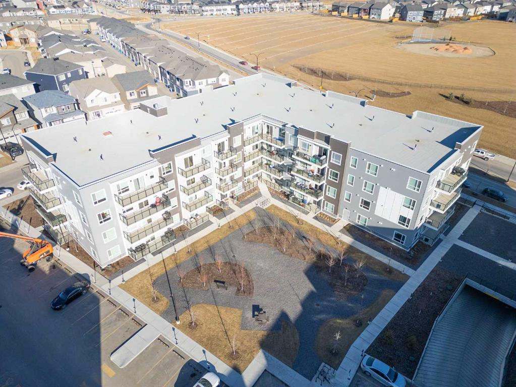 Welcome to this beautifully upgraded 3-bedroom, 2-bathroom Executive residence offering 1181 sqft of thoughtfully designed living in the heart of Carrington. This west-facing unit overlooks the inner courtyard (from your oversized balcony with gas hook up) mirroring as your backyard, providing both privacy and an abundance of natural light. Designed with elevated finishes and exceptional functionality in mind, this home delivers outstanding long-term value for both discerning homeowners and savvy investors. The open-concept layout creates seamless flow between the kitchen, dining, and living areas, anchored by a designer kitchen featuring elevated stone countertops, a full-height tile backsplash, built-in appliances, deeper 14 inch upper cabinets (versus standard 11 inch), soft-close cabinetry, roll-out shelving, under-cabinet lighting, smart drawer storage, a walk-in pantry, and a built-in wine fridge – a combination that enhances both everyday living and rental desirability. The spacious primary suite offers a walk-in closet with built-in organizers and a private 4-piece ensuite complete with dual sinks, additional pillar storage, & a pocket door entry. Two additional bedrooms provide flexibility for family living, guests, or a dedicated home office. Luxury Vinyl Plank flooring, upgraded bedroom carpet, an upgraded lighting package (with the dining room fixture to be replaced with a modern selection), knockdown ceilings, air conditioning, a generous in-suite laundry room with substantial storage, a massive separate storage unit (2 units merged into 1), and extra large sized underground parking with an EV charger just steps from the elevator, further elevate the home. The location is equally compelling, with everyday amenities, dining, shops, and services just steps away, making the property exceptionally walkable and attractive to both owners and tenants. Quick access to Stoney Trail (Highway 201) allows for effortless commuting across the city or out of town as well as 15 minutes to airport. While the growing northwest community of Carrington, surrounded by parks and pathway systems, continues to experience strong demand and long-term growth. This is a highly upgraded, well-positioned property offering design, function, and value in one complete package. Pet friendly complex!