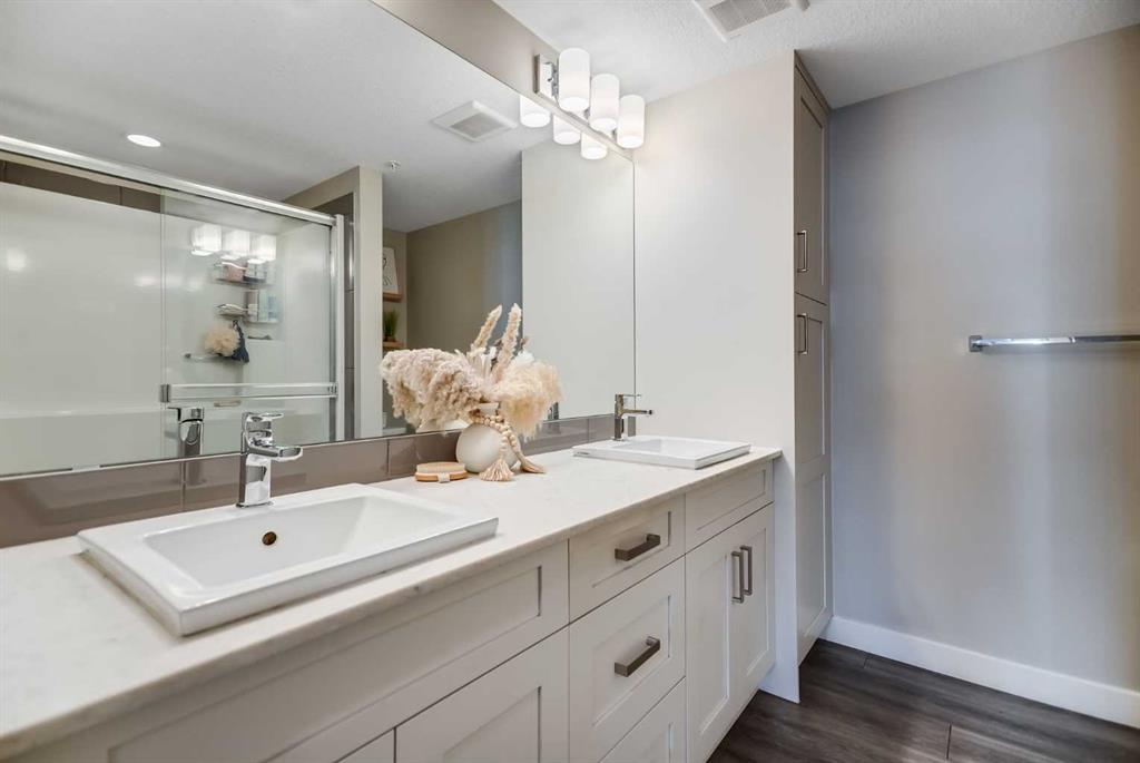 Welcome to Auburn Walk, a thoughtfully designed condo community in one of Calgary’s most loved lake neighbourhoods. This bright and beautifully maintained 2-bedroom, 2-bath home combines modern finishes with a warm, comfortable feel—perfect for those who value both style and everyday practicality. Step inside to a spacious open-concept layout that’s ideal for entertaining or simply enjoying a relaxed evening at home. The kitchen is impressive, featuring crisp white cabinetry, gleaming quartz countertops, stainless steel appliances, a built-in oven and microwave, upgraded range hood, and a generous walk-in pantry. The oversized island offers additional storage, a large double sink, and plenty of space for seating—making it the perfect spot for casual meals or morning coffee.
