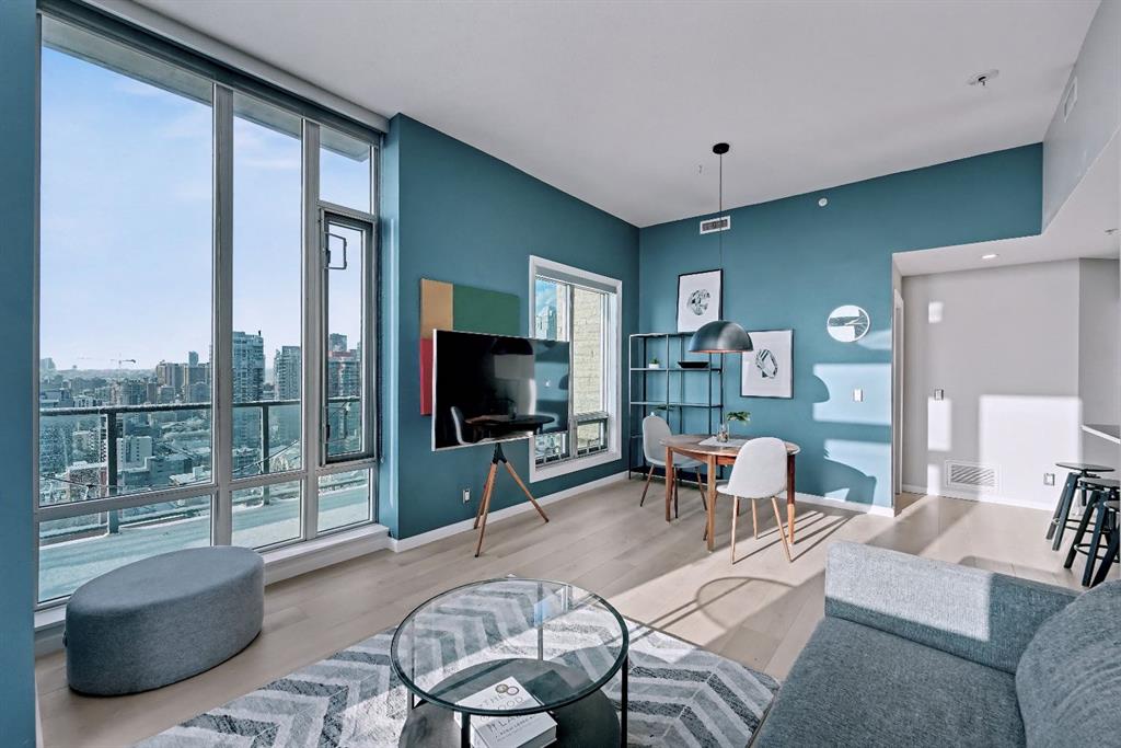 Upgraded 2 bedroom, 2 bathroom condo in the heart of Victoria Park, offering southwest corner 22nd-floor panoramic views of the Stampede Grounds, Elbow River, MOUNTAINS, and downtown. Bright, open-concept layout with OVER 10’ CEILINGS, FLOOR-TO-CEILING WINDOWS filling the space with natural light, updated paint and flooring, and a modern kitchen featuring granite counters, full-height cabinetry, white tile backsplash, and updated stainless steel appliances. Bedrooms on opposite sides include a primary with 4-piece ensuite, plus additional storage for convenience. Enjoy a private patio with GAS BBQ HOOKUP—perfect for outdoor entertaining. In-unit laundry, STORAGE, heated secured UNDERGROUND TITLED PARKING with bike rack, and access to a fitness facility, sauna, hot tub, and social room. Steps to C-Train, shopping, restaurants, and the Scotiabank Saddledome.