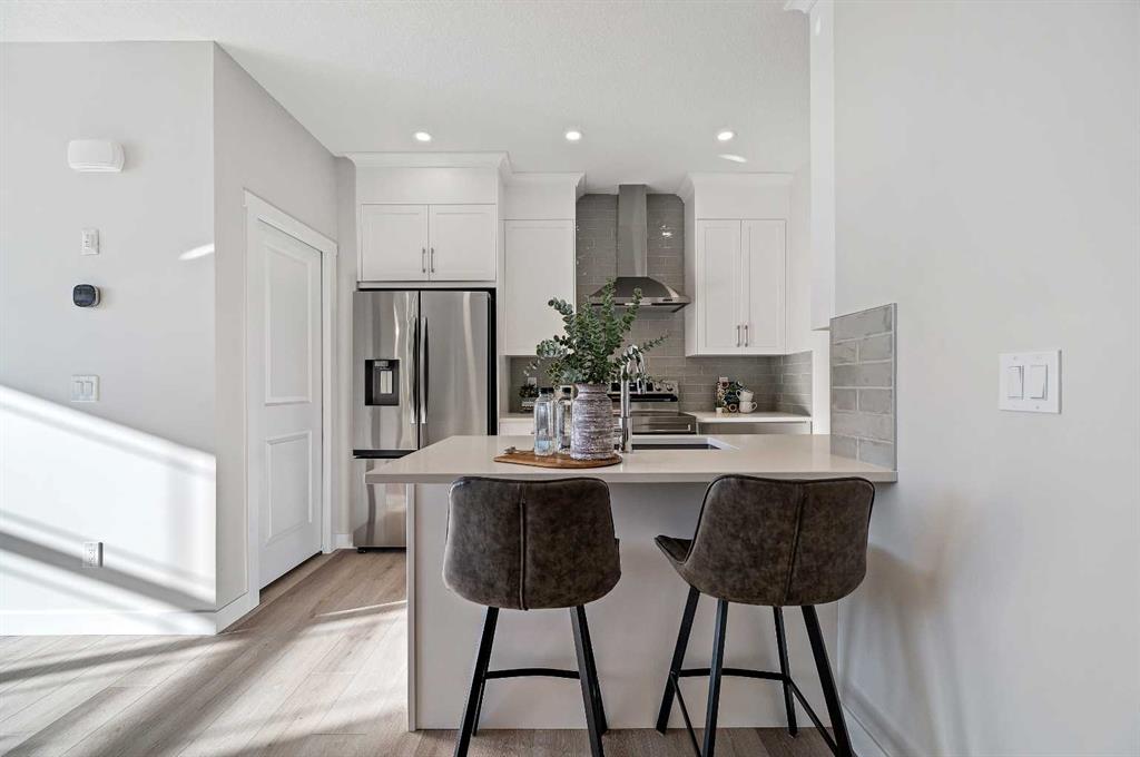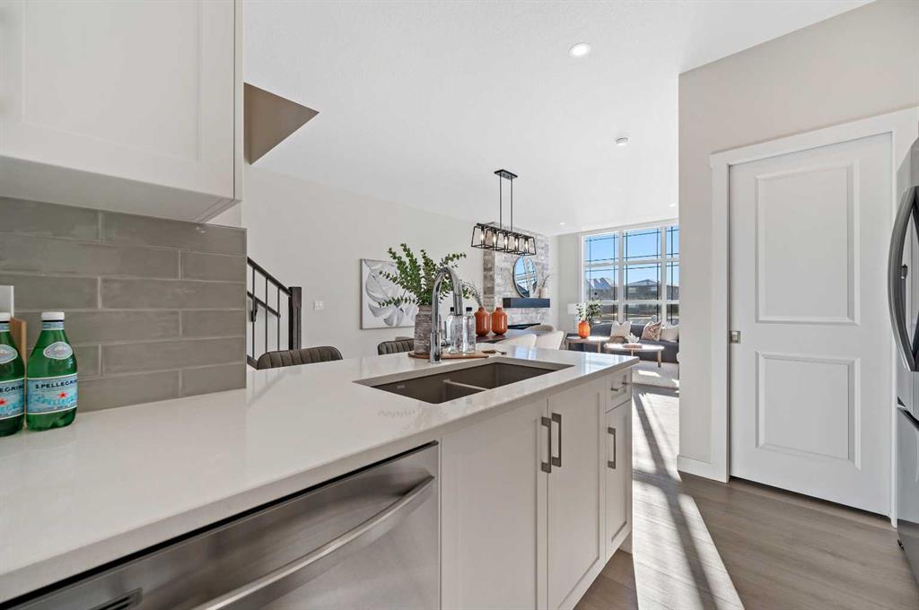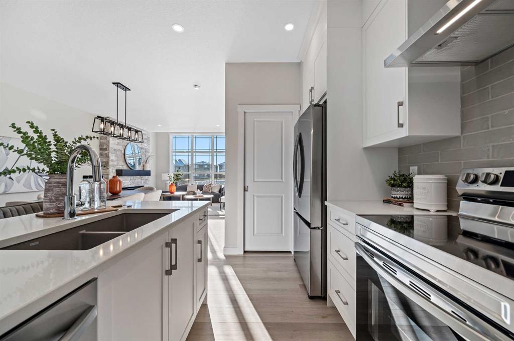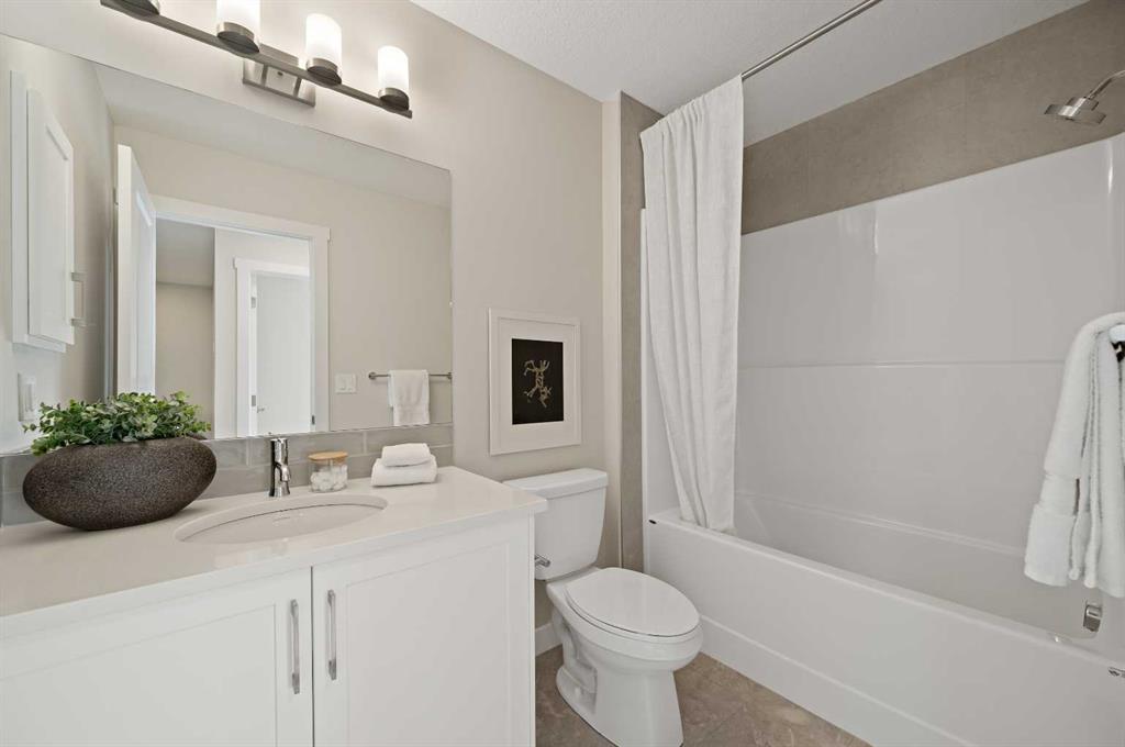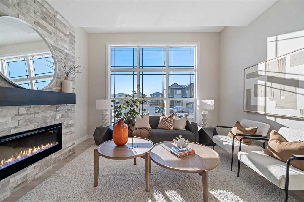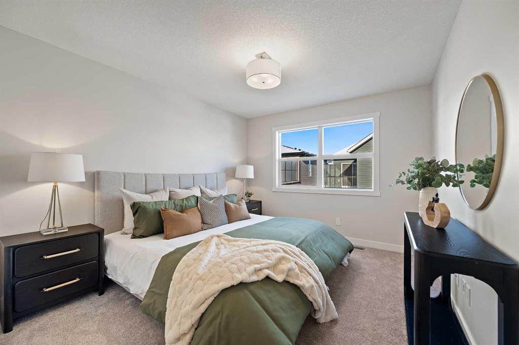 Genesis Builders introduces the Eli – a luxury street-side luxury townhome with NO CONDO FEES! The Eli townhome features an attached double garage and a rooftop patio, offering low-maintenance living. The thoughtfully designed home offers almost 1600 sq ft. plus an unfinished basement with 9-foot ceilings, ready for your ideas. Large windows and soaring ceilings on the main floor let natural light fill the open-concept living space. The chef-inspired kitchen features sleek cabinetry and stone countertops and is well-equipped with stainless-steel appliances. The kitchen is tucked away yet still feels open and inviting, providing ample room for activities in the open-concept dining and living room. A floor-to-ceiling tiled fireplace is the living room’s focal point. Complementing the main floor is a convenient half bath, storage, and access to the attached double garage, which is large enough for a truck. Venturing upstairs, you will find a spacious primary retreat with a spa-like ensuite featuring a shower, his-and-hers sinks, and a walk-in closet. Two additional bedrooms, a full bathroom, a flex room, a 4-piece bathroom, and laundry facilities complete the upper level. Enjoy spending time on your upper rooftop patio, situated above the garage, which is an excellent space for entertaining. Bayview is a beautiful community with parks, benches and pathways that meander throughout the community and along the canals. Kids and adults alike will enjoy the outdoor basketball nets, gym, amphitheatre, and tennis courts, which will convert into a skating rink in the winter. Come and see for yourself all the amenities the community has to offer!
