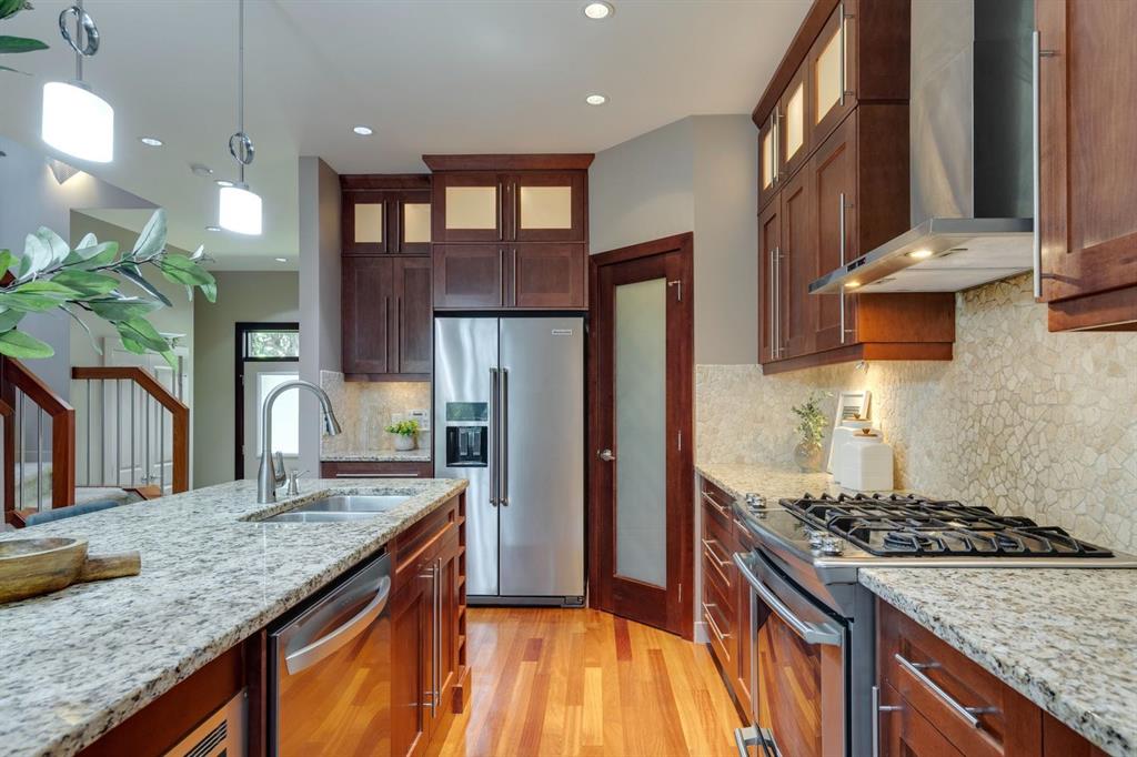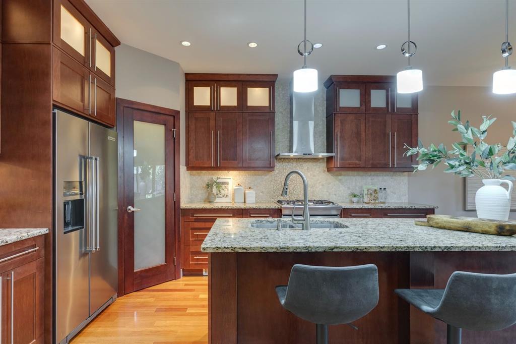 Ideally located on a quiet, tree-lined street in the sought after community of Killarney/Glengarry, this elegant and contemporary home is perfect for growing families seeking comfort, space, and convenience. Just a short walk to the Killarney Aquatic & Recreation Centre, schools, parks, transit, and local amenities, this central location supports an active, connected lifestyle. Boasting exceptional curb appeal, the exterior features a sophisticated blend of stone and stucco, a stone walkway, and mature trees that provide both privacy and charm. Step inside to high ceilings and a tiled entryway that leads to warm hardwood floors throughout the main level. A bright front den, ideal as a home office or study area, overlooks the peaceful street. The open concept main floor is perfect for everyday living and entertaining, with a spacious living and dining area anchored by a cozy corner gas fireplace and large picture window with views of the rear backyard. The kitchen is truly the heart of the home and offers full-height cherry cabinetry, granite countertops, a stone backsplash, a central eat-up island, and a corner pantry for ample storage. It flows seamlessly into the dining area, making it easy to host family meals or casual gatherings. Upstairs, plush carpeting adds comfort, with a well-appointed laundry room, a full bathroom, and three generously sized bedrooms. The private primary retreat is thoughtfully separated from the secondary bedrooms and features a custom walk-in closet, a tranquil balcony shaded by mature trees, and a luxurious 6pc ensuite with heated floors, a jetted soaker tub, and glass enclosed shower with body sprays for a spa-like experience. The fully finished basement extends your living space with a separate family and games area, a 3pc bath, and 2 additional bedrooms making it ideal for teens, guests, or a home gym. Step outside to a beautifully landscaped backyard with a stone patio, raised garden beds, and a detached double garage. It’s the ideal outdoor space for kids to play, summer BBQs, or simply relaxing in your private oasis. With green space just a block away, top rated schools, playgrounds, and restaurants, this is a rare opportunity to own a truly exceptional family home in one of Calgary’s most desirable inner-city neighbourhoods.