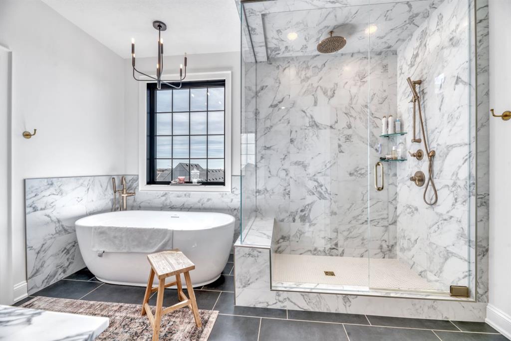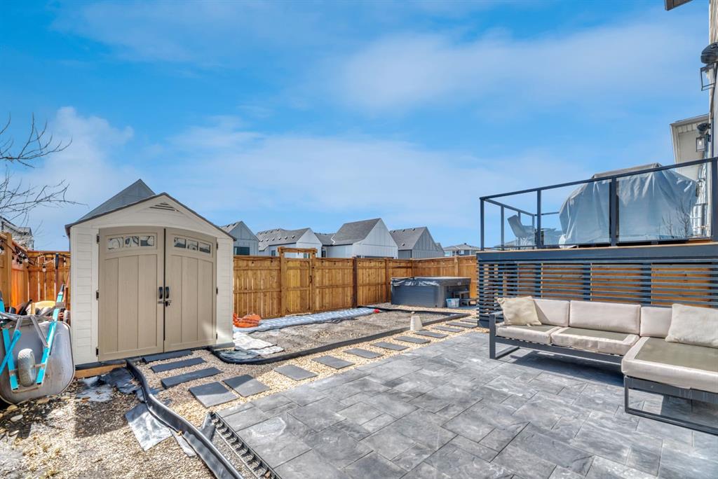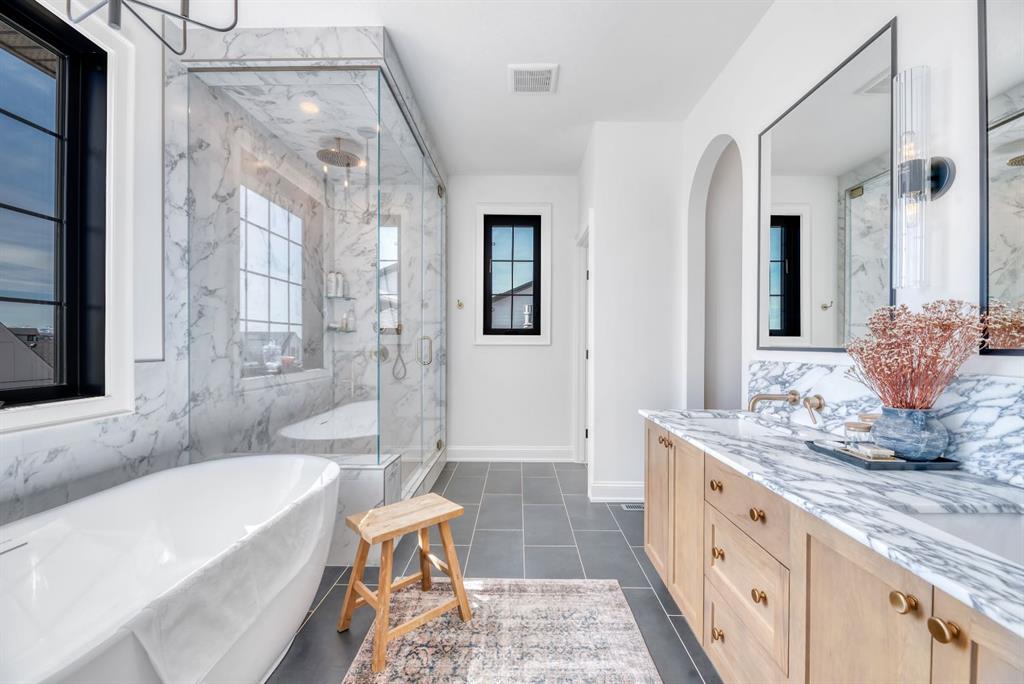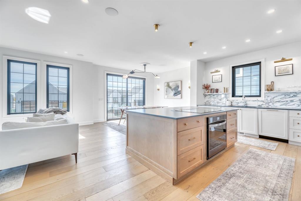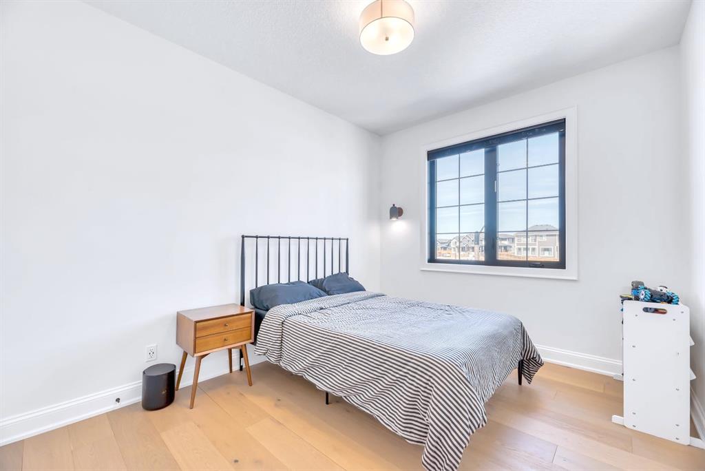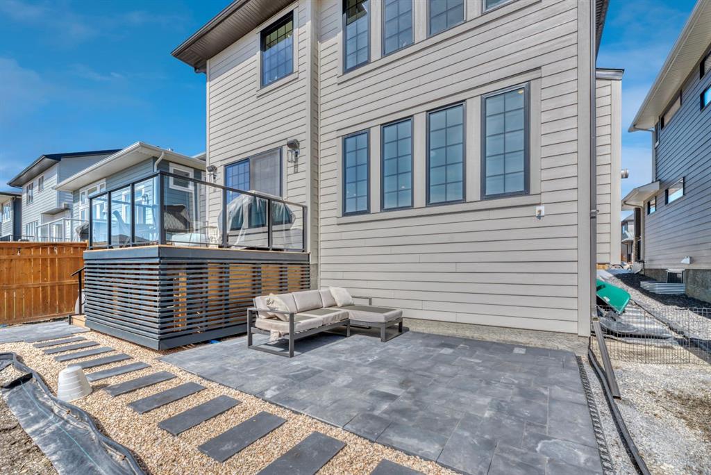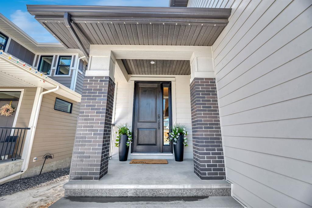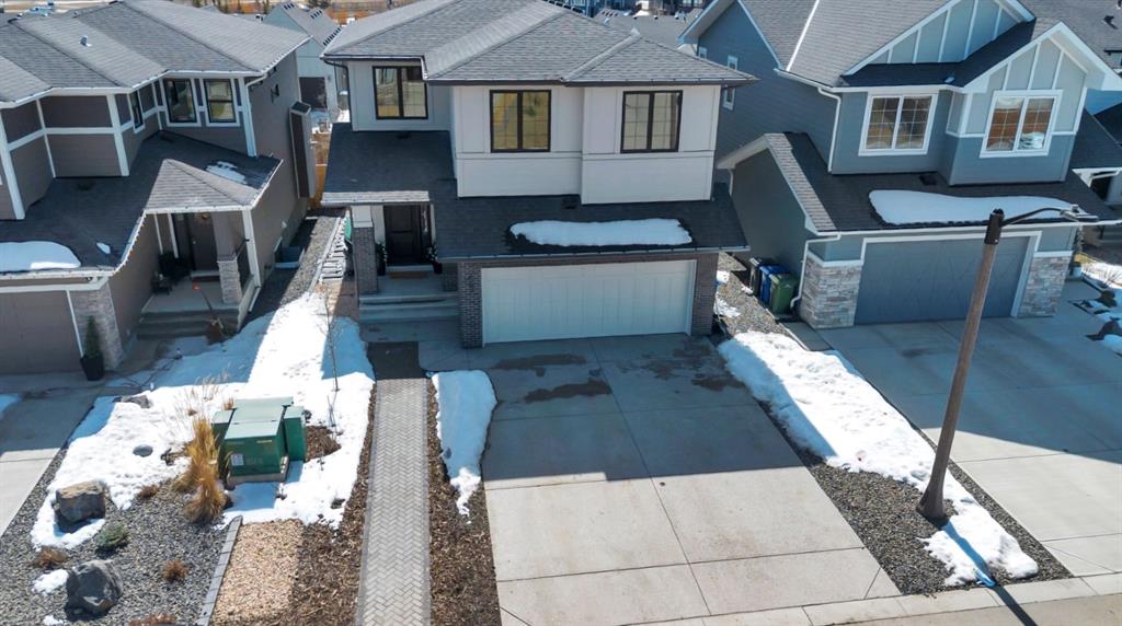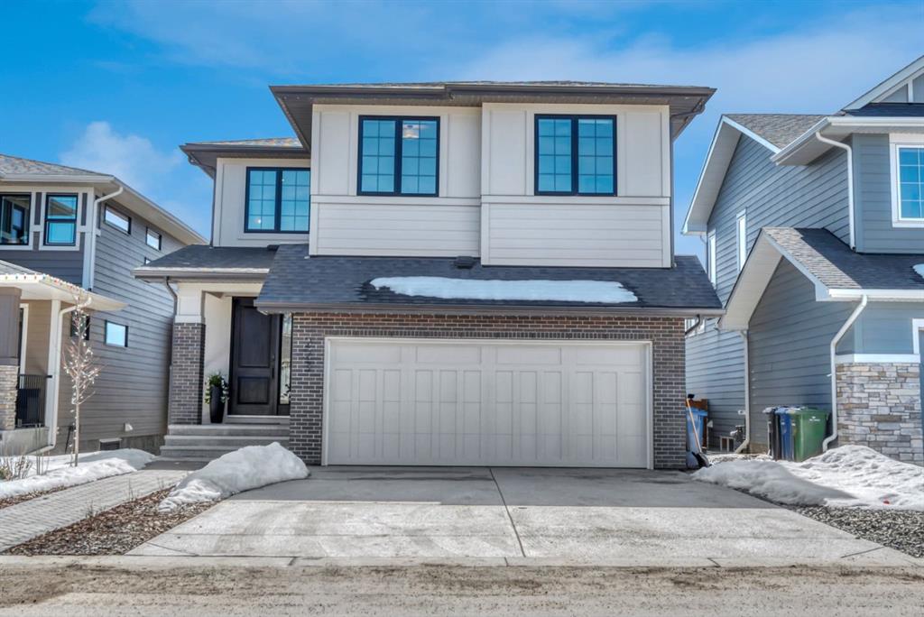 Welcome to an architecturally inspired Organic Modern residence in the award-winning lake community of Harmony—where elevated design meets an unmatched lifestyle just minutes west of Calgary. Enjoy quick access to the city, the renowned Mickelson National Golf Club, and a growing collection of amenities including the lake, beach, pathways, parks, and future village centre—offering a rare blend of recreation, convenience, and community. This modern transitional home offers over 2,700 sq ft of thoughtfully curated living space, combining clean architectural lines with warm, organic finishes. From the moment you arrive, the herringbone brick walkway, soft neutral palette, and striking black-framed windows set the tone for what’s inside. Step into a light-filled interior defined by wide plank natural white oak flooring, soaring ceilings, and custom archways that soften the modern aesthetic and create a sense of flow throughout. The main floor features a stylish front office/den, perfect for working from home, while the open-concept living space is both refined and inviting. At the heart of the home is a stunning designer kitchen that perfectly captures today’s most sought-after style—featuring marble backsplash, marble and honed quartz surfaces, panel-ready appliances, and an induction cooktop with a concealed hood fan. A thoughtfully designed coffee bar and walk-through pantry connect seamlessly to the mudroom, where custom cabinetry and chevron brick flooring elevate everyday function with designer flair. Upstairs, the home continues to impress with 4 spacious bedrooms plus a lofted bonus room with a half-vault ceiling, creating a bright and airy retreat. The primary suite is a true sanctuary, complete with custom drapery and a spa-inspired ensuite featuring floating vanities, wall-mounted faucets, a freestanding soaker tub with bath filler, and a large glass-encased marble shower. The main bathroom is ideal for family living, offering a smart layout with a separate vanity area from the water closet. Every detail has been carefully selected—from champagne bronze hardware and custom lighting to elevated millwork, trim, and finishes throughout—creating a cohesive, high-end aesthetic that feels both modern and timeless. Outdoor living is equally impressive with a composite deck (with storage below), stone patio, and hot tub, plus gas lines to the deck, patio, and garage—perfect for entertaining year-round. Additional features include hot and cold exterior taps, Gemstone permanent soffit lighting, a reverse osmosis system, and a sunshine basement filled with natural light and ready for future development. Sod will be completed as weather permits. Complete with a double attached garage and located in one of the most desirable communities in the Calgary area, this home offers a rare opportunity to own a design-forward, move-in ready property in Harmony. Modern. Warm. Effortlessly elevated.