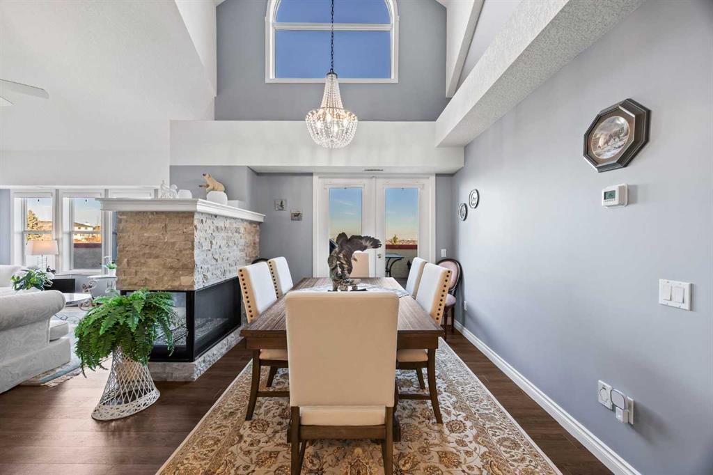 A spacious DINING AREA provides the perfect spot for hosting family and friends and shares a gorgeous modern FIREPLACE with the sun-filled living room — surrounded by wraparound windows that flood the space with natural light.